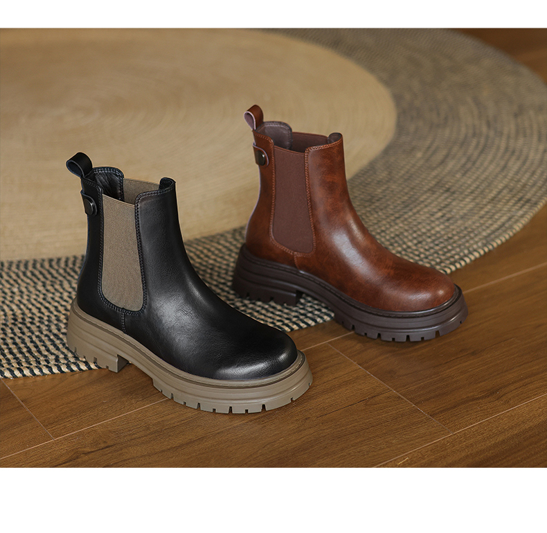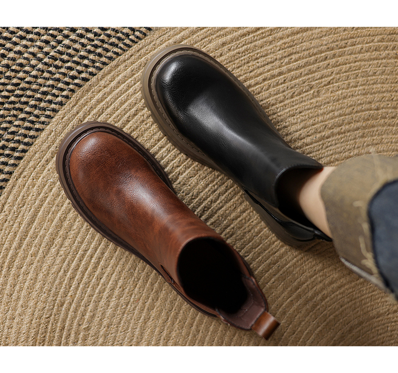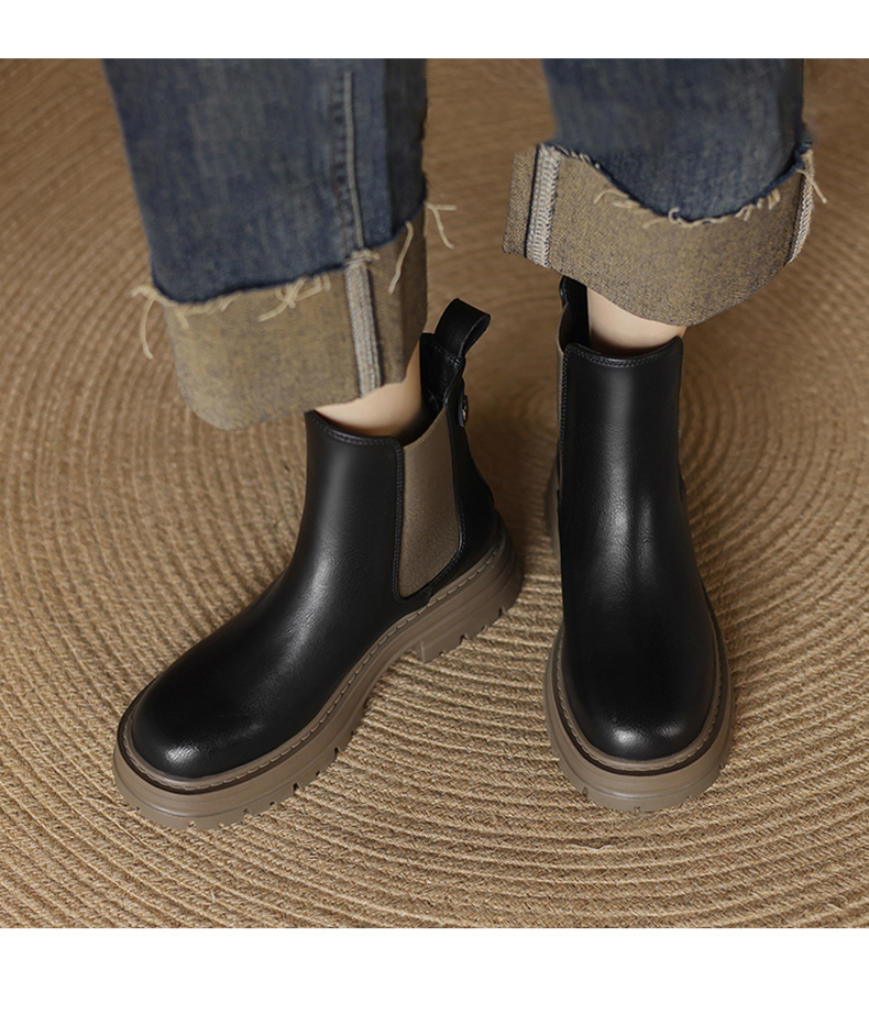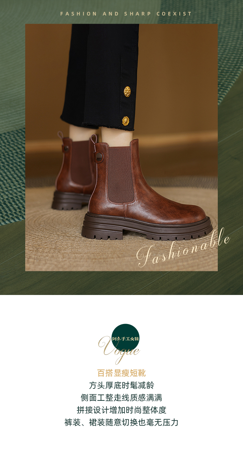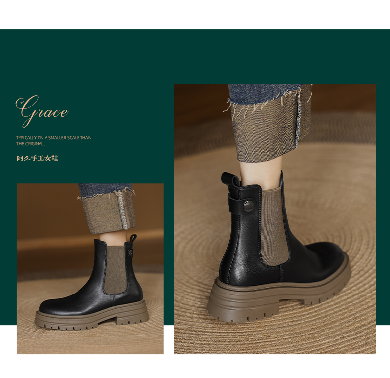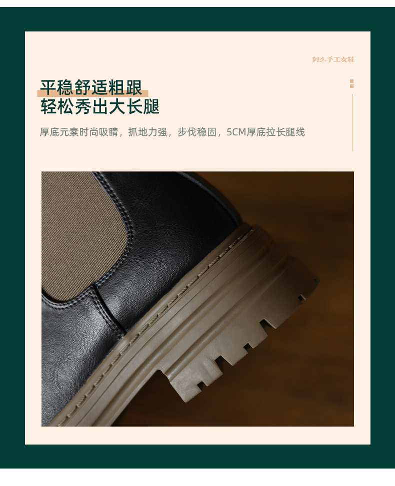 阿么手工女鞋真皮黑色厚底烟筒靴5CM秋冬新款时尚百搭切尔西短靴