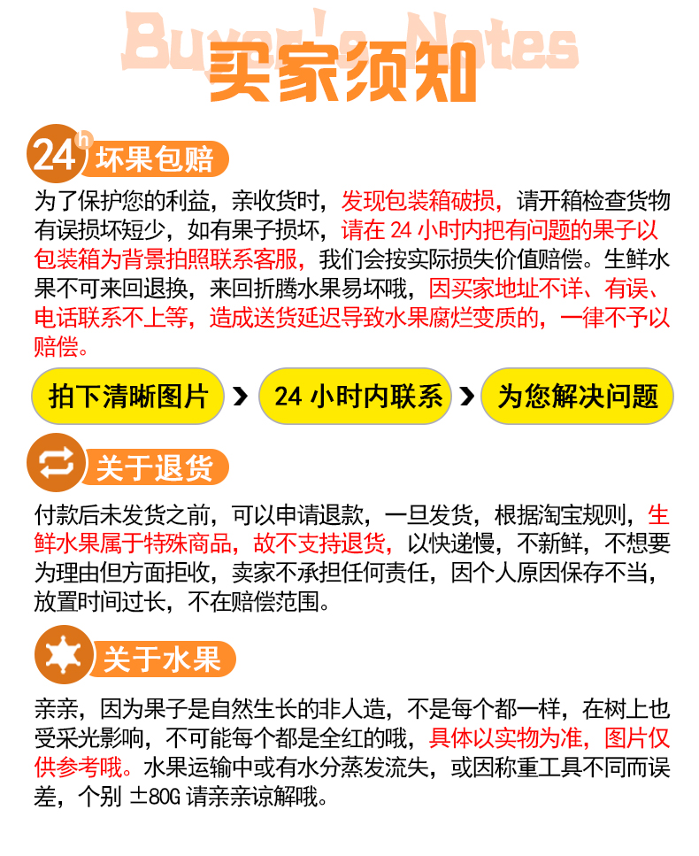 请把坏果和面单一起拍照,拒收不售后,不可以退货,发货后不可更改地址,因电话号码错误导致坏果不售后,收货后24小时内售后