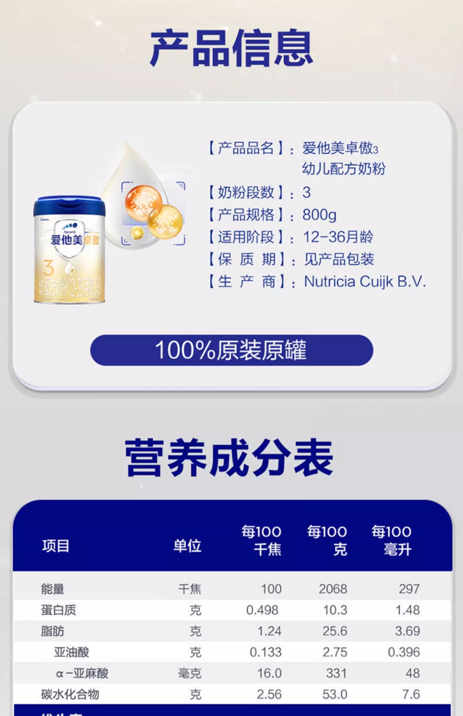 【整箱6罐】爱他美卓傲3段幼儿配方奶粉800g*6/ATM-614011