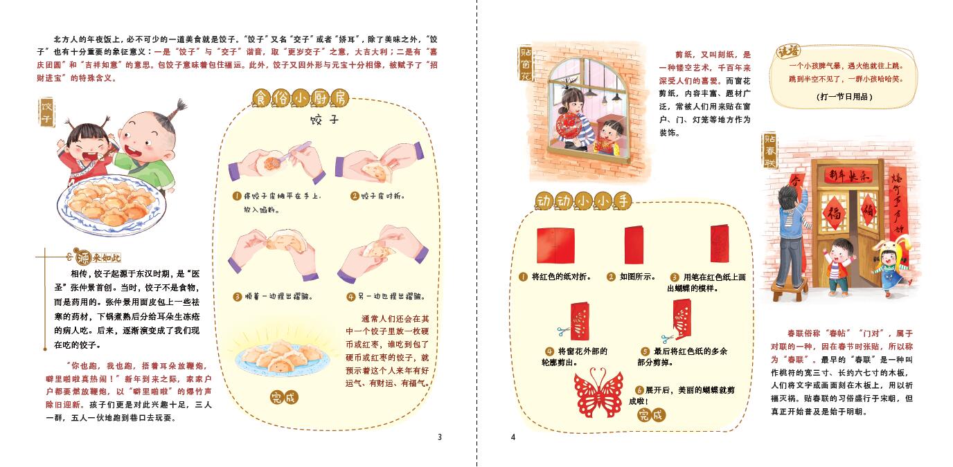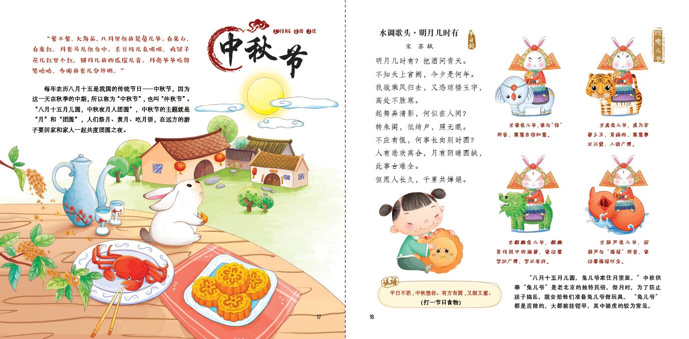 这是一套可以扫码收听语音的绘本故事,全书配图均为高清特色手绘风格,有利于提高孩子审美。书中内容详尽,设置了节日谜语、节日手工、节日习俗、节日故事等栏目。小朋友们可以在轻松阅读中,更轻松的吸收传统文化知识,更深切地理解传统文化。