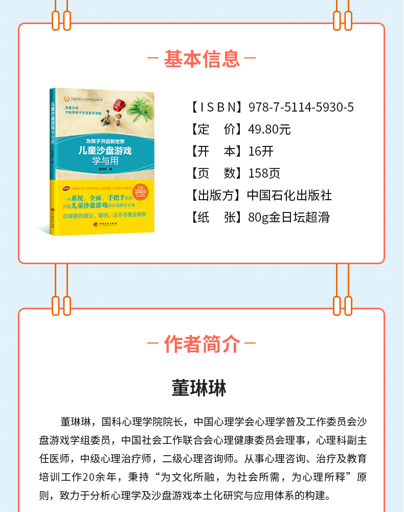 董琳琳,国科心理学院院长,中国心理学会心理学普及工作委员会沙盘游戏学组委员,中国社会工作联合会心理健康委员会理事,心理科副主任医师,中级心理*师,二级心理咨询师。从事心理咨询、*及教育培训工作20余年,秉持“为文化所融,为社会所需,为心理所释”原则,致力于分析心理学及沙盘游戏本土化研究与应用体系的构建。著有《沙盘游戏疗法实操与案例集》《团体沙盘游戏新世界》《儿童沙盘游戏学与用》。