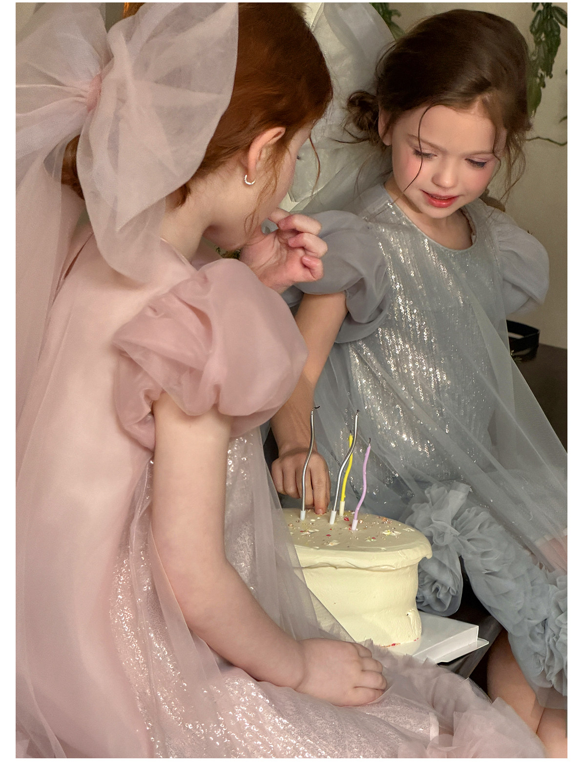 littletime女童泡泡袖亮片网纱连衣裙粉色公主洋气蓬蓬裙生日礼服