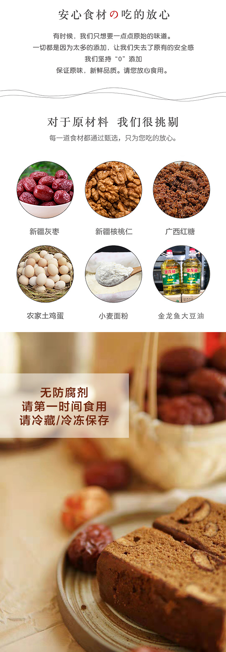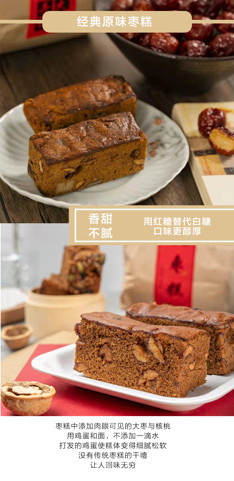 经典原味:小麦粉、鸡蛋、植物油、红糖、红枣、核桃仁