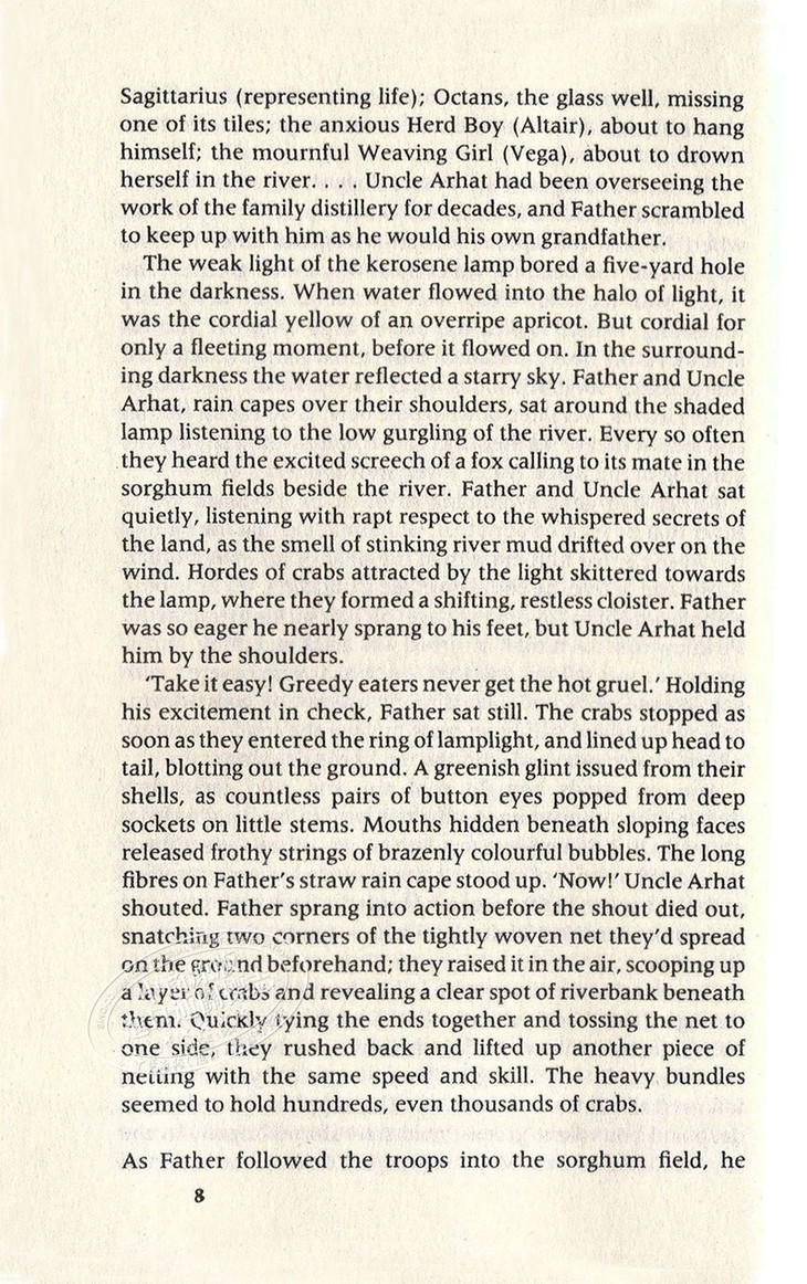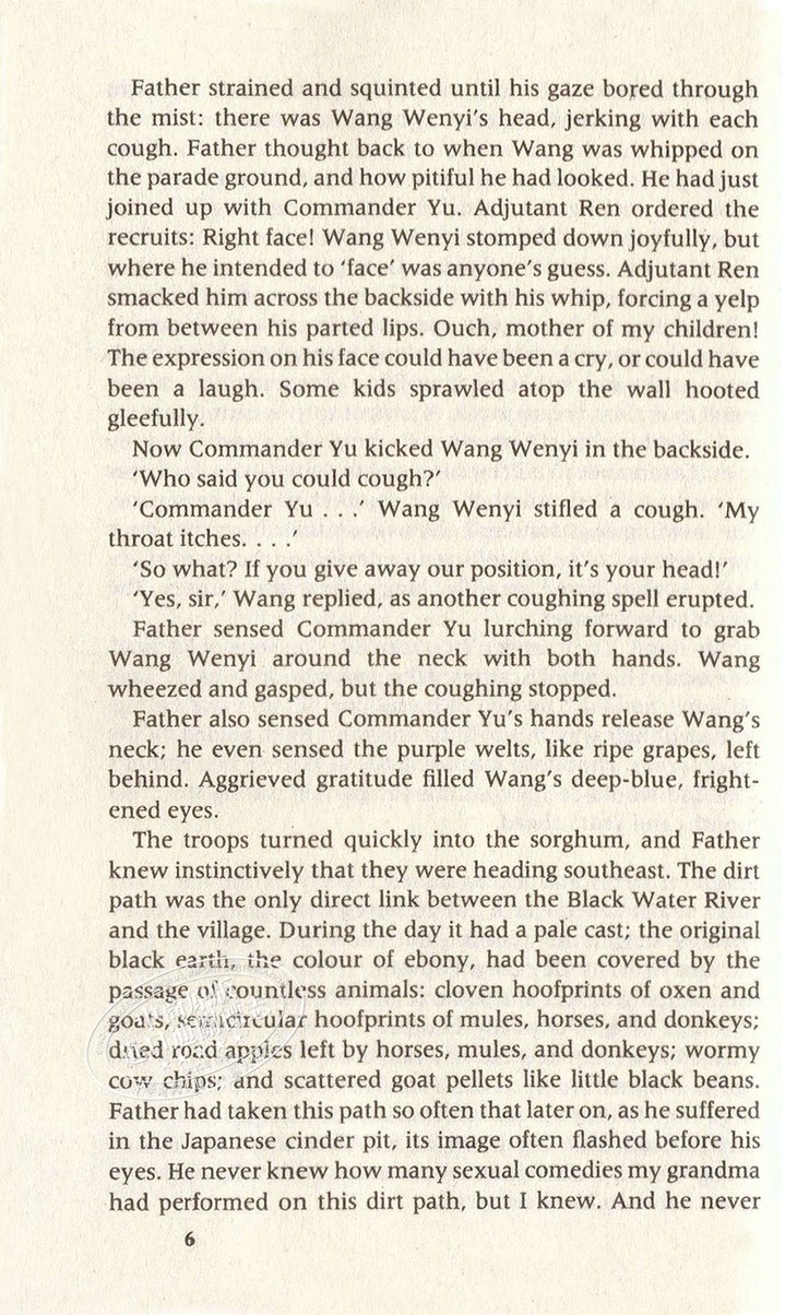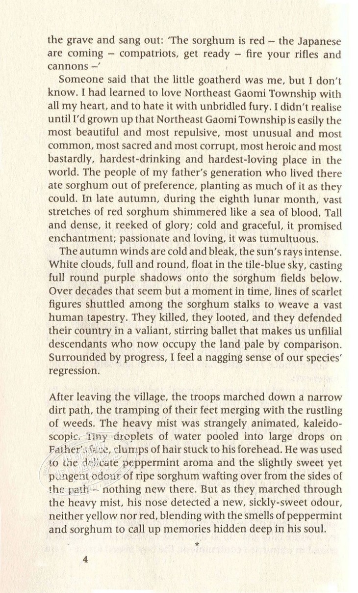 As the novel opens, a group of villagers, led by Commander Yu, the narrator's grandfather, prepare to attack the advancing Japanese. Yu sends his 14-year-old son back home to get food for his men; but as Yu's wife returns through the sorghum fields with the food, the Japanese start firing and she is killed.