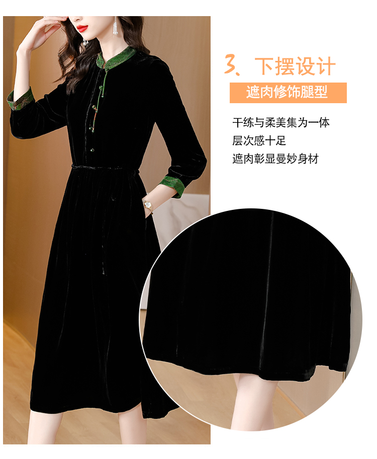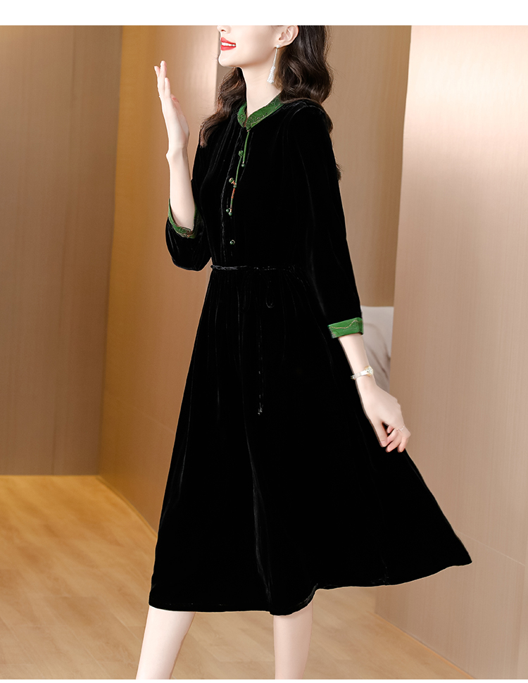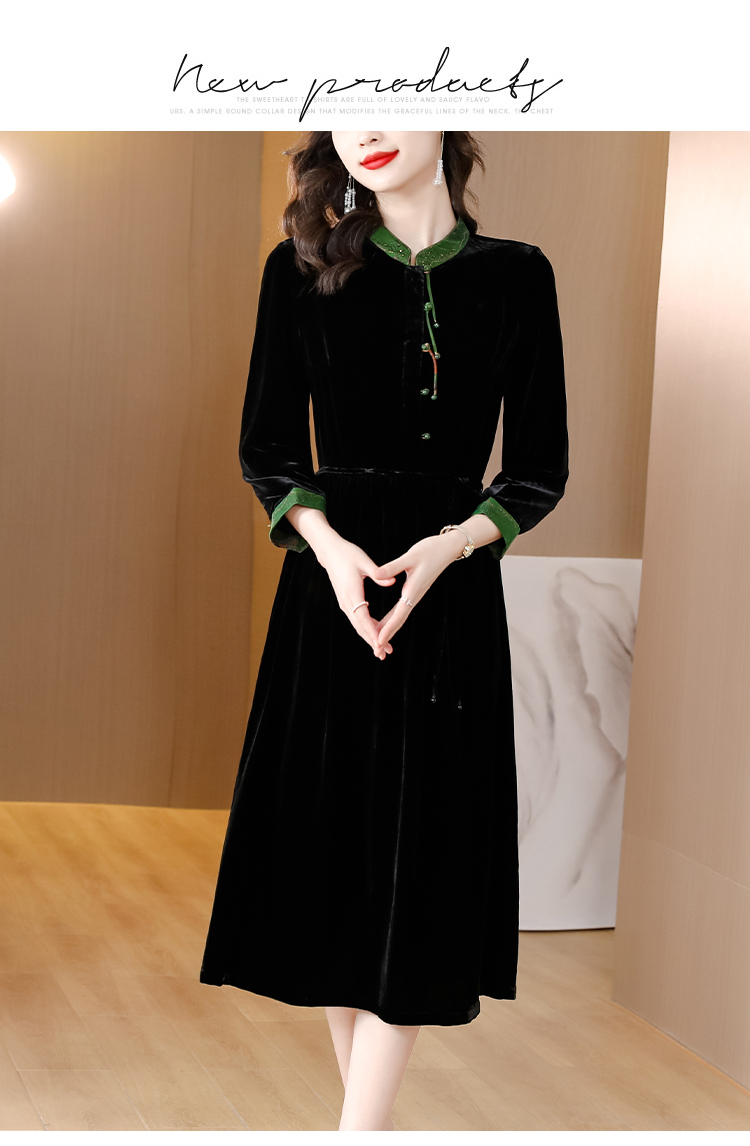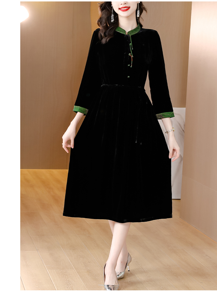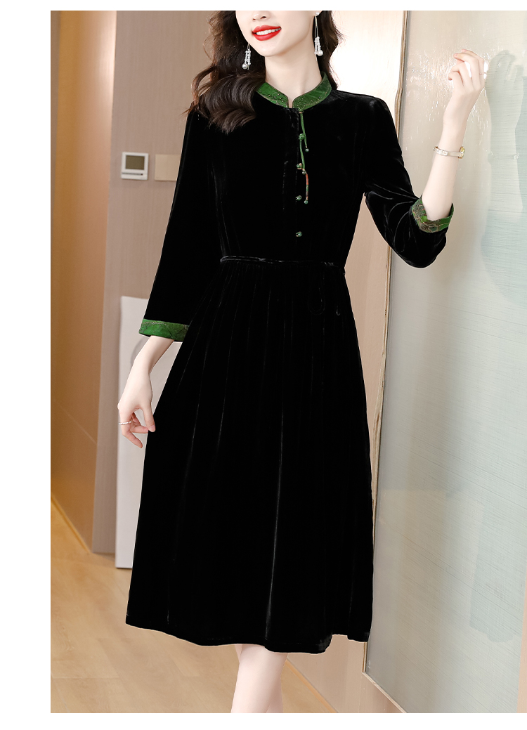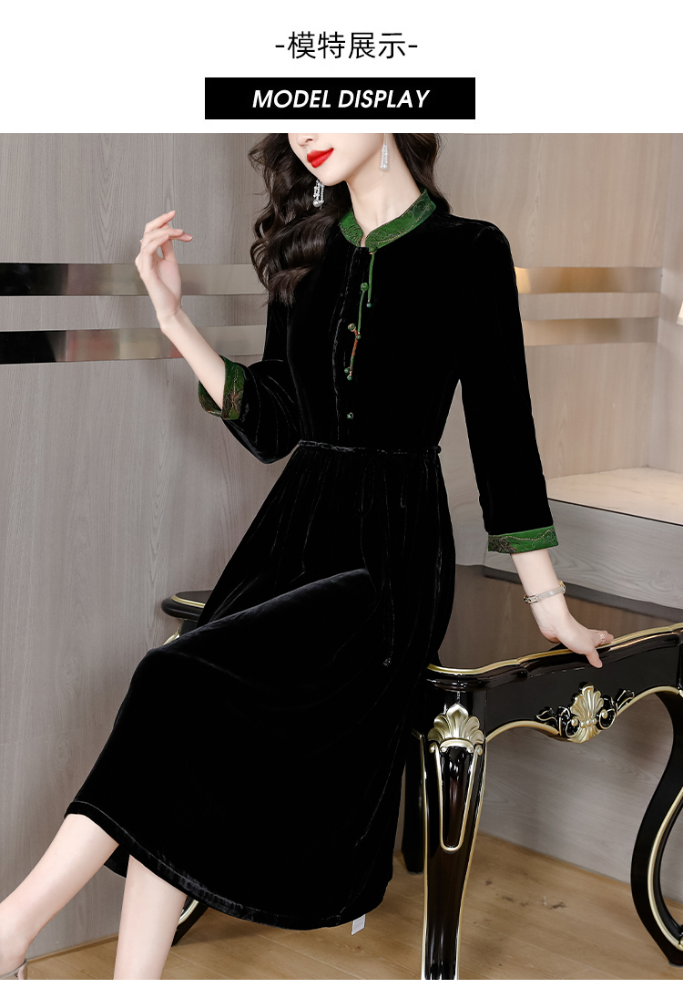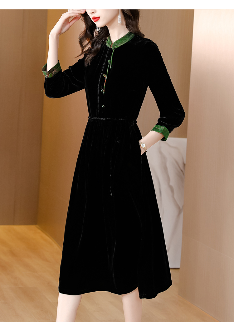 黑色真丝绒长袖,高腰中长款国风连衣裙 HT-XYX1121