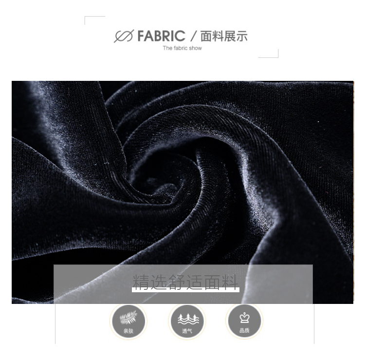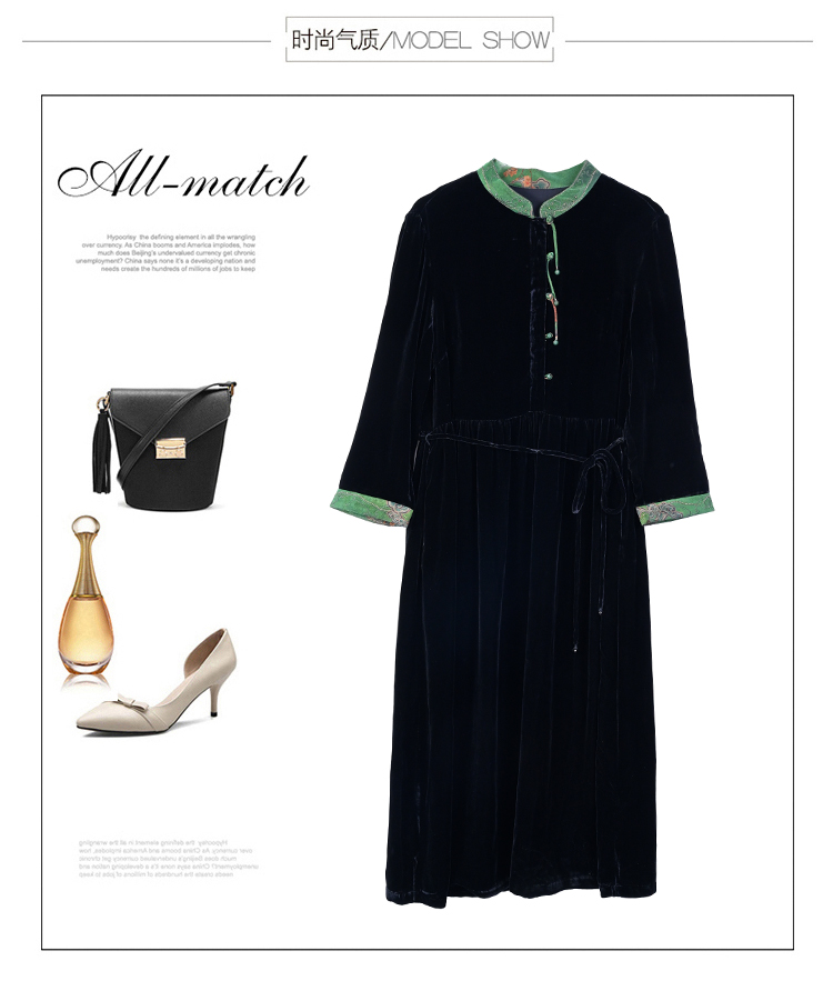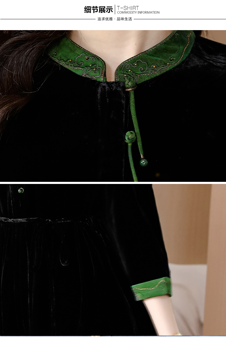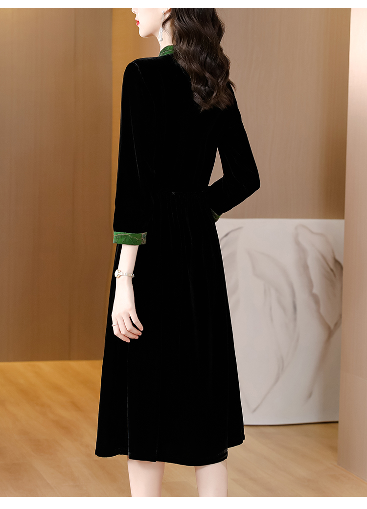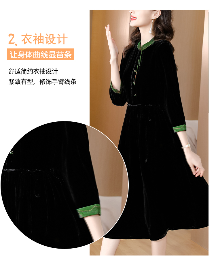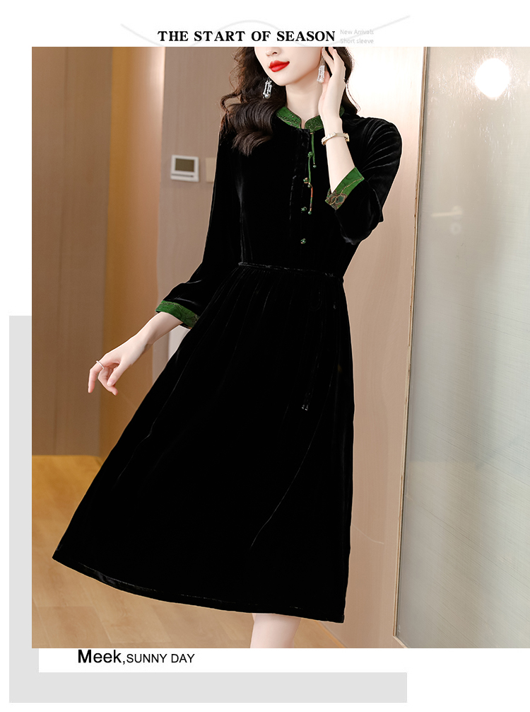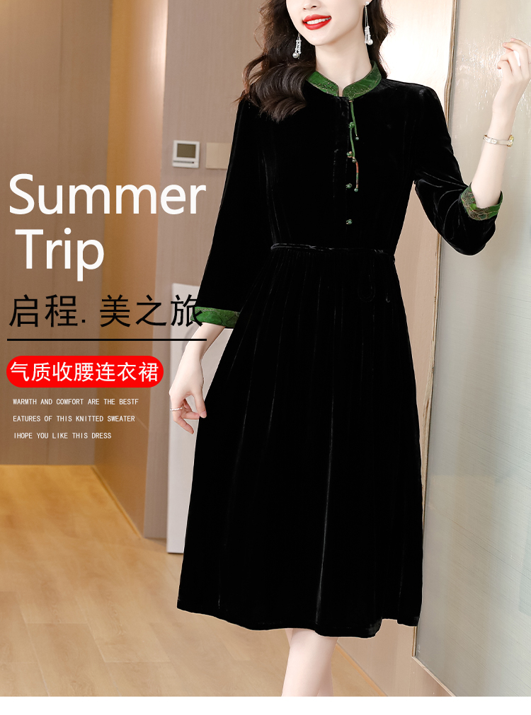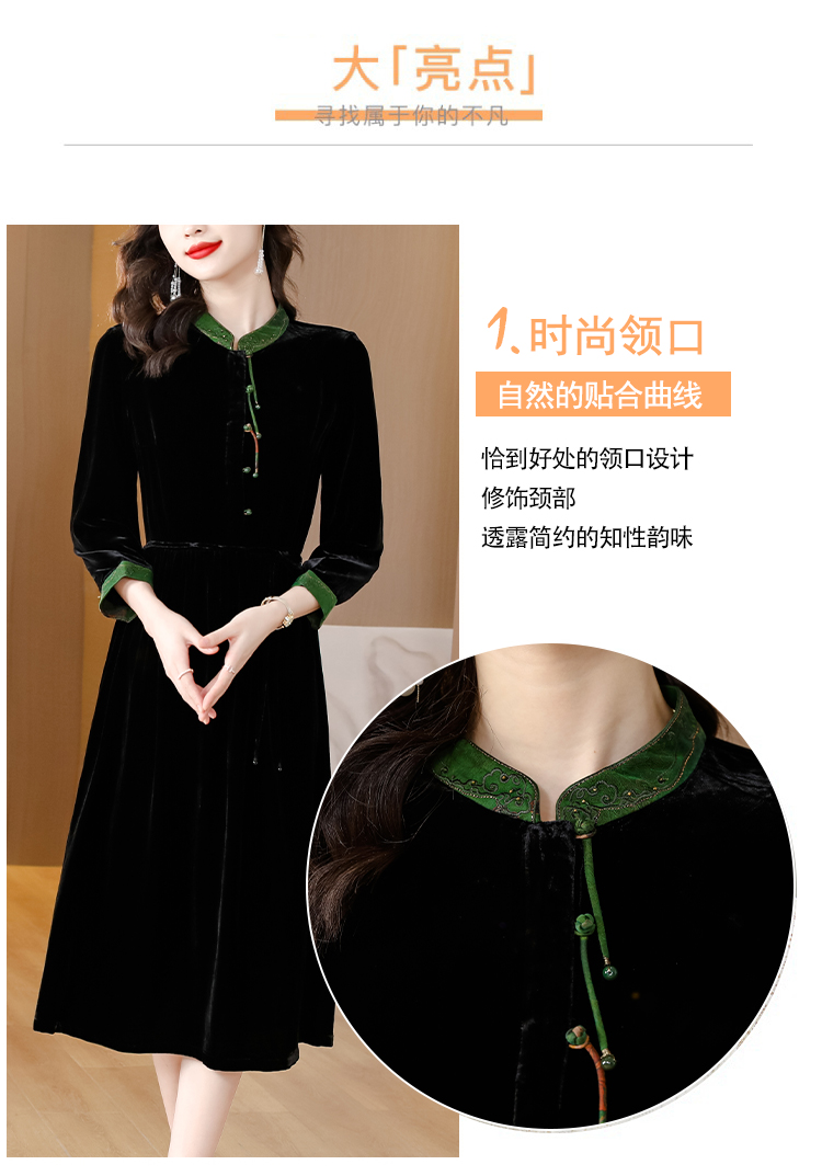 黑色真丝绒长袖,高腰中长款国风连衣裙 HT-XYX1121