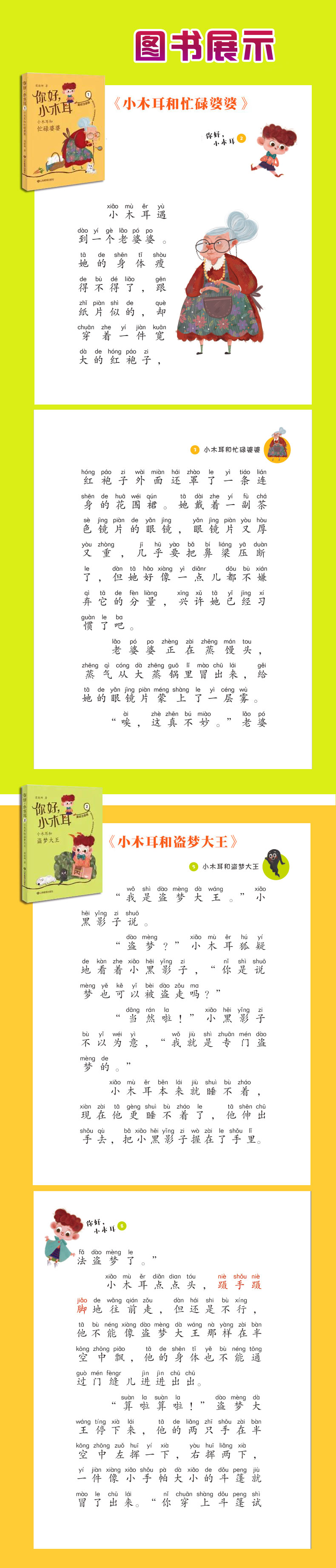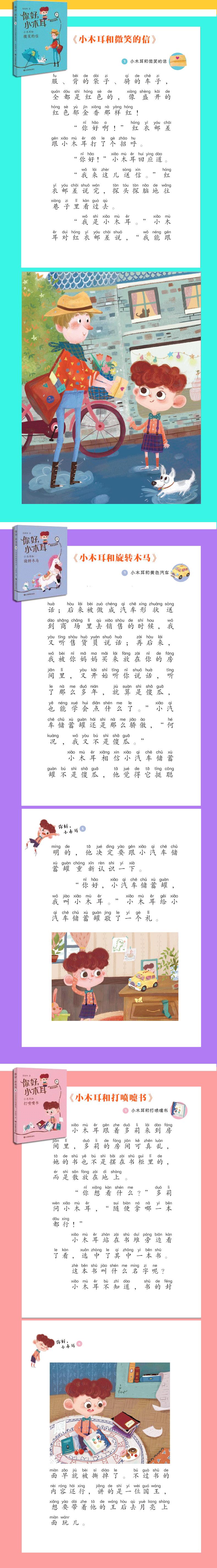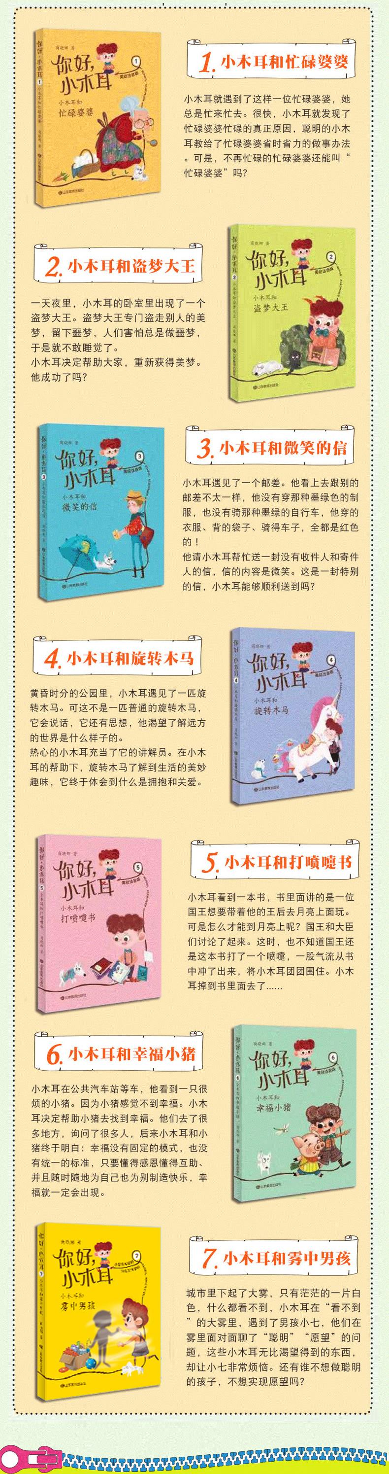 这个系列为美绘注音童话,是专为一、二年级小学生打造的好品质养成书系。《你好,小木耳》的主人公是一个叫小木耳的男生,每册书由他经历的4个不同的奇妙故事组成,每个故事都告诉了小读者一个浅显又深刻的道理,比如做事要分出轻重缓急,要有条理;犯了错误要勇于面对和改正;要学会微笑,学会珍惜生活中微小的幸福。