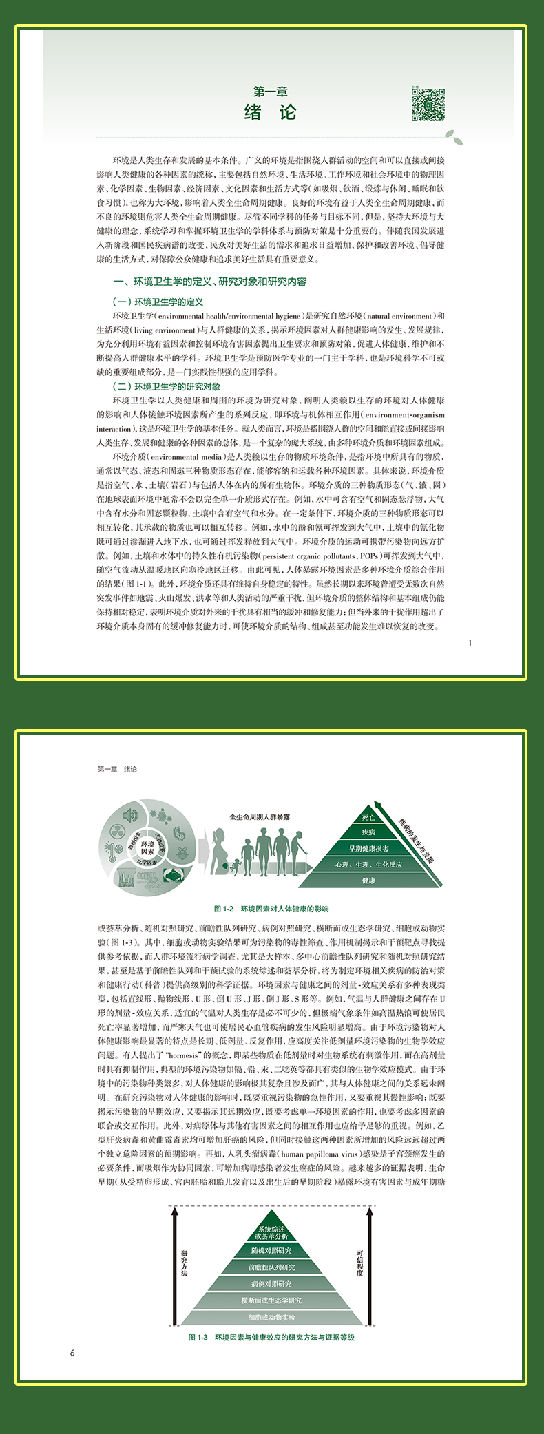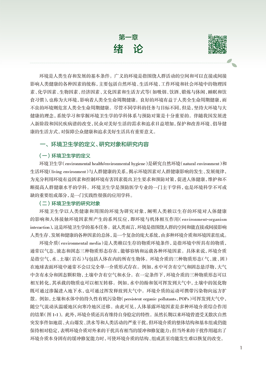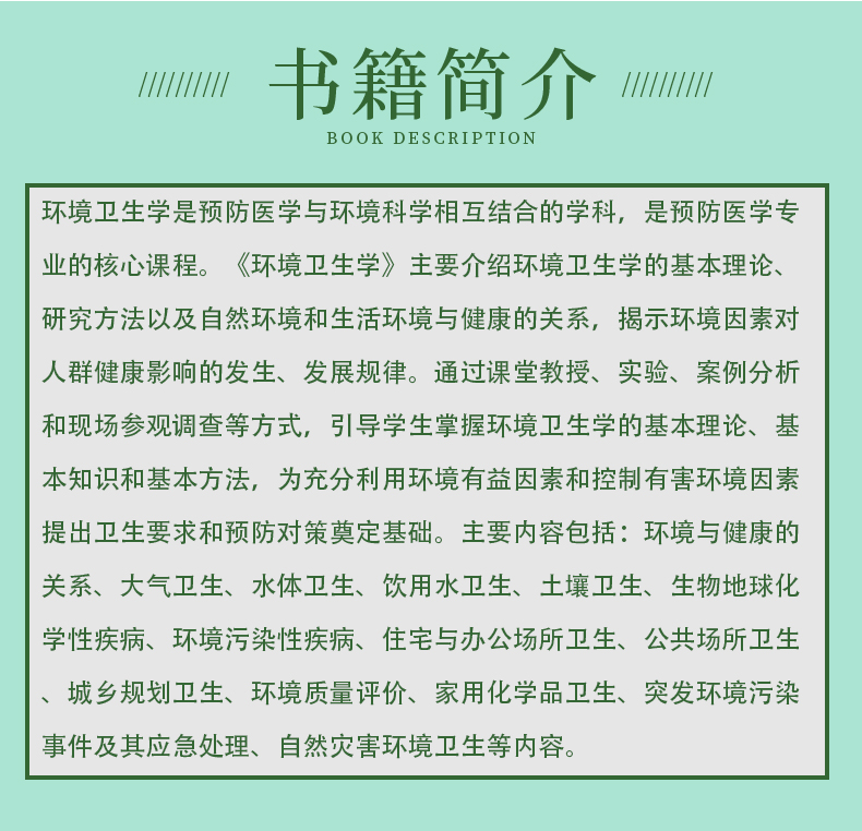 环境卫生学是预防医学与环境科学相互结合的学科,是预防医学专业的核心课程。《环境卫生学》主要介绍环境卫生学的基本理论、研究方法以及自然环境和生活环境与健康的关系,揭示环境因素对人群健康影响的发生、发展规律。通过课堂教授、实验、案例分析和现场参观调查等方式,引导学生掌握环境卫生学的基本理论、基本知识和基本方法,为充分利用环境有益因素和控制有害环境因素提出卫生要求和预防对策奠定基础。主要内容包括:环境与健康的关系、大气卫生、水体卫生、饮用水卫生、土壤卫生、生物地球化学性疾病、环境污染性疾病、住宅与办公场所卫生、公共场所卫生、城乡规划卫生、环境质量评价、家用化学品卫生、突发环境污染事件及其应急处理、自然灾害环境卫生等内容。