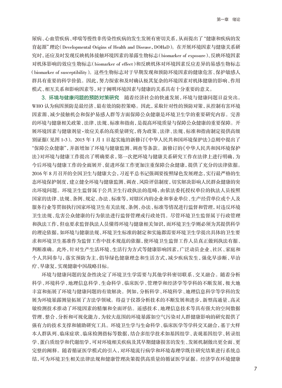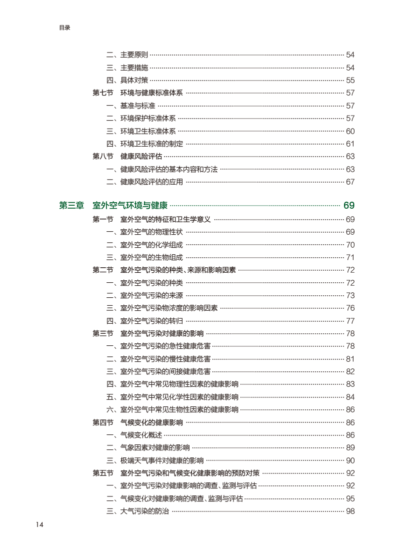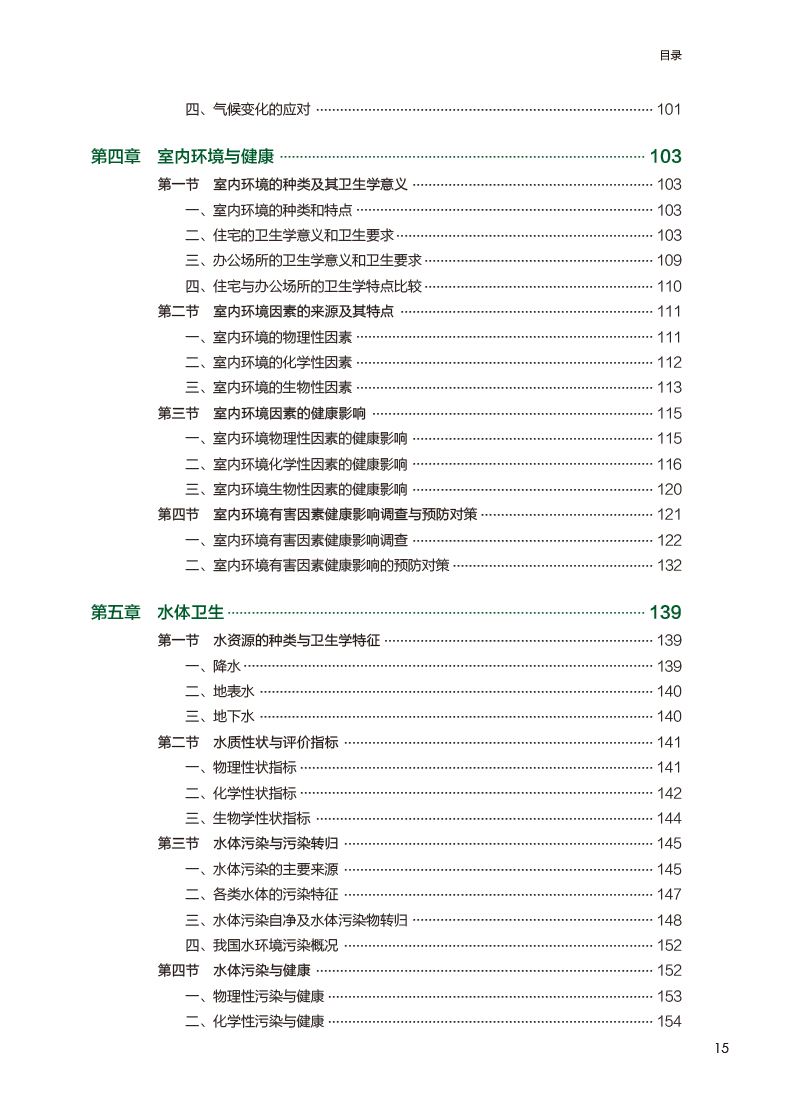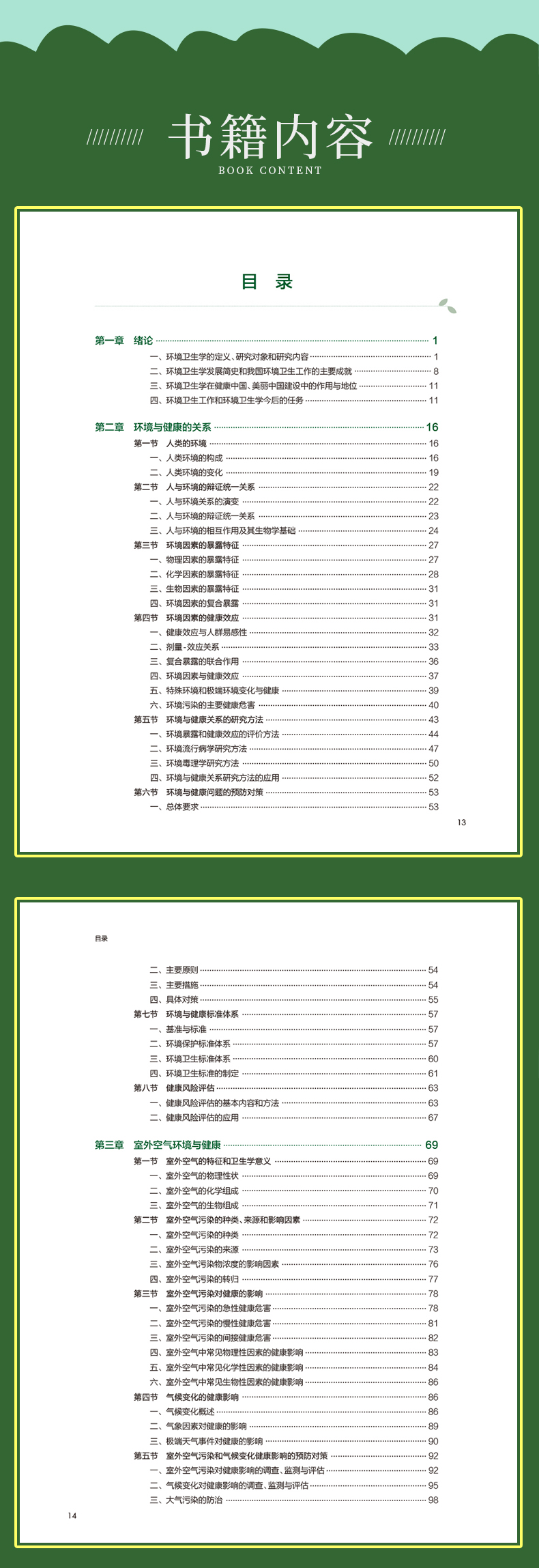 环境卫生学是预防医学与环境科学相互结合的学科,是预防医学专业的核心课程。《环境卫生学》主要介绍环境卫生学的基本理论、研究方法以及自然环境和生活环境与健康的关系,揭示环境因素对人群健康影响的发生、发展规律。通过课堂教授、实验、案例分析和现场参观调查等方式,引导学生掌握环境卫生学的基本理论、基本知识和基本方法,为充分利用环境有益因素和控制有害环境因素提出卫生要求和预防对策奠定基础。主要内容包括:环境与健康的关系、大气卫生、水体卫生、饮用水卫生、土壤卫生、生物地球化学性疾病、环境污染性疾病、住宅与办公场所卫生、公共场所卫生、城乡规划卫生、环境质量评价、家用化学品卫生、突发环境污染事件及其应急处理、自然灾害环境卫生等内容。