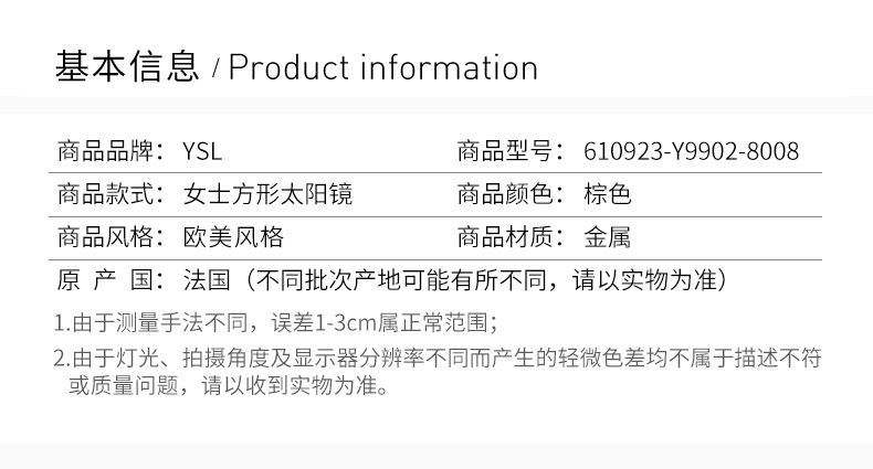 YSL 圣罗兰 女士棕色金属方形太阳镜