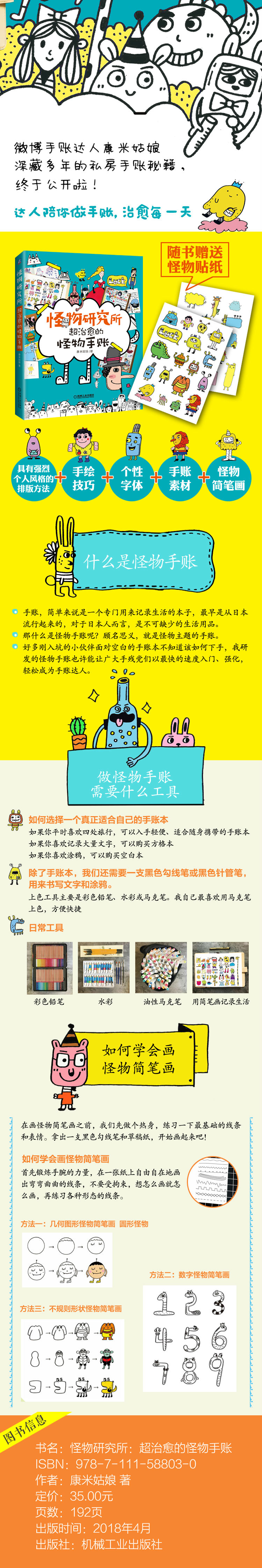 用独具创意的方法教你们做有个性的手账,“手指怪物手账术”“口红怪物排版”“神奇的治愈画风——挤娃娃”“怪物与字体的激烈碰撞”……还有各种脑洞大开的怪物教程,让大家在书中找到一种前所未有的乐趣。