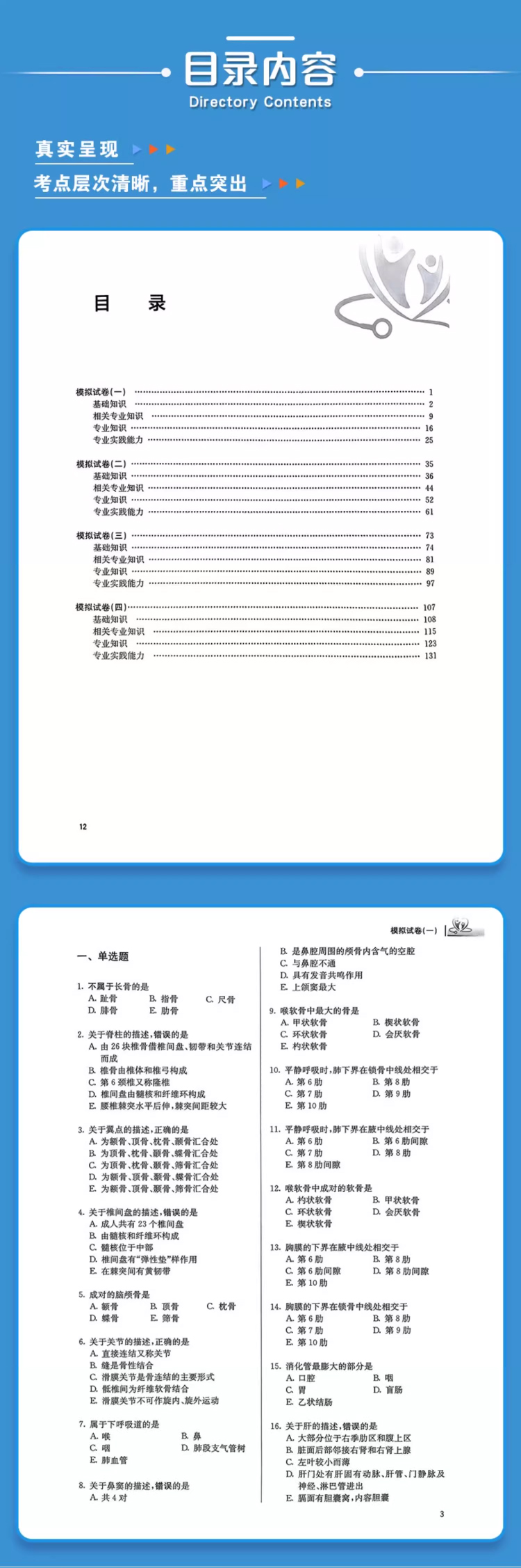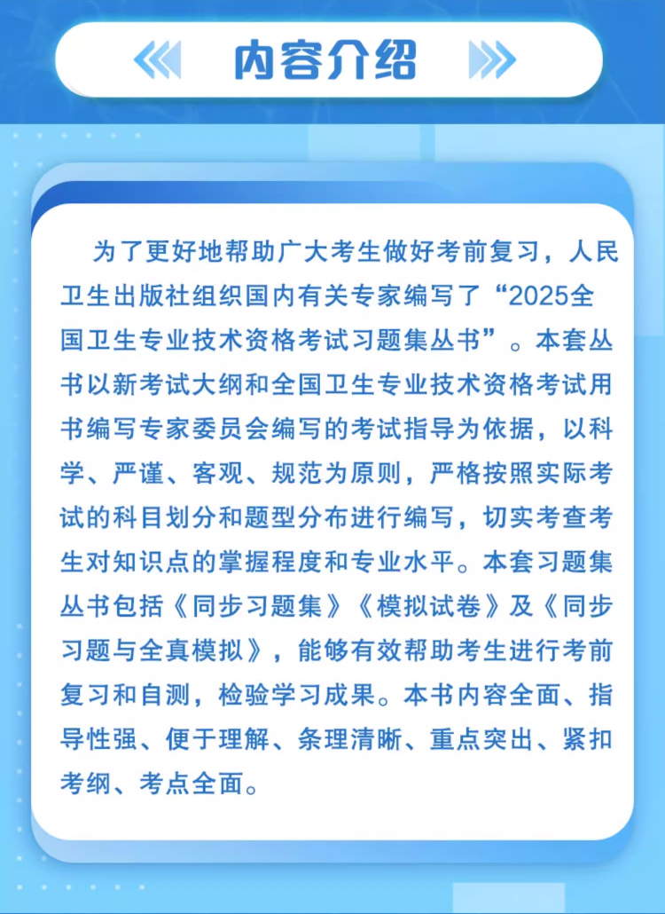 “全国卫生专业技术资格考试习题集丛书”以最新考试大纲和全国卫生专业技术资格考试用书编写专家委员会编写的考试指导为依据,编写工作遵循科学、严谨、客观、规范的原则,严格按照实际考试的科目划分和题型分布进行编写,切实考查考生对知识点的掌握程度和专业水平。本套习题集丛书包括《同步习题与全真模拟》《同步习题集》《模拟试卷》,能够有效帮助考生考前复习、自测和反馈学习成果。《模拟试卷》全面模拟考试真题,针对考生临考备战进行综合性巩固。题目难度和题型分布参考实际考试情况设定。除附参考答案外,部分重点、难点问题附有解析。每套试卷根据试题不同的难易度设置了不同的建议完成时间,仿真度高,是考前冲刺的重要用书。