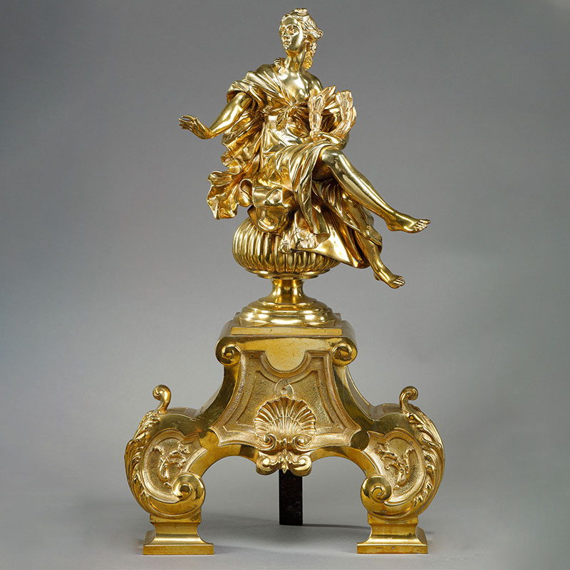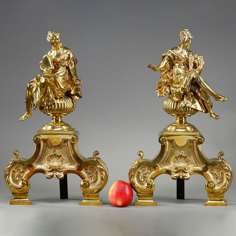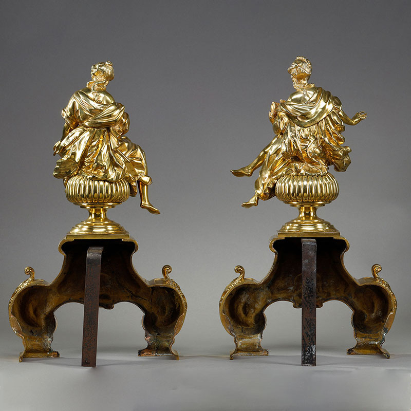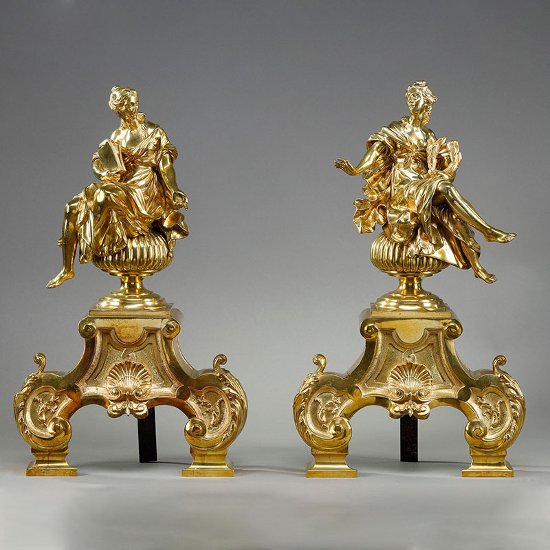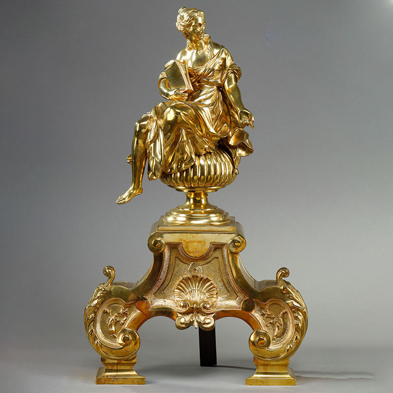 1900年代法国出品新古典主义风格缪斯女神主题精雕铜鎏金壁炉柴架一对