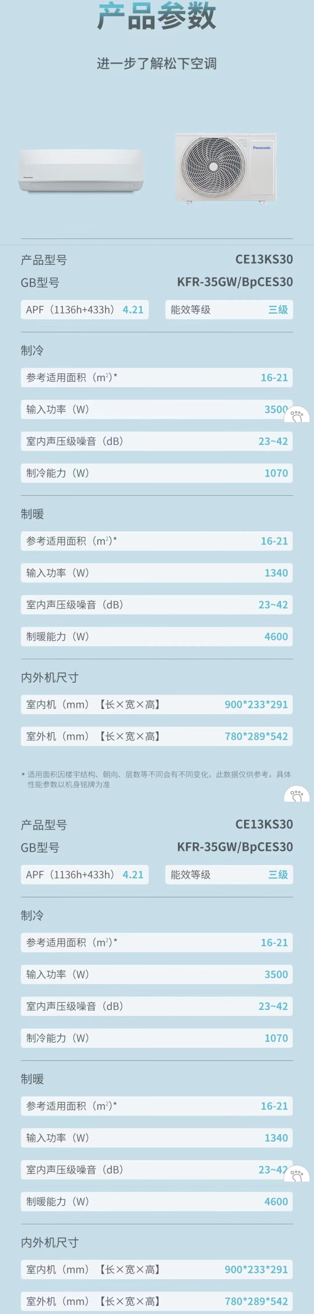 松下挂机 1.5匹 变频冷暖 三级能效/一级能效 壁挂式空调 CE13KS30/CE13KS10