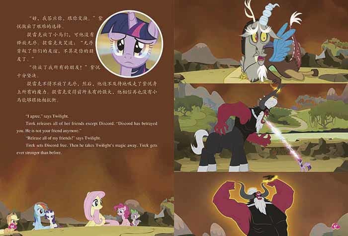 (2)传递积极向上正能量,助力孩子成长:《小马宝莉大冒险双语故事》不但情节吸引人,也能教会孩子很多道理。在《大战梦魇之月》中,紫悦的魔法虽然强大,却无法打败梦魇之月,只有她明白了友谊的重要性,并且和朋友们一起,才能拯救小马利亚。这个道理是很抽象的,但是这个故事把它具体化、生动化,孩子很容易就能接受。