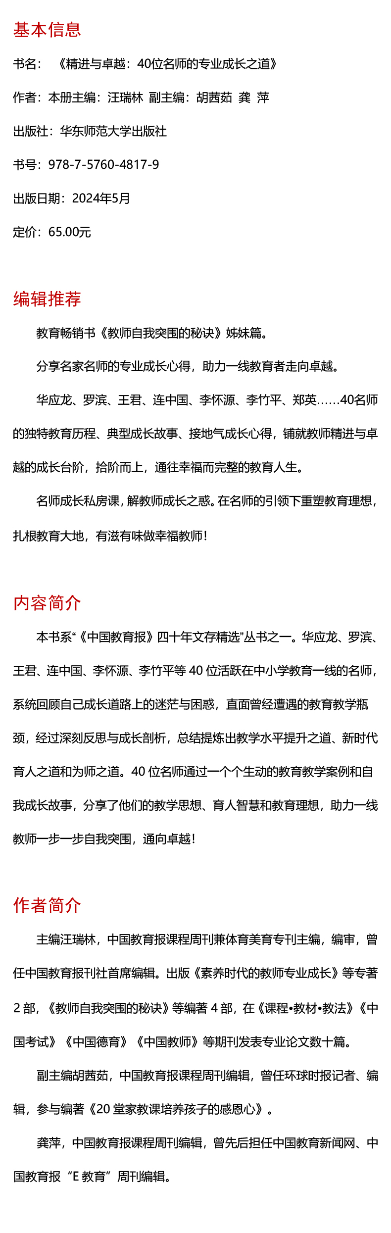 ·教育畅销书《教师自我突围的秘诀》姊妹篇。·分享名家名师的专业成长心得,助力一线教育者走向卓越。·华应龙、罗滨、王君、连中国、李怀源、李竹平、郑英……40名师的独特教育历程、典型成长故事、接地气成长心得,铺就教师精进与卓越的成长台阶,拾阶而上,通往幸福而完整的教育人生。·名师成长私房课,解教师成长之惑。在名师的引领下重塑教育理想,扎根教育大地,有滋有味做幸福教师!