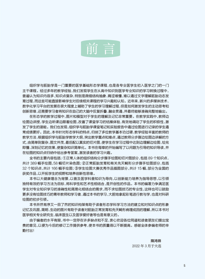 1.为已出版《零基础绘图学解剖》姊妹篇。《零基础绘图学解剖》出版2月以来已销售2000余册。本教材由中国解剖学会组织大连医大、北大医学部等院校组胚专家共同编写并通过学会推广使用。2.由浅入深、由简入繁,适合绘画零基础医学生学习组织胚胎学,并适应临床阶段医学生、规培学生以及中低年资医生学习相关专业组织及胚胎学知识。3.结合组织胚胎学规划教材编写。配合规划教材涵盖了组织胚胎学内容,并注意以加强临床导向的相应部分内容描述,总计线条图达600幅,重点内容配以病理片作为对照,共计约270页。将每一幅图片按照授课内容由浅入深的顺序,对每一幅图片进行由简至繁的分解,同时对相应的授课内容进行简述。