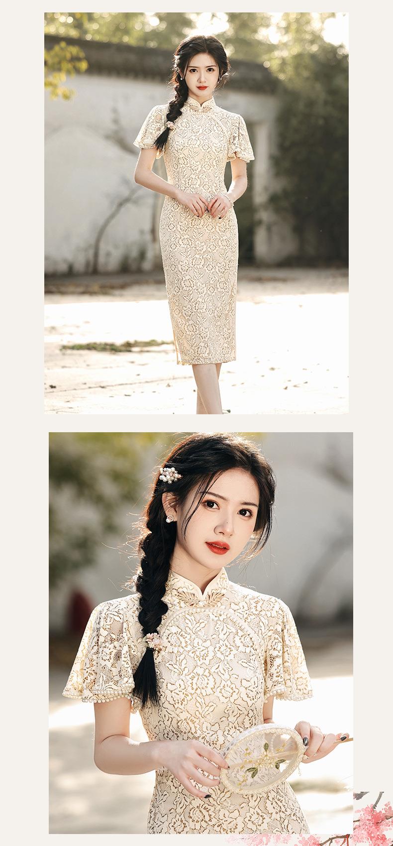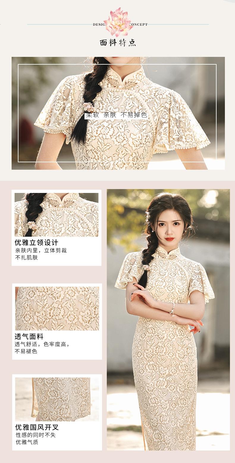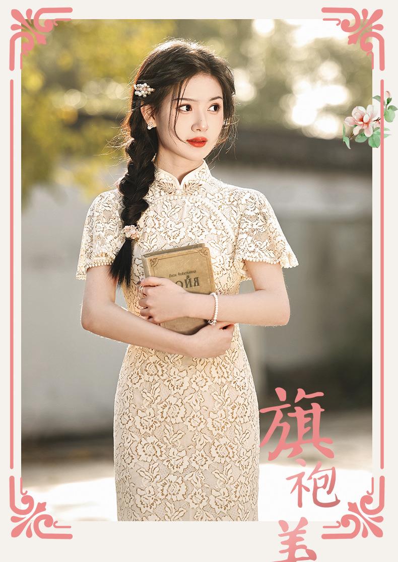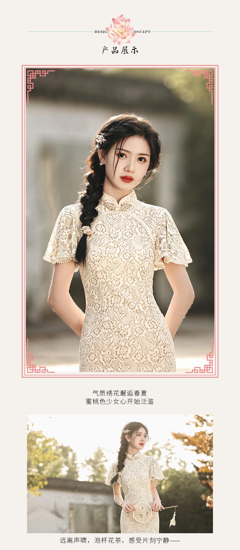 2023春夏新款飞飞袖双层蕾丝中长款圆襟旗袍连衣裙少女改良旗袍