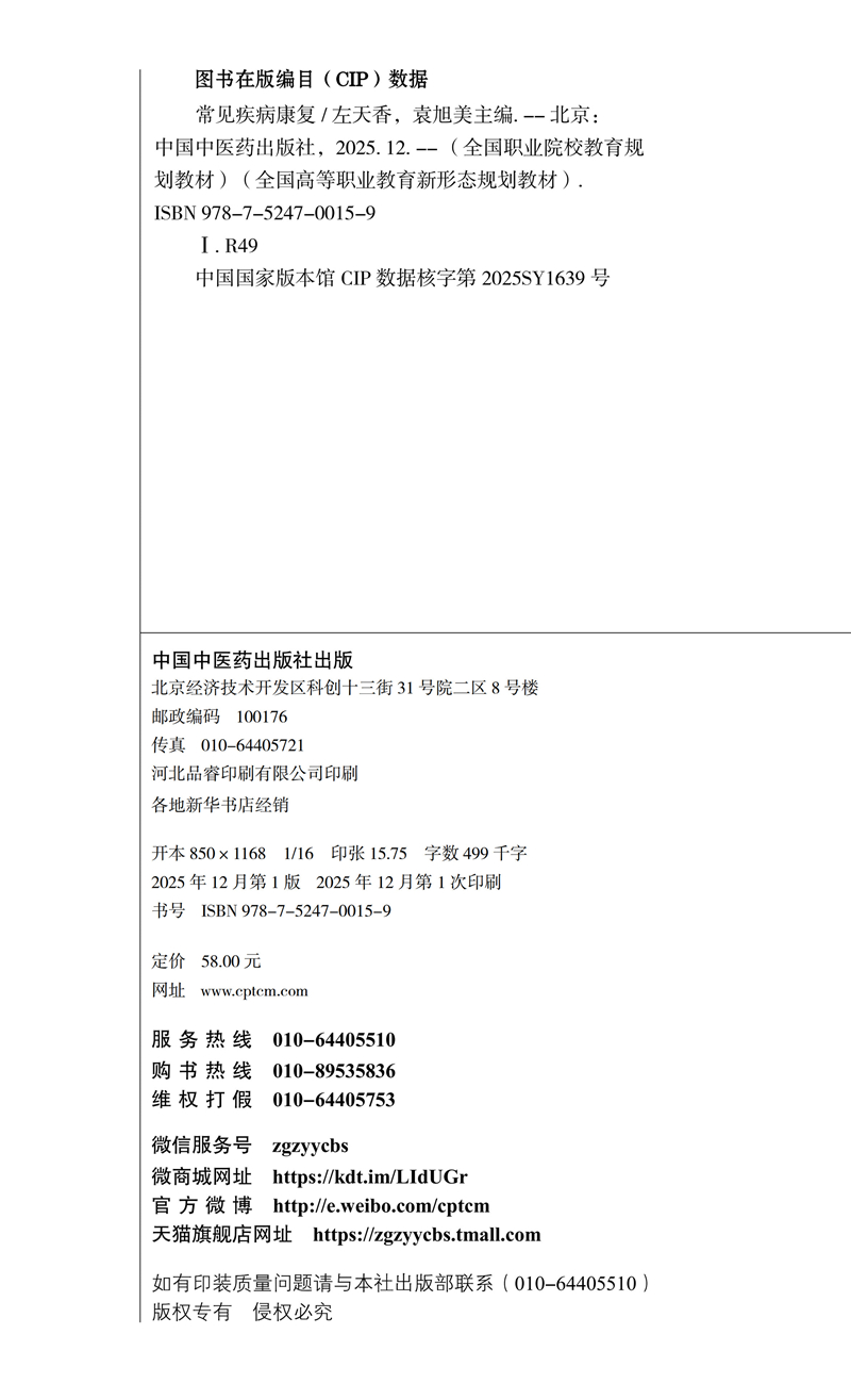 常见疾病康复 全国高等职业教育新形态规划教材 左天香 袁旭美 供康复治疗技术中医康复技术临床医学等专业使用 中国中医药出版社