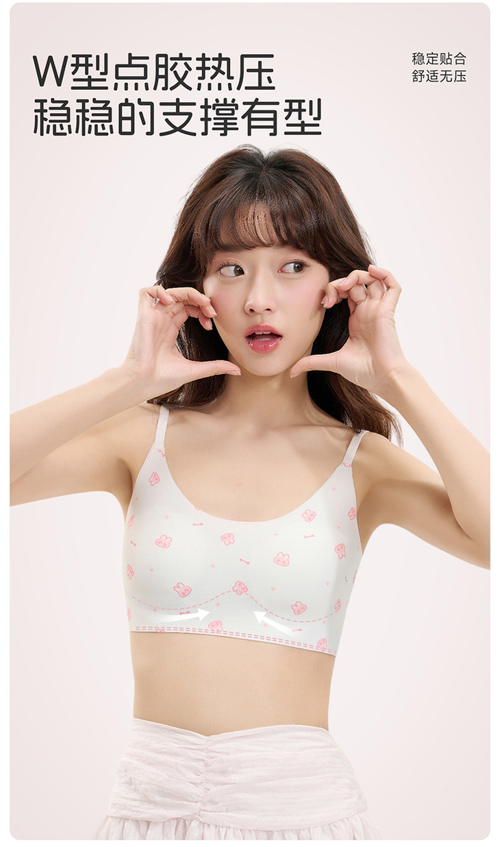 科学支撑,稳稳承托 底围软支撑:替代传统钢圈,提供温柔而稳定的承托力,保护发育。 加高侧比:增加侧面包裹,收拢副乳,稳定胸型,运动不移位
