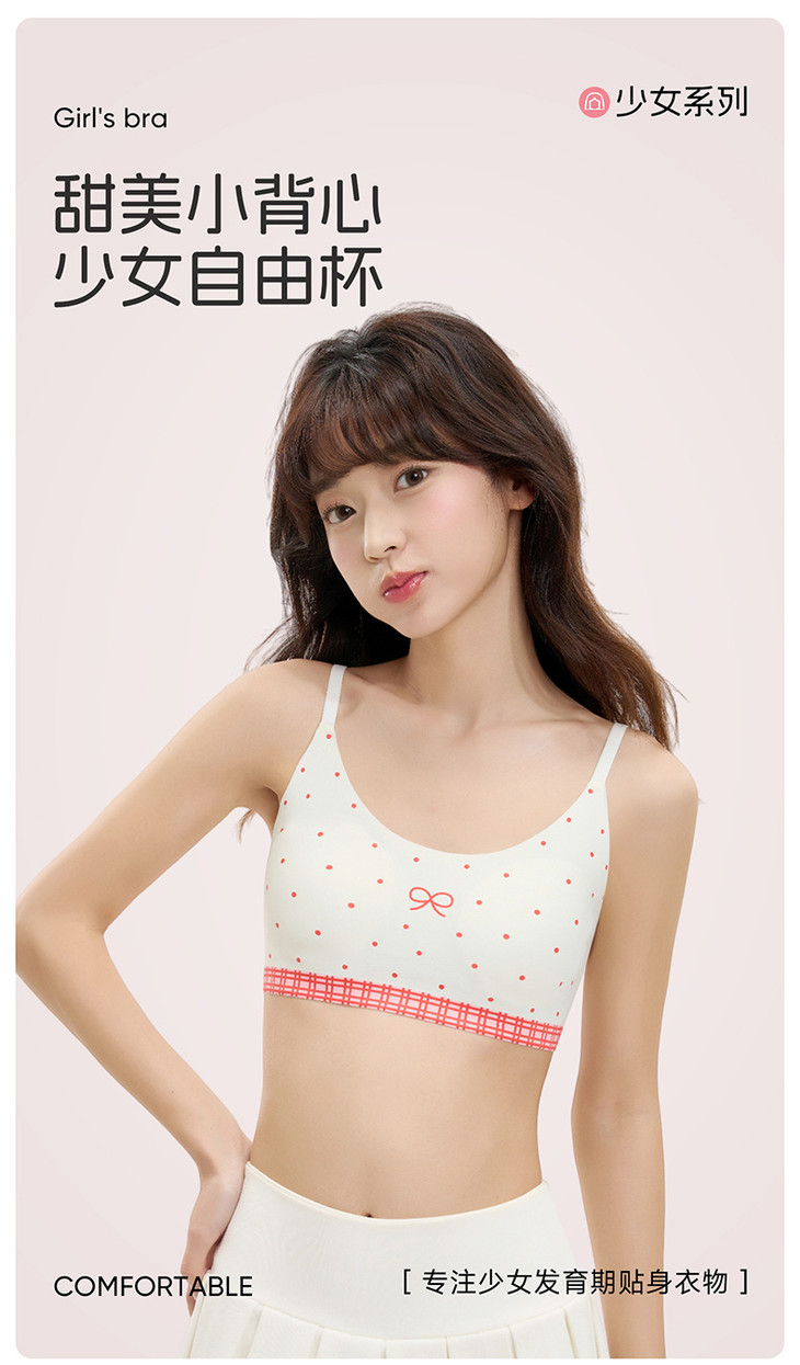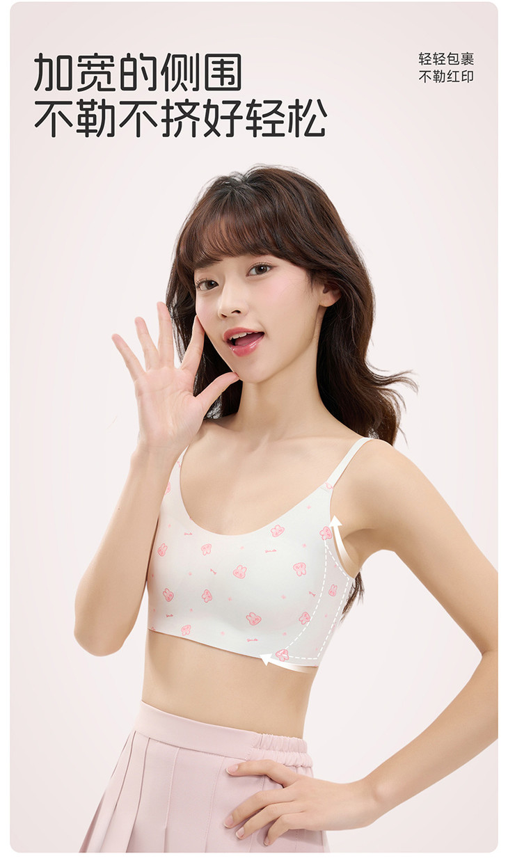 极致柔软,仿若无物 采用“空气杯”结构与亲肤面料,如第二层肌肤般柔软贴合 减轻发育期胸部的束缚感与异物感