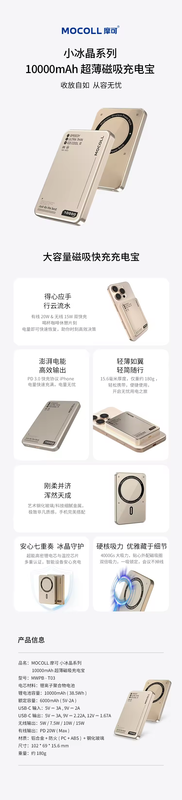 摩可 移动电源 超薄磁吸 10000mAh - 金色【国家3C认证】