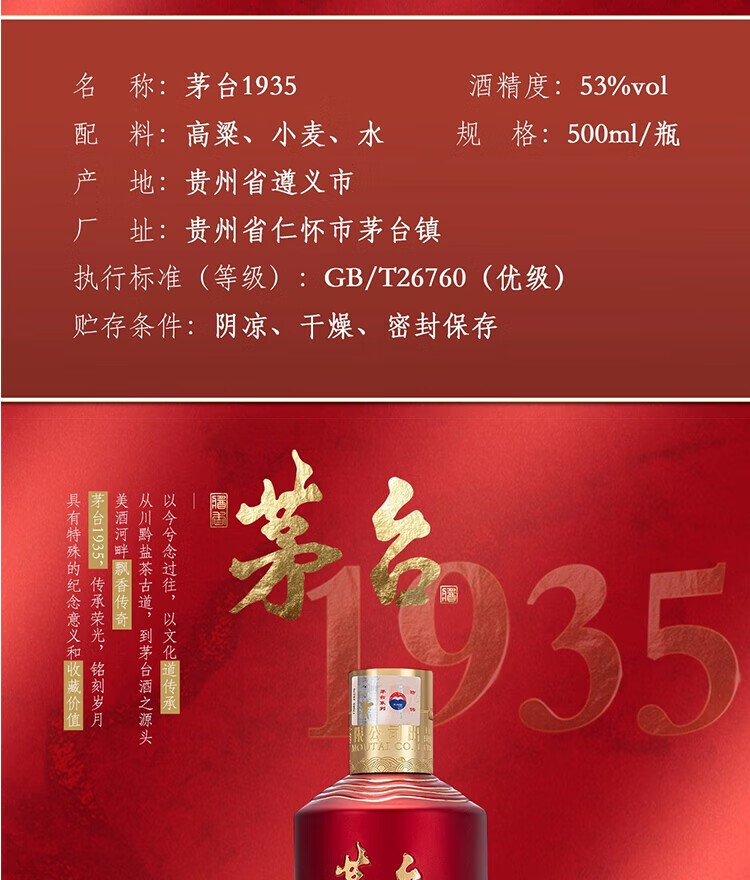 茅台 1935 酱香酒白酒 2022年 53度 500ml 单瓶装 商务接待 聚会宴请 高端礼赠 节后发货
