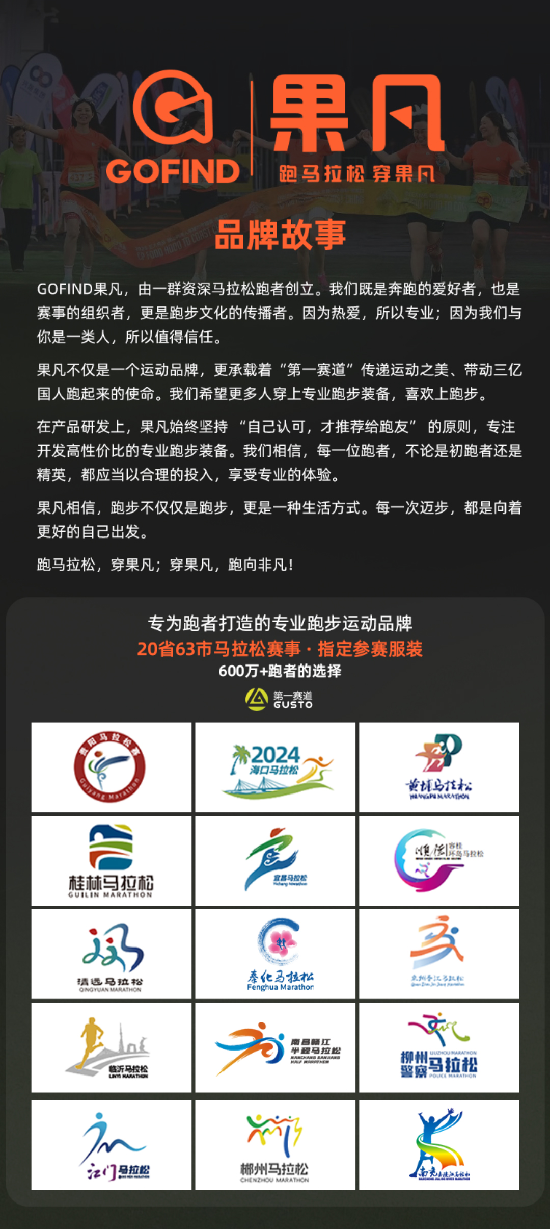 - GOFIND果凡是一个专为跑者打造的专业运动品牌,由新中体集团旗下的中体靓品发展而来。创始团队是来源于新中体的一群资深马拉松赛事运营者和资深跑者设计师。