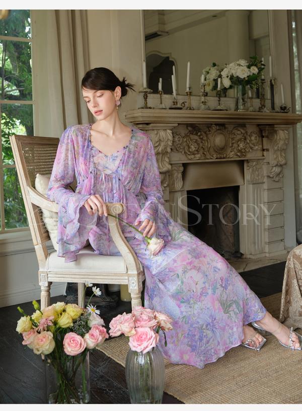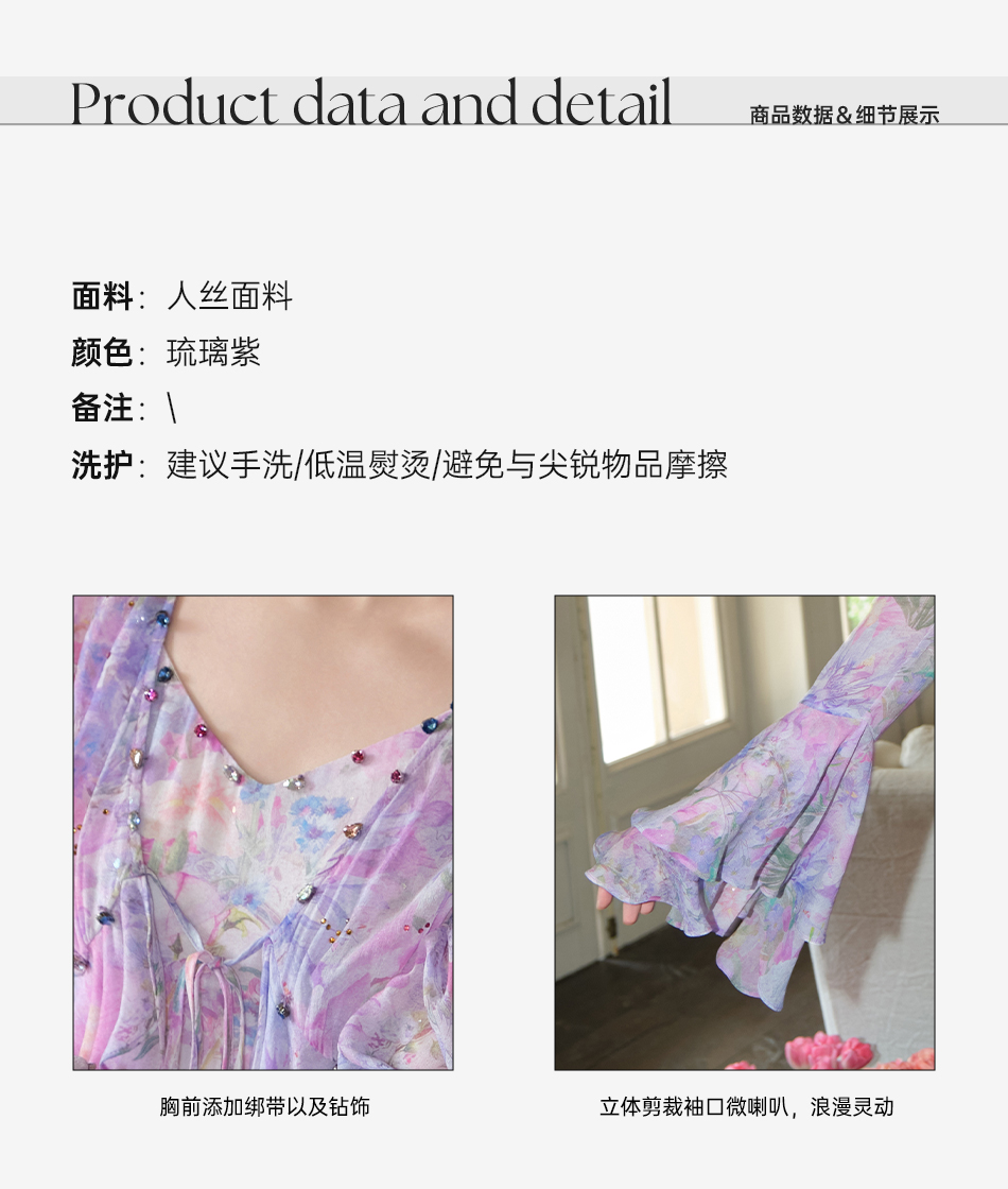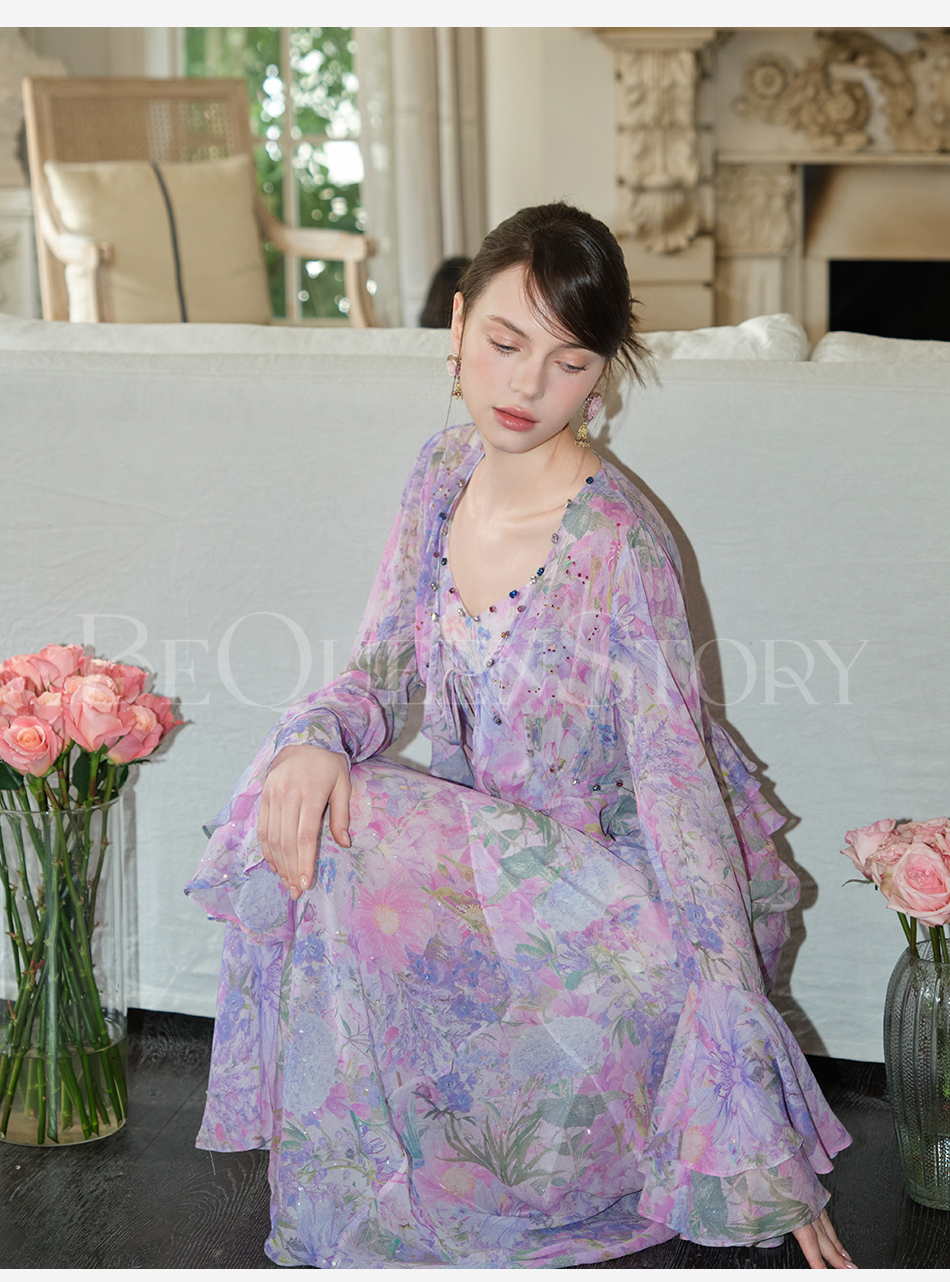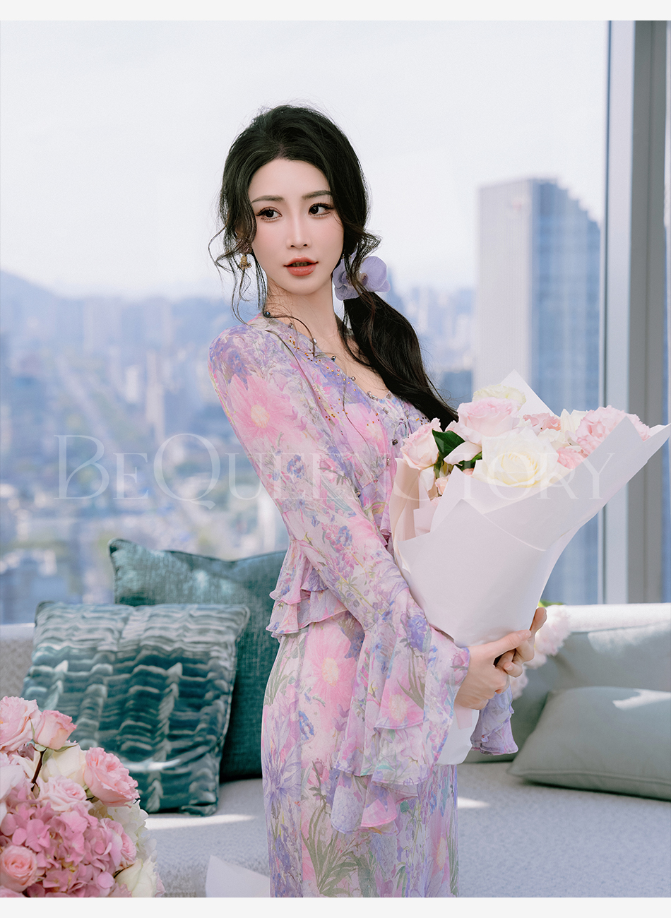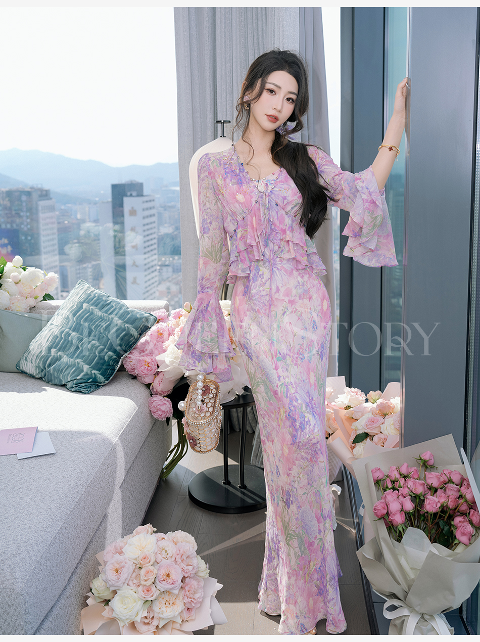 余潇潇【多瑙河花海】2025春装新款气质轻奢时尚气质人丝连衣裙套装