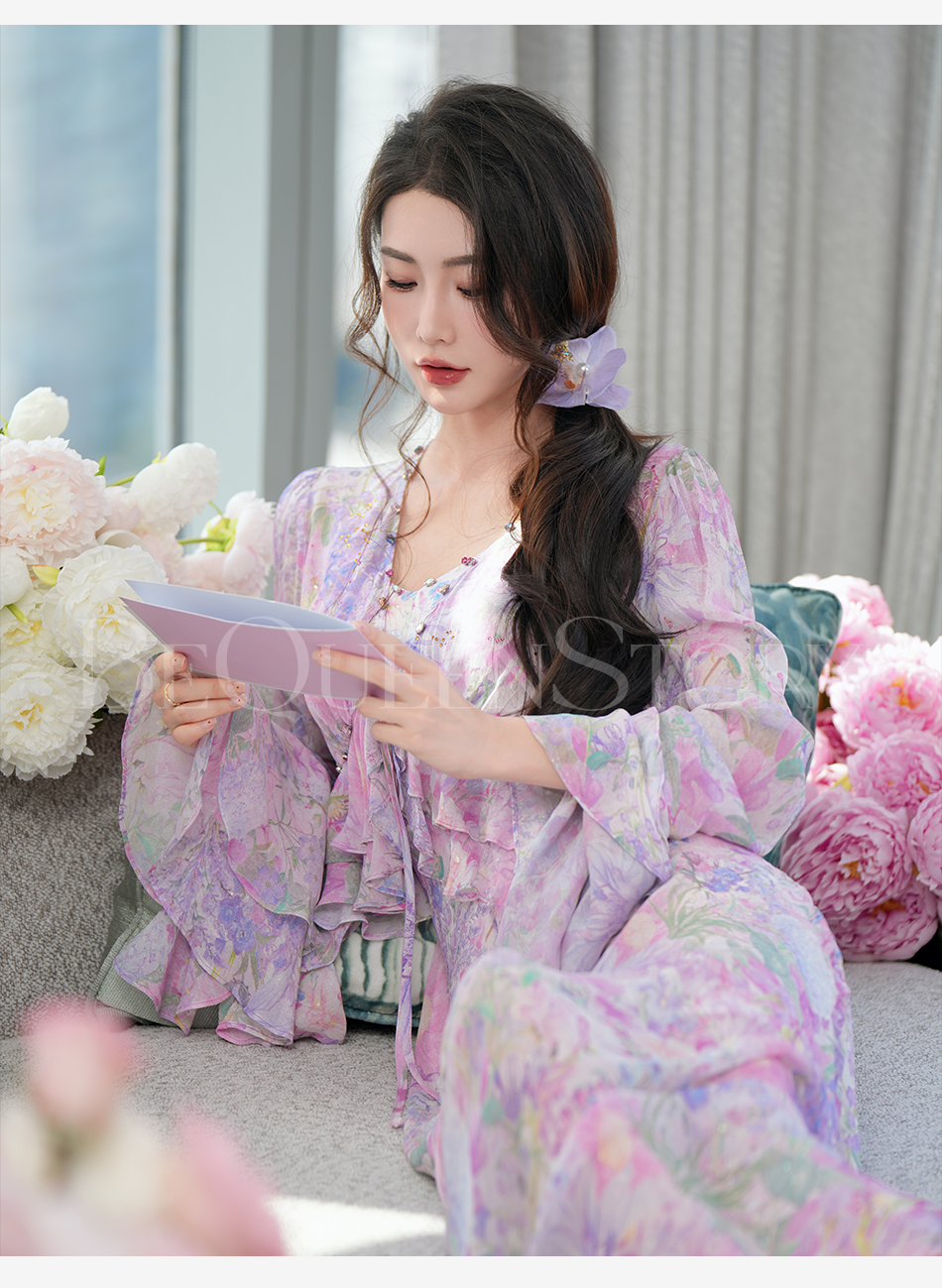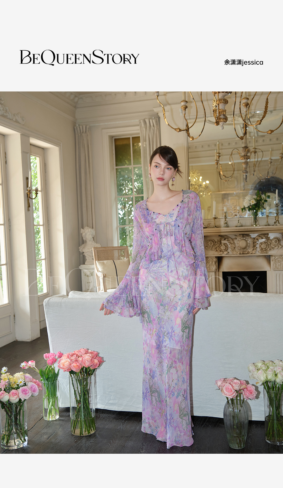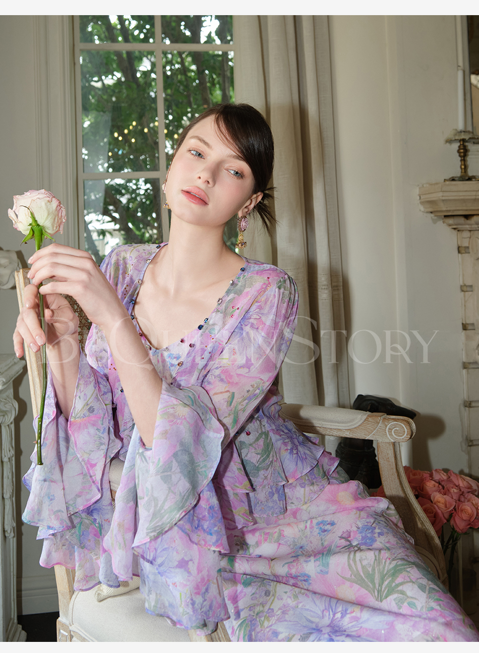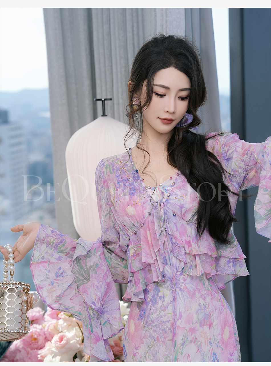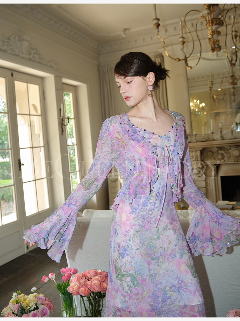余潇潇【多瑙河花海】2025春装新款气质轻奢时尚气质人丝连衣裙套装