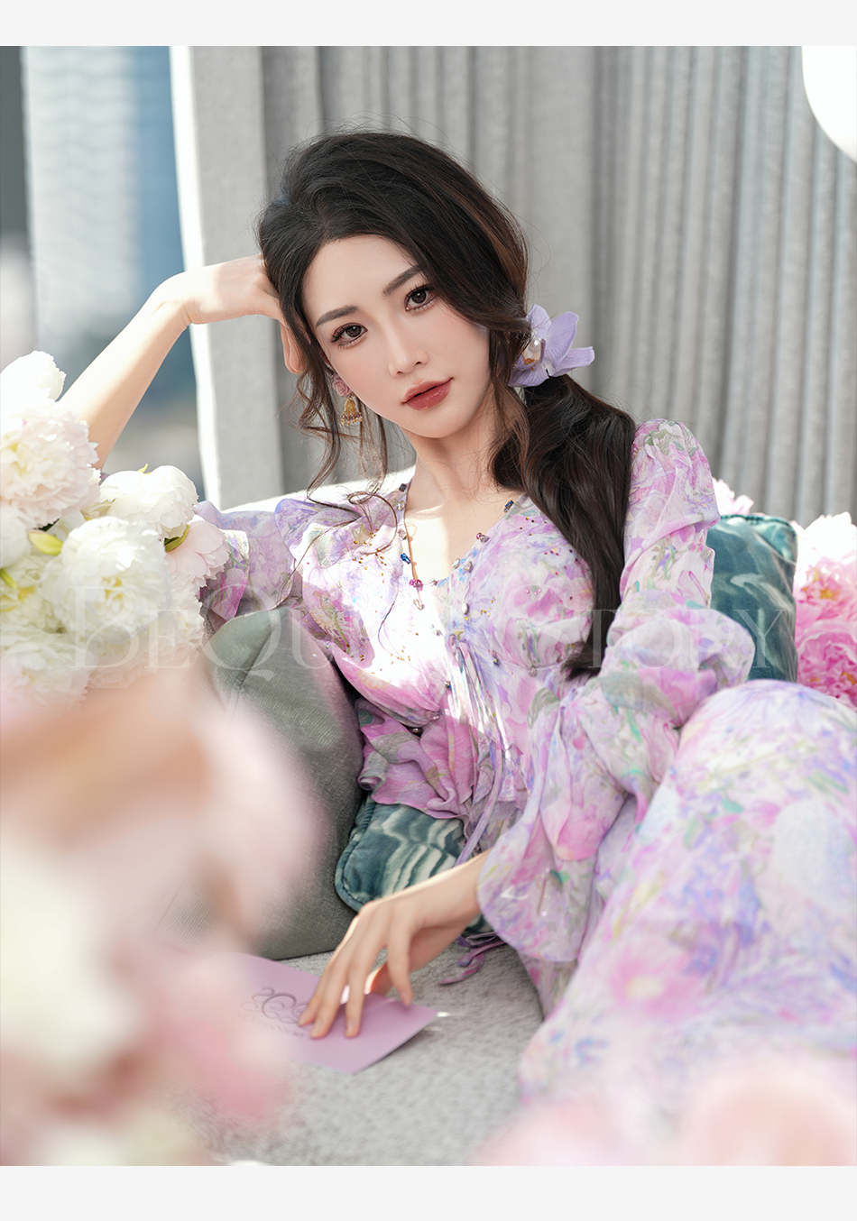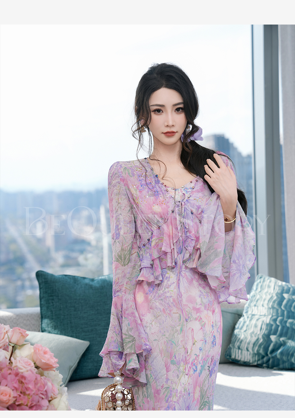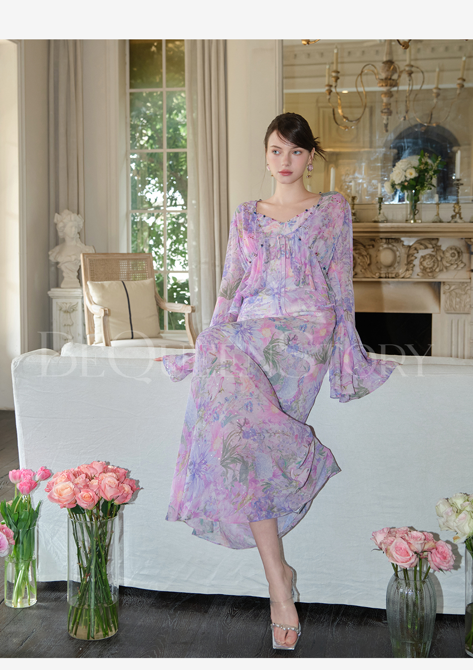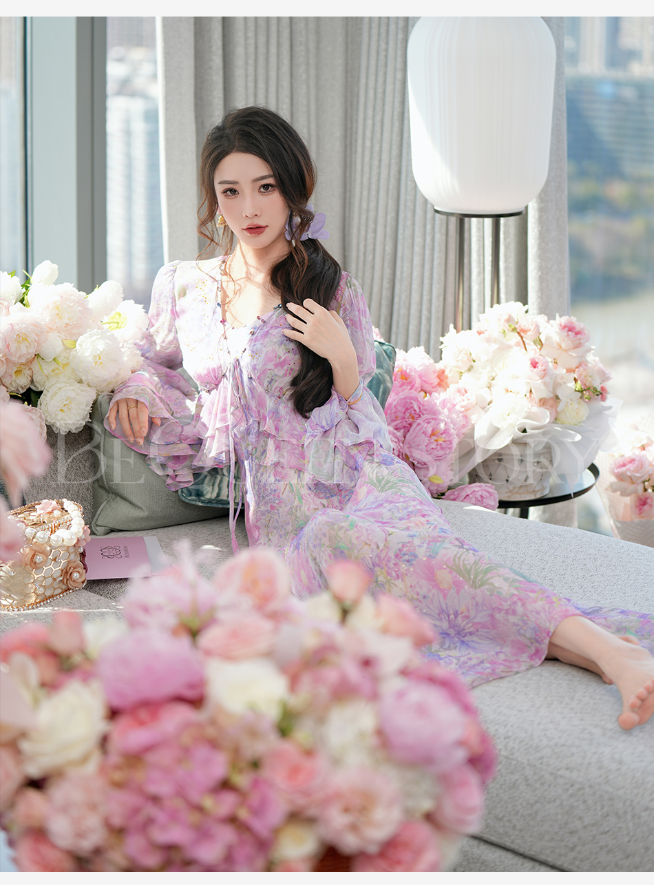 余潇潇【多瑙河花海】2025春装新款气质轻奢时尚气质人丝连衣裙套装