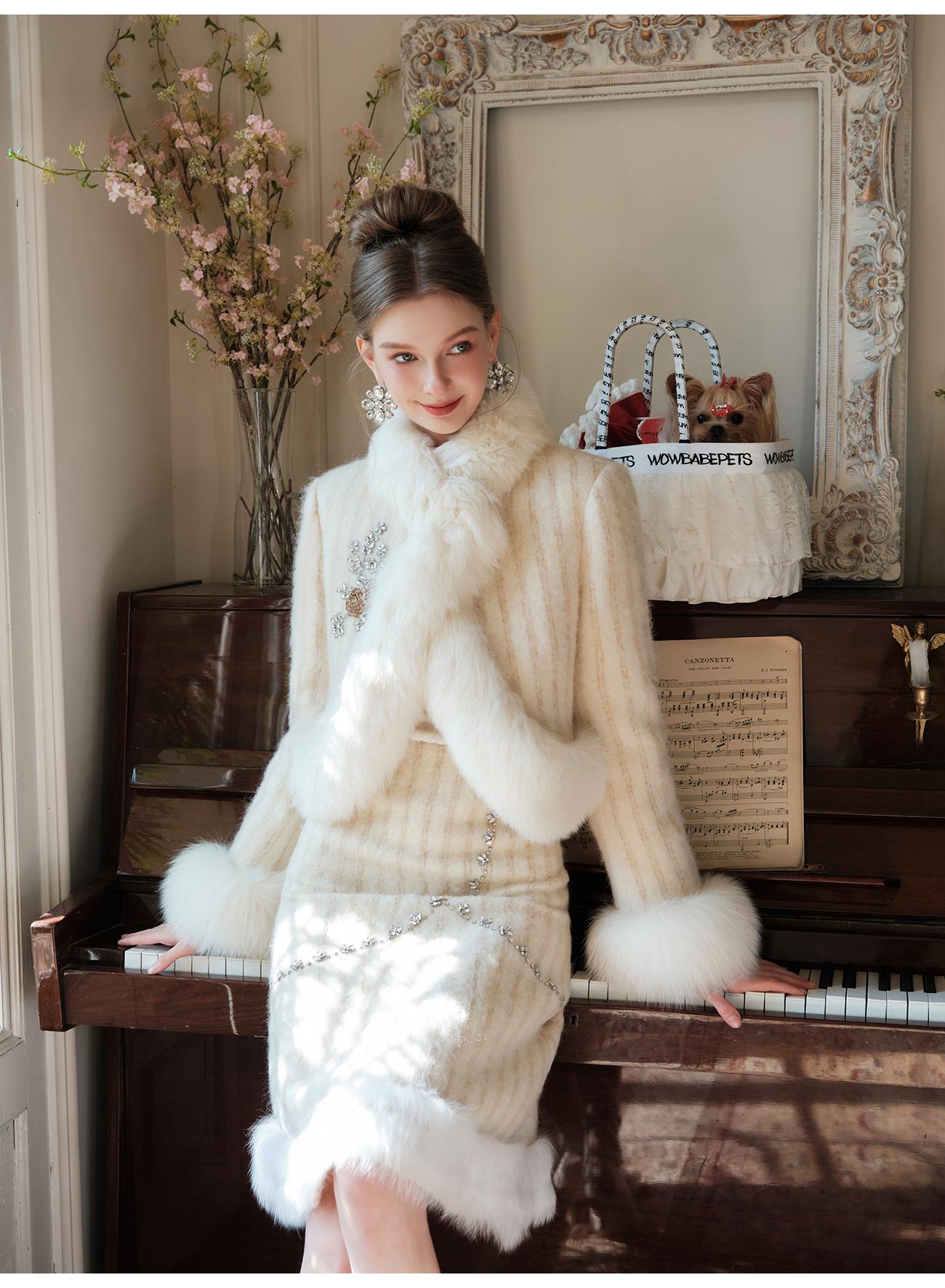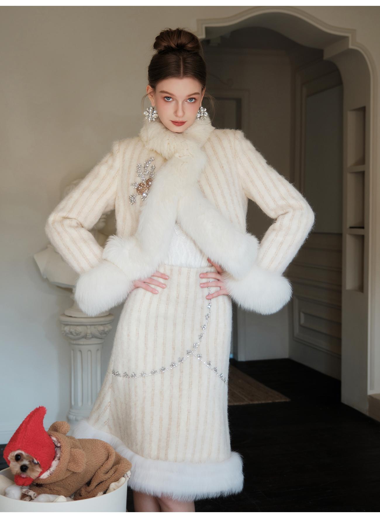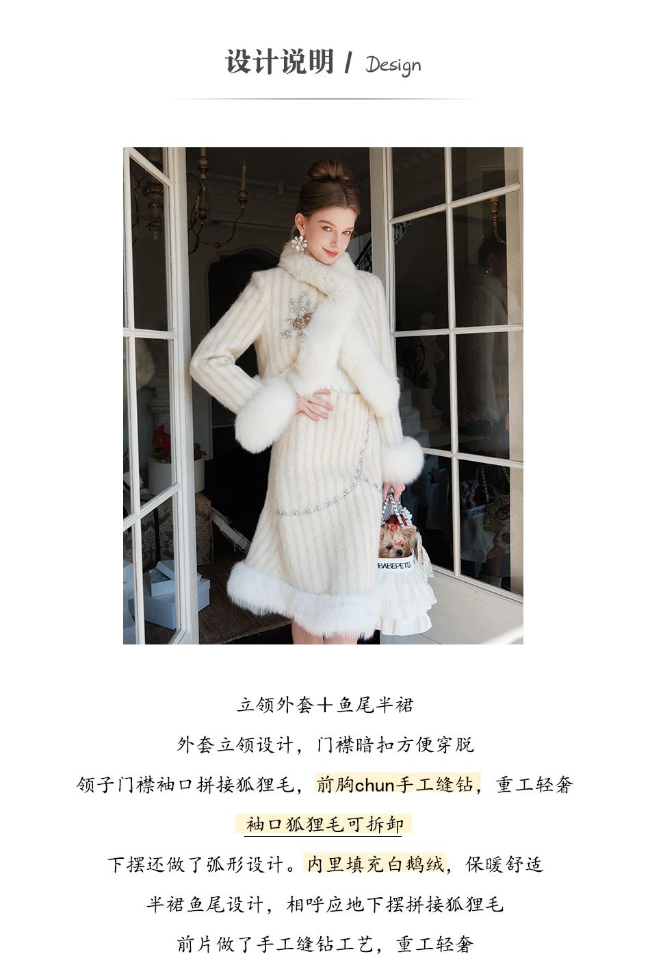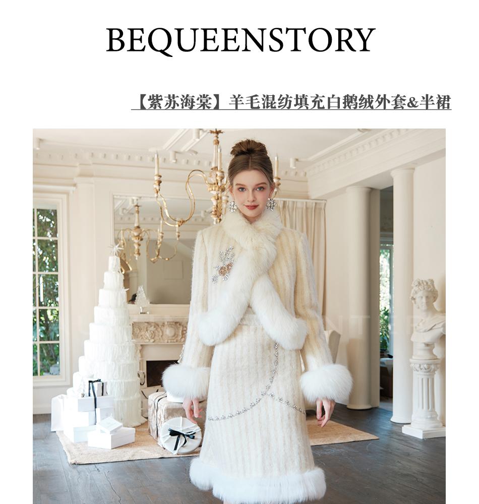 【年终福利,不退不换】【紫苏海棠】羊毛混纺拼接狐狸毛填充白鹅绒外套&半裙