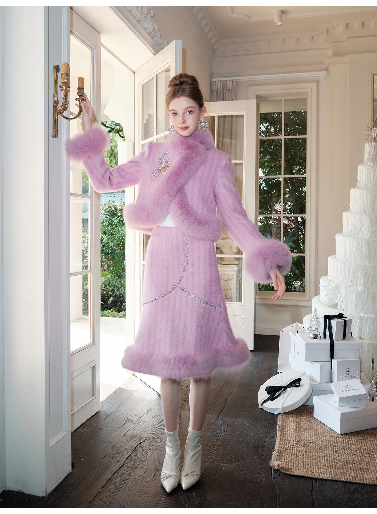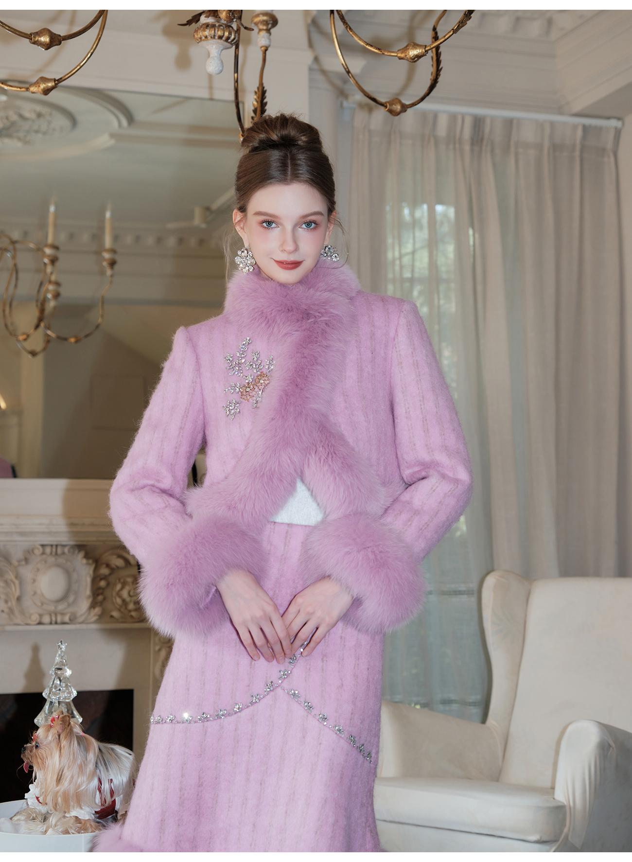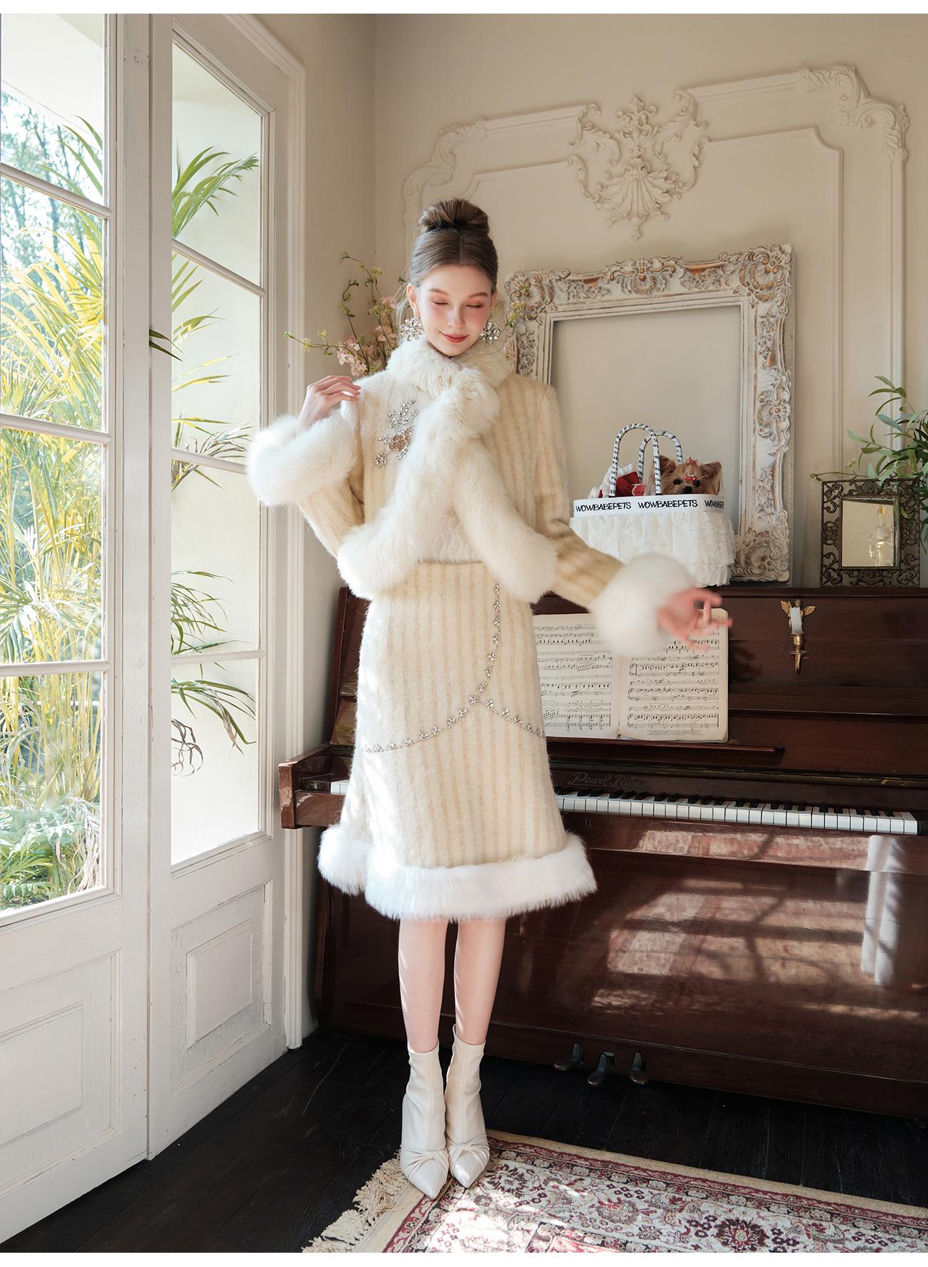 【年终福利,不退不换】【紫苏海棠】羊毛混纺拼接狐狸毛填充白鹅绒外套&半裙