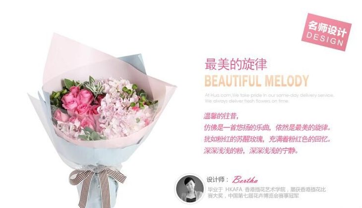 最美的旋律----苏醒粉玫瑰16枝,粉色绣球1枝,绿小菊3枝,叶上花6枝 内层粉色opp雾面纸 外层蓝色绝色纸 透明玻璃纸 白咖细罗纹带(1092)
