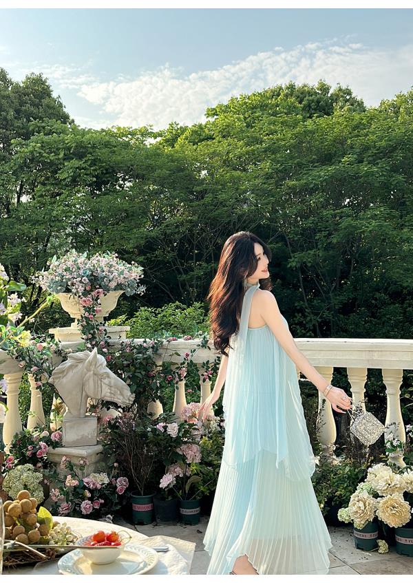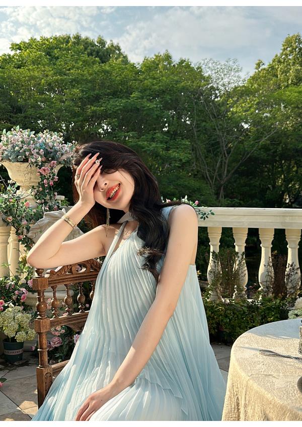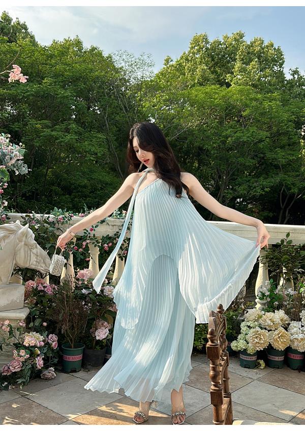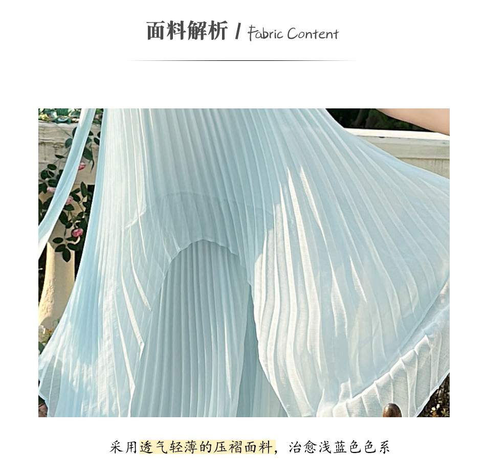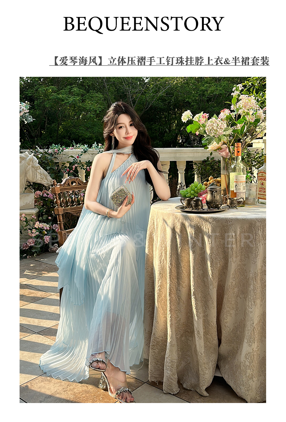 BeQueenStory【爱琴海风】法式立体压褶手工钉珠挂脖上衣&半裙套装