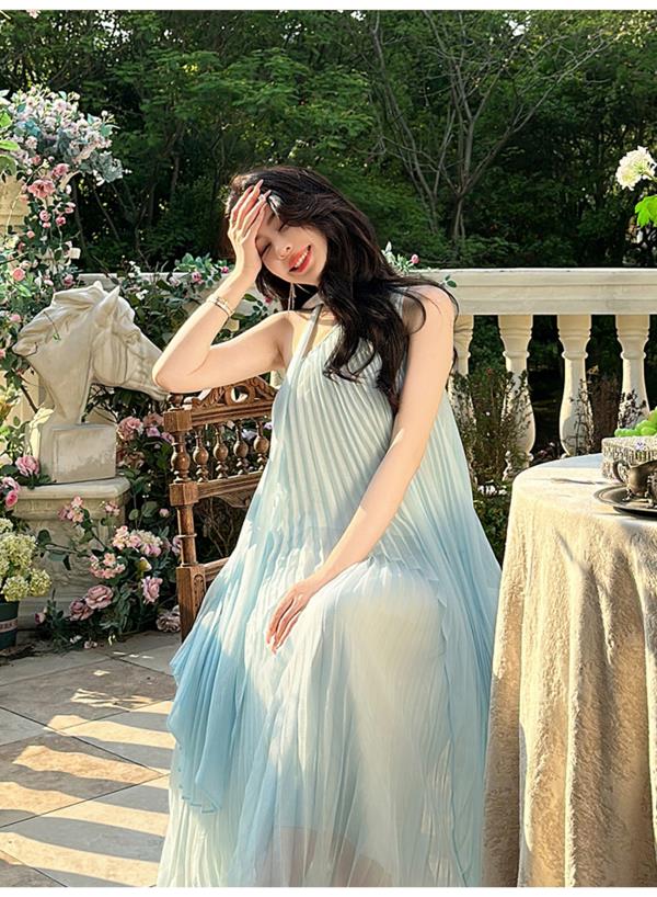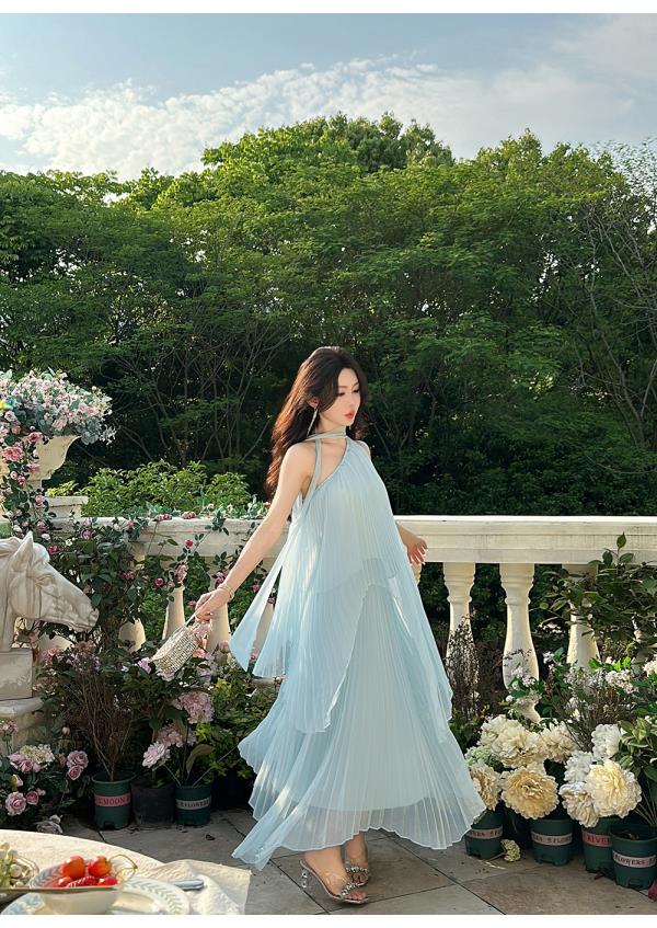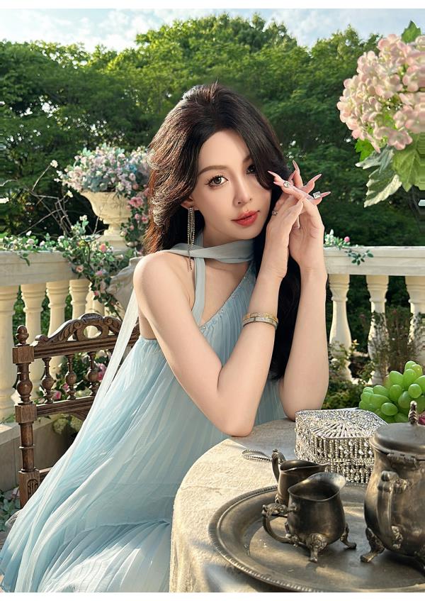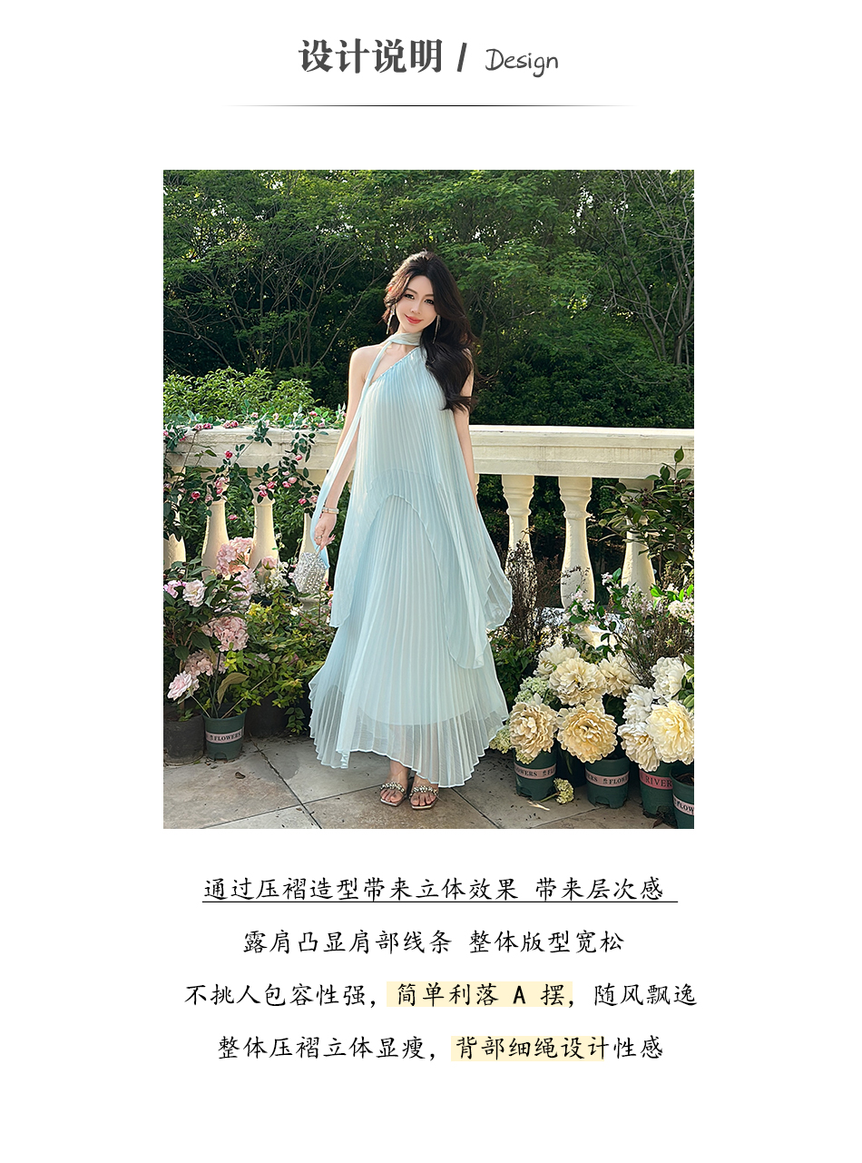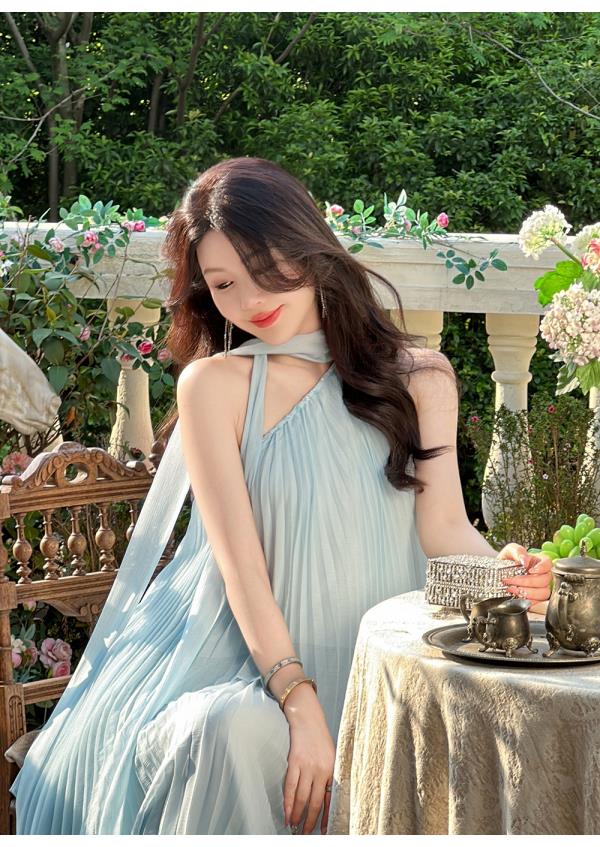 BeQueenStory【爱琴海风】法式立体压褶手工钉珠挂脖上衣&半裙套装