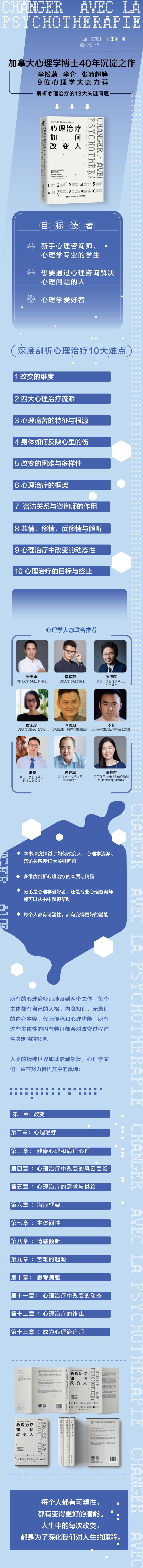 莫妮卡·布里永心理学博士。近40年来,她一直为儿童和成人进行心理治疗,并致力于对心理咨询师的培训和督导。界定心理治疗中推动改变进程的各个维度和因素,是莫妮卡博士从业以来一直关注的问题。