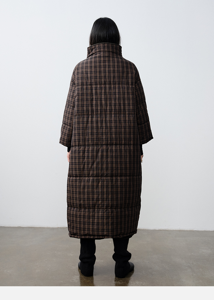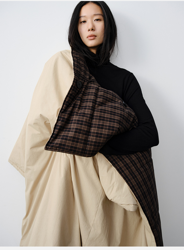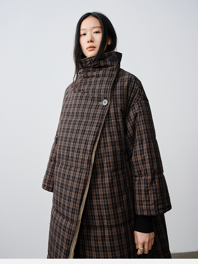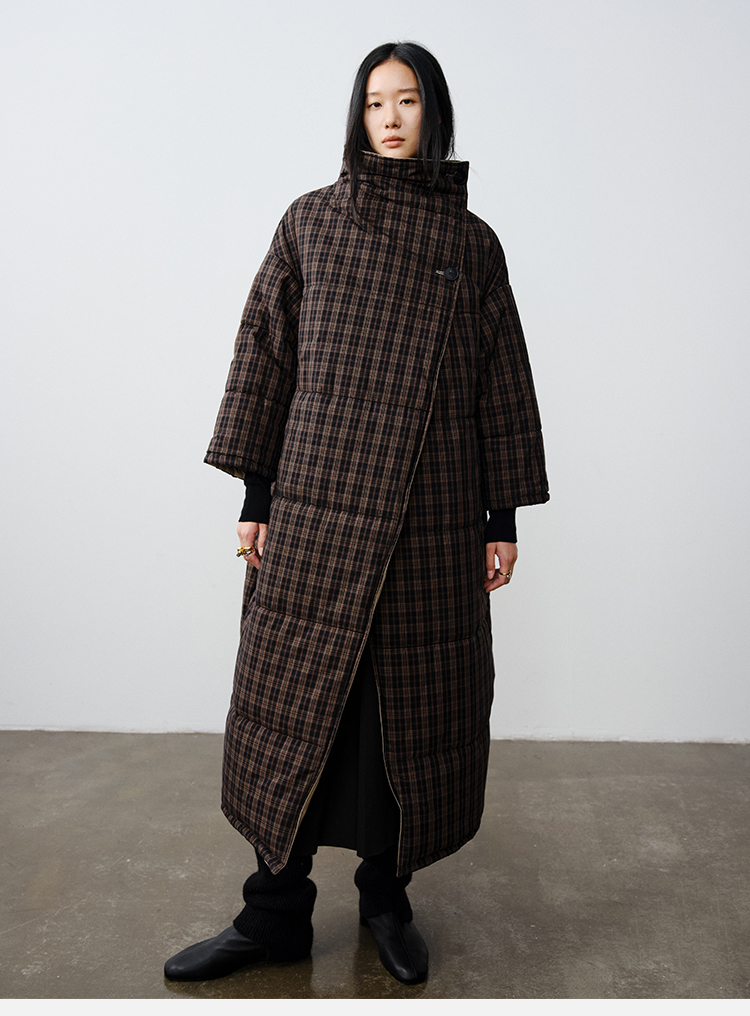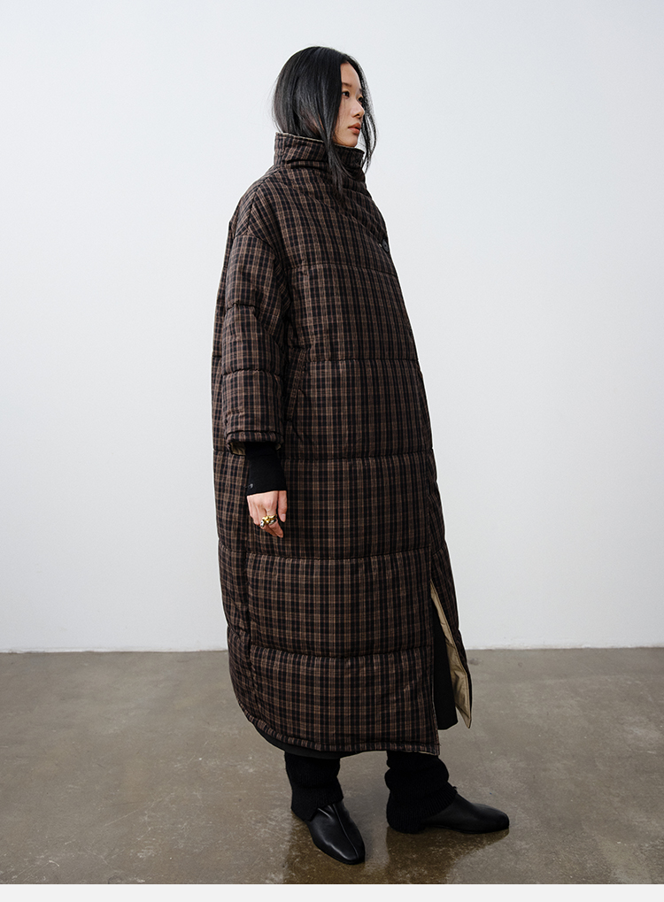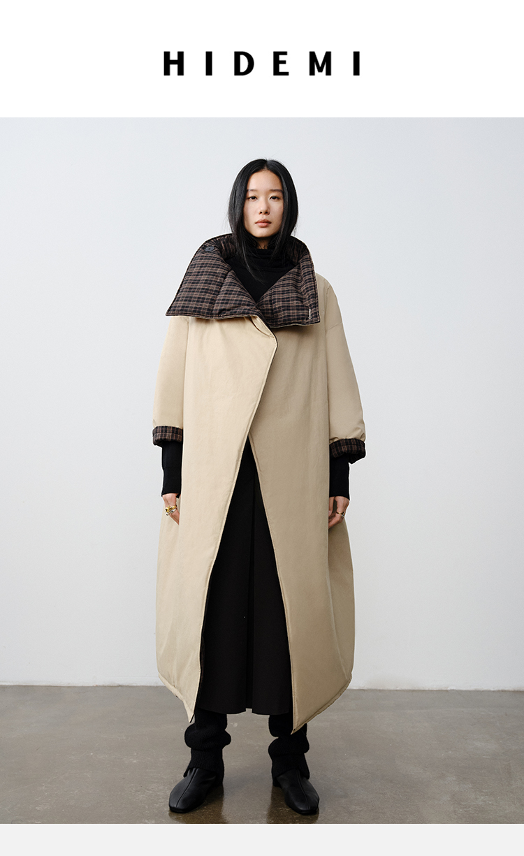 HIDEMI 格纹正反两面穿不对称极简oversize长款厚款大棉服保暖大衣