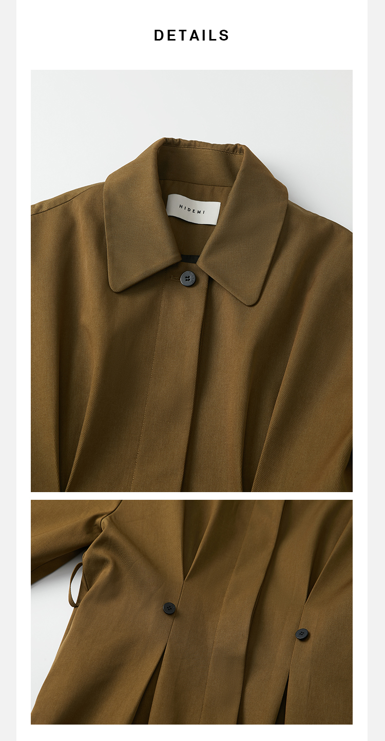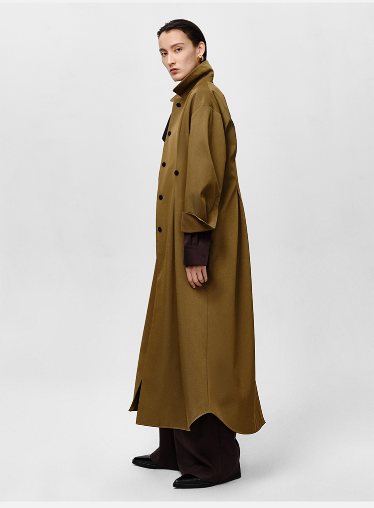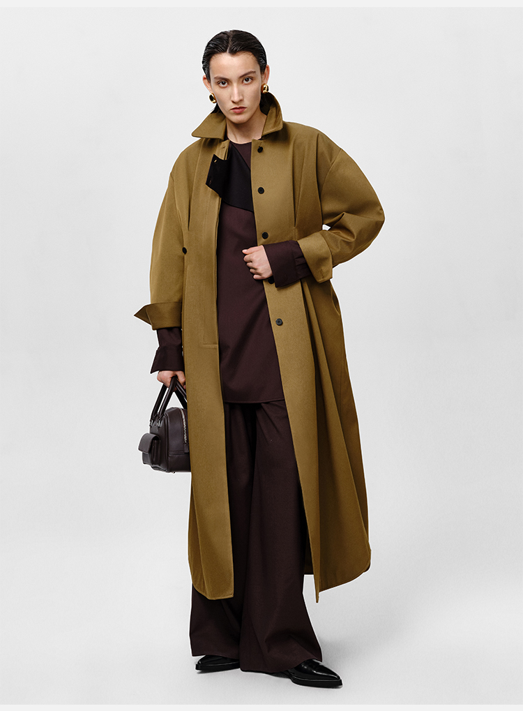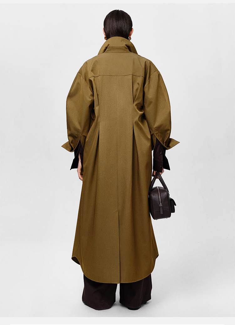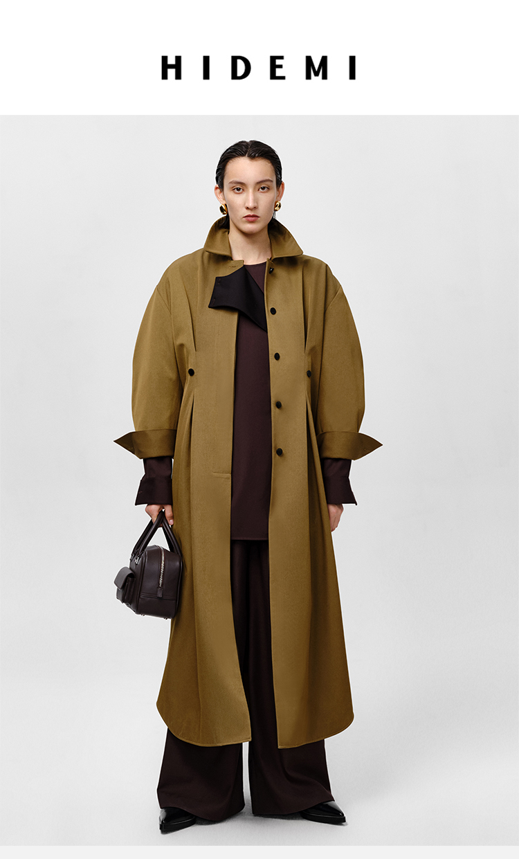 HIDEMI 军绿色斜纹廓形袖极简设计感纽扣腰带式长款风衣外套