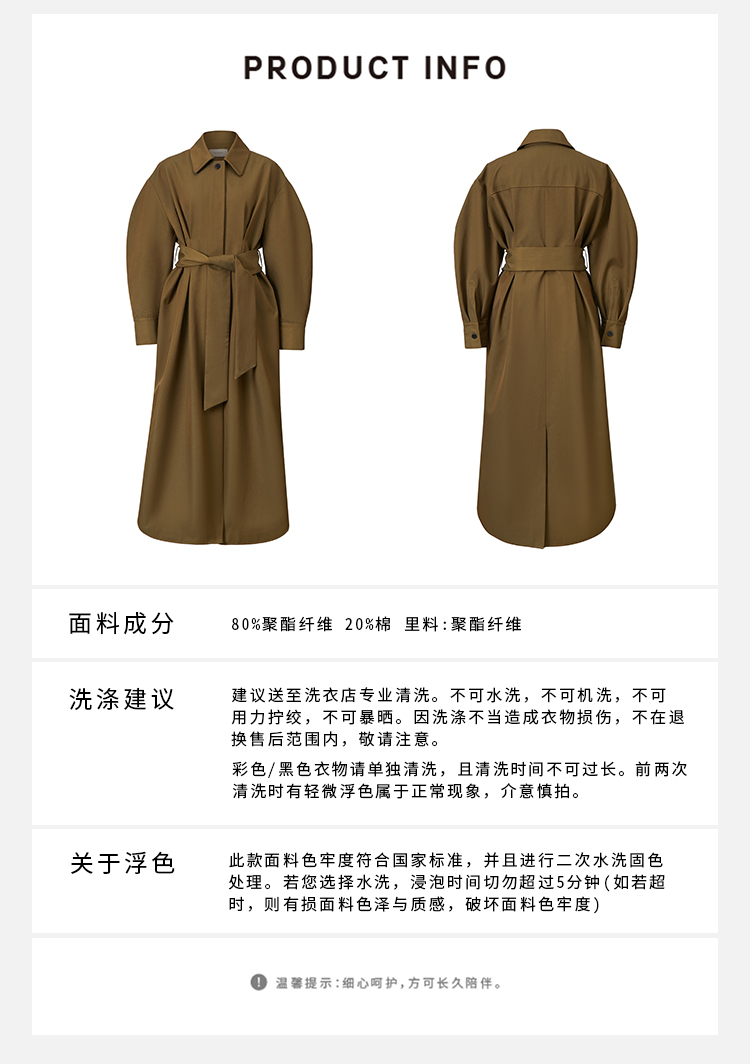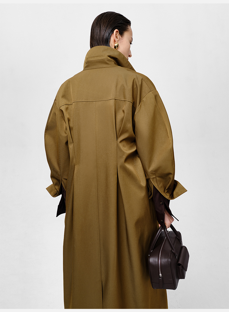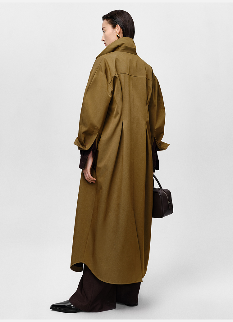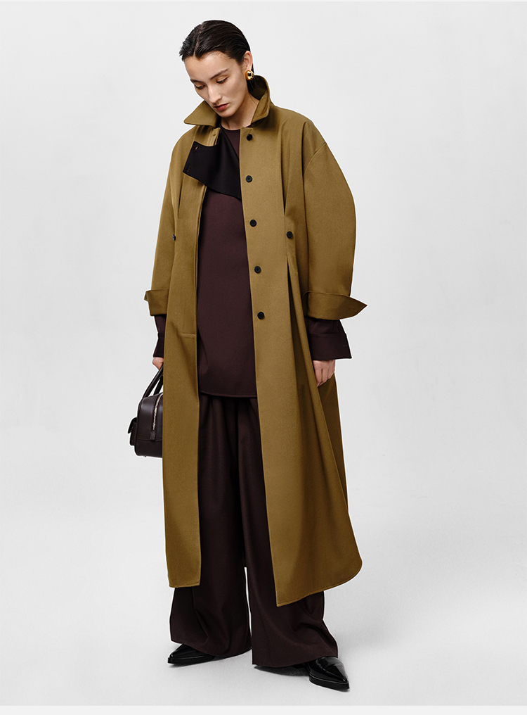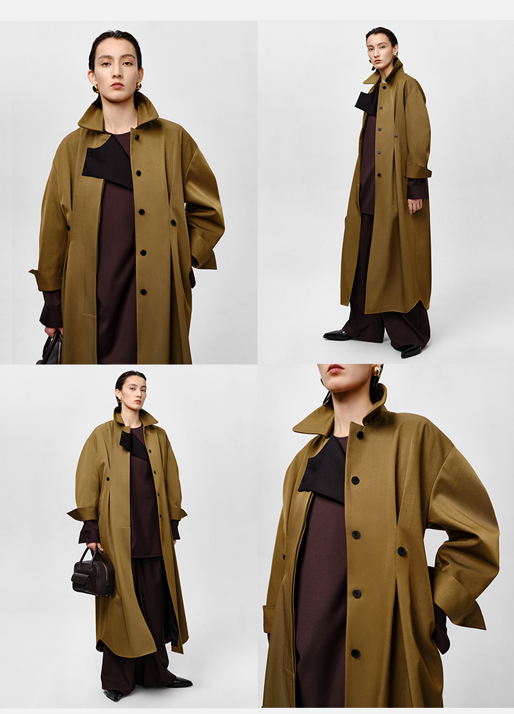 HIDEMI 军绿色斜纹廓形袖极简设计感纽扣腰带式长款风衣外套