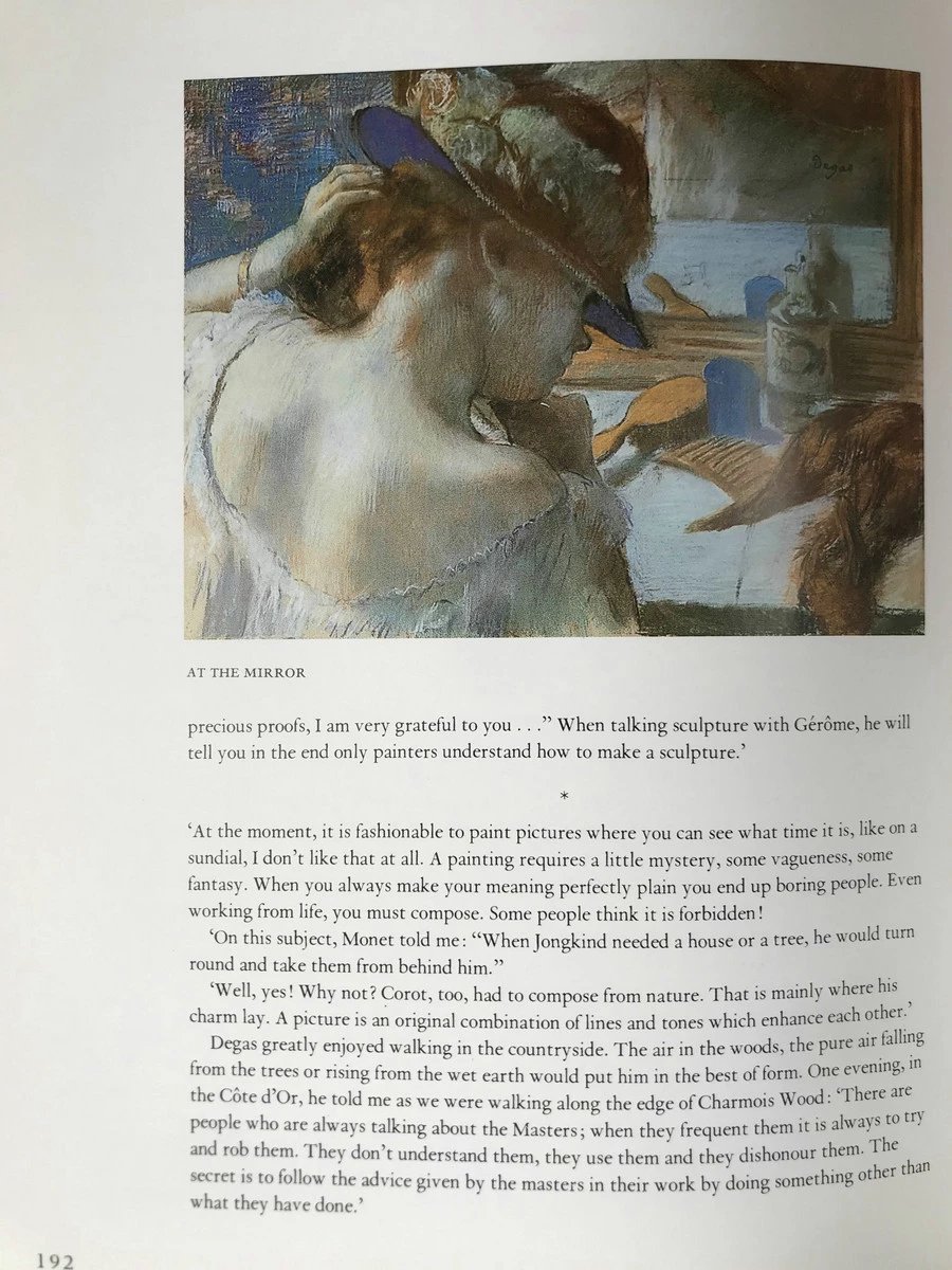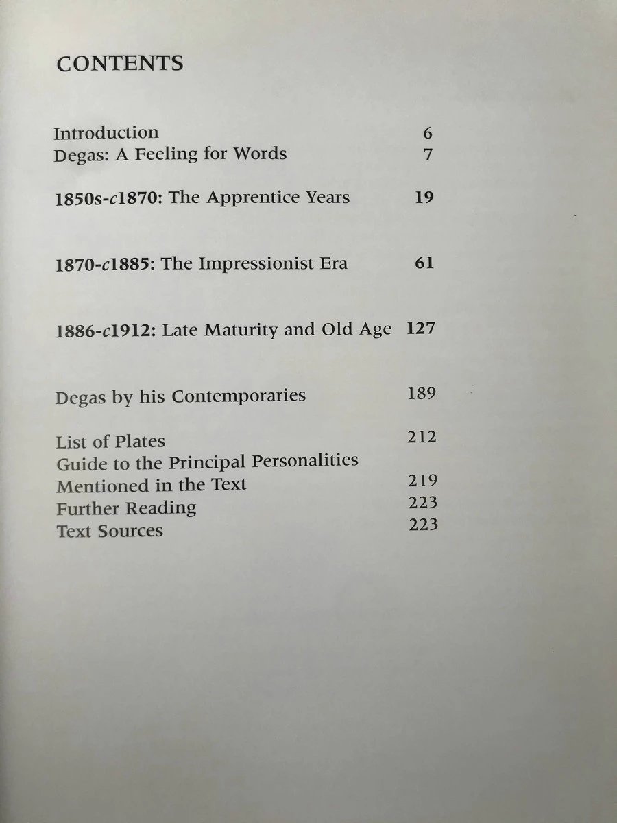 本书为德加的自选集,收录了德加最著名的画作和素描作品,还有一些不为人熟知的画作。这本书引用了一系列的资料——艺术家自己的笔记和信件,以及他亲密圈子里的轶事和回忆录。他的笔记和信件中,有给朋友和顾客的信,也有给印象派画展的参展商的紧急信件,还有他晚年一些黯然悲伤的心迹。是书这种将回忆和评论结合在一起的方式,令人意外地呈现出这位艺术家智慧、幽默的复杂魅力。