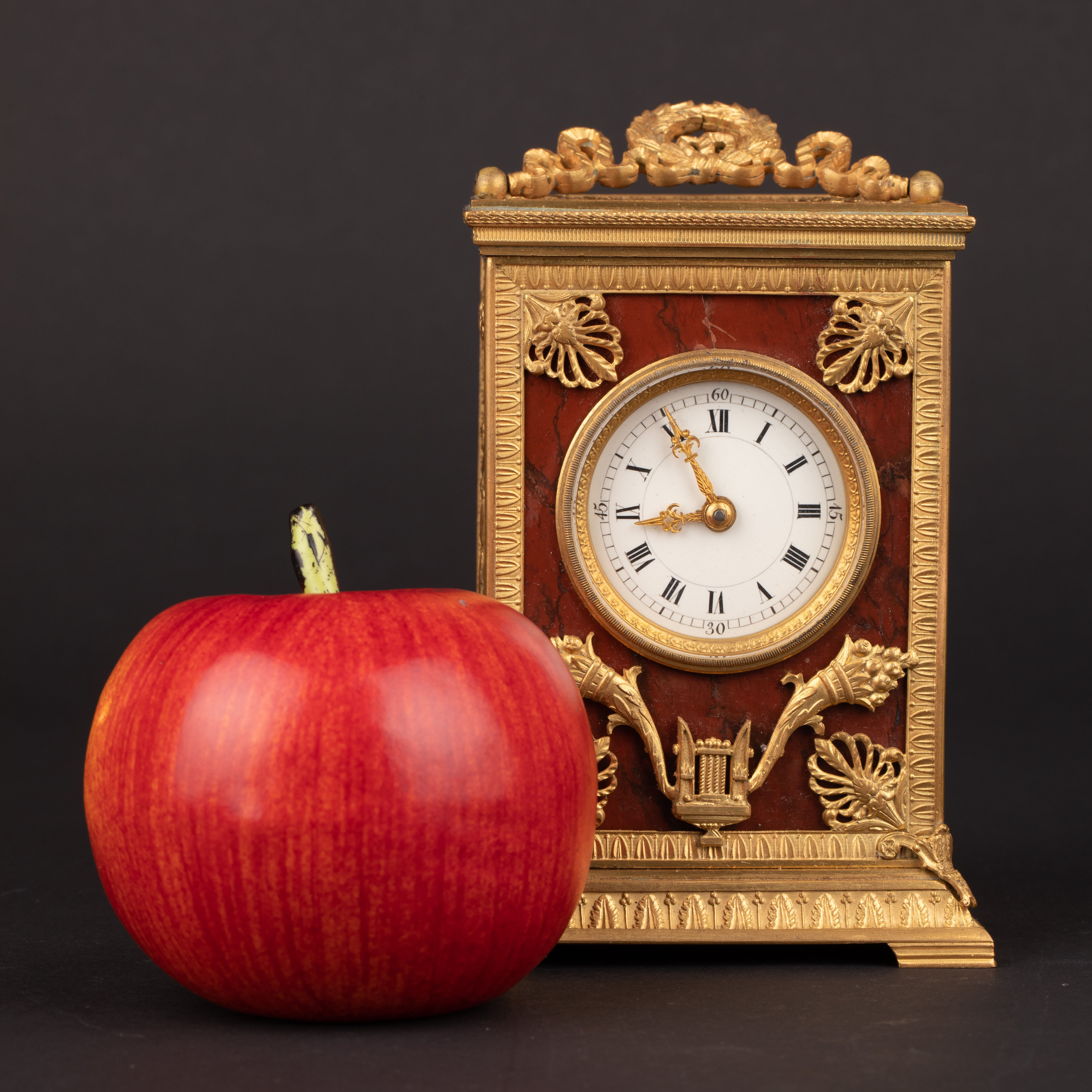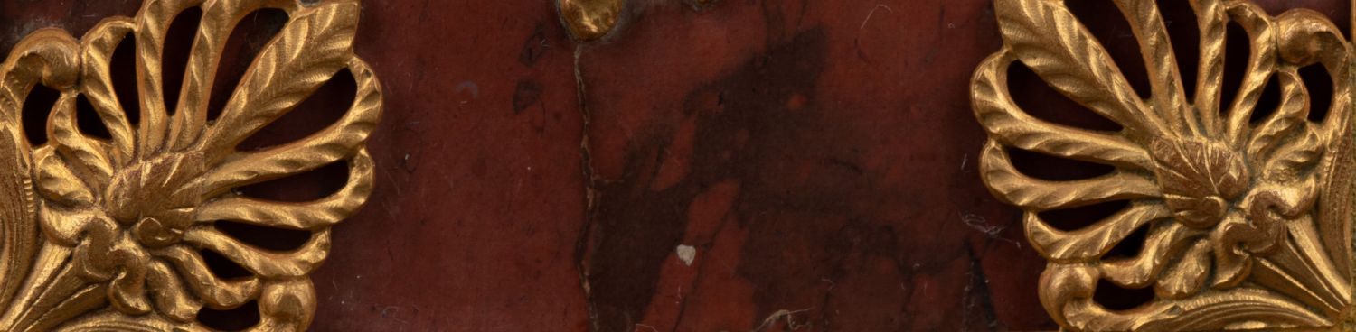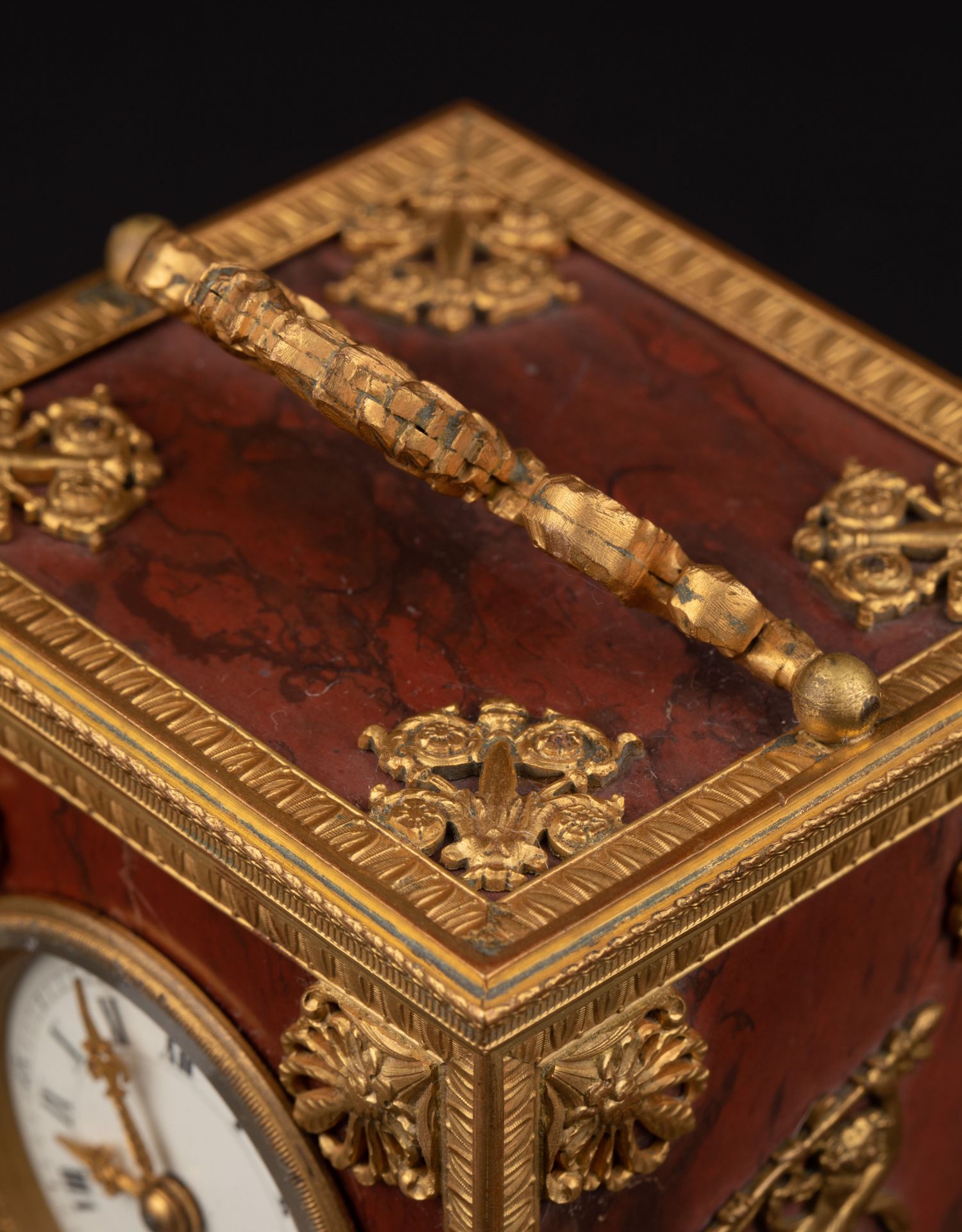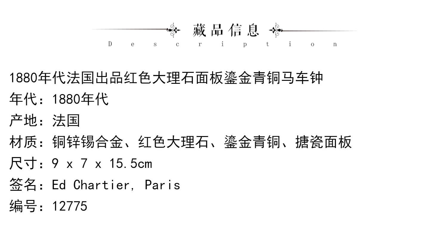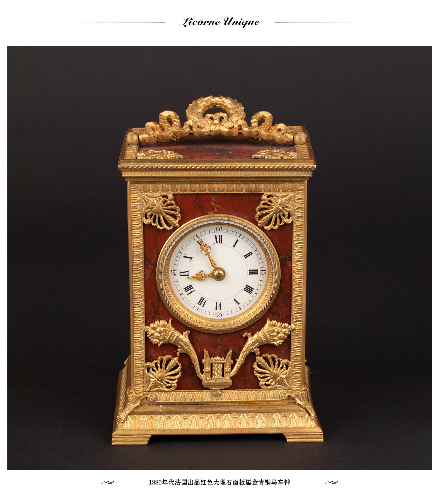 独角鹿西洋古董1880年代法国红色大理石面板鎏金青铜马车钟座钟