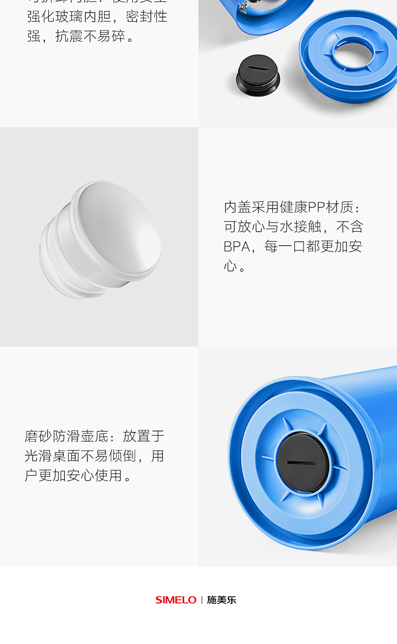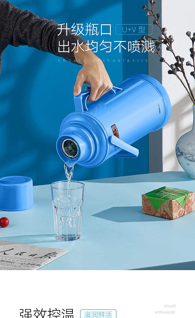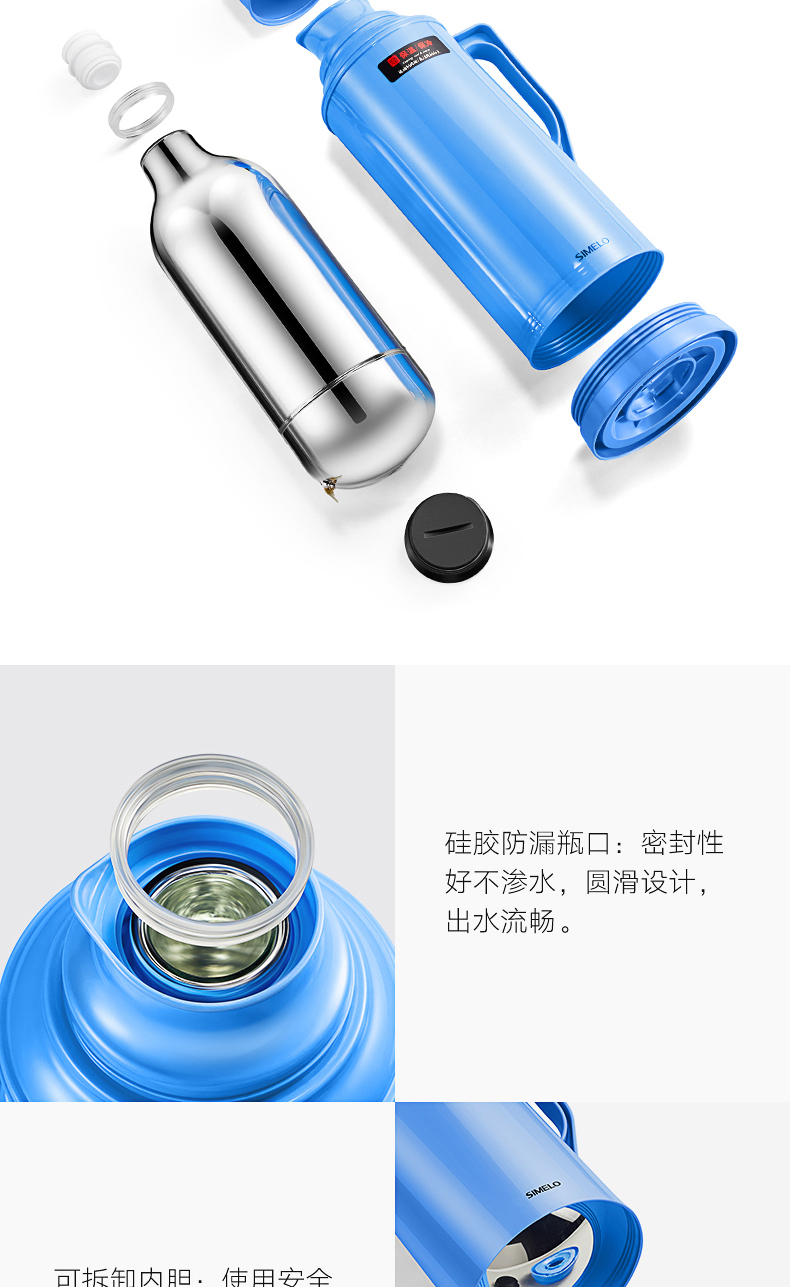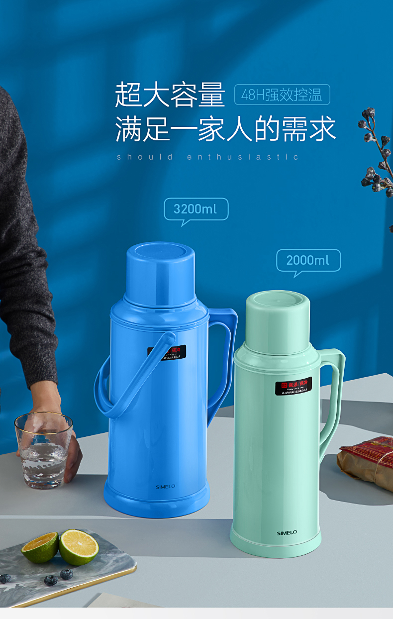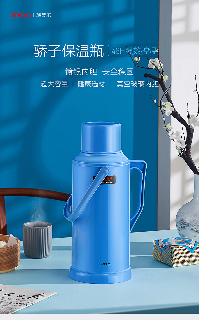SIMELO(施美乐)印象京都玻璃内胆72H骄子带木塞保温壶热水壶 保温瓶 开水瓶学生宿舍水壶2000ML(蓝色)