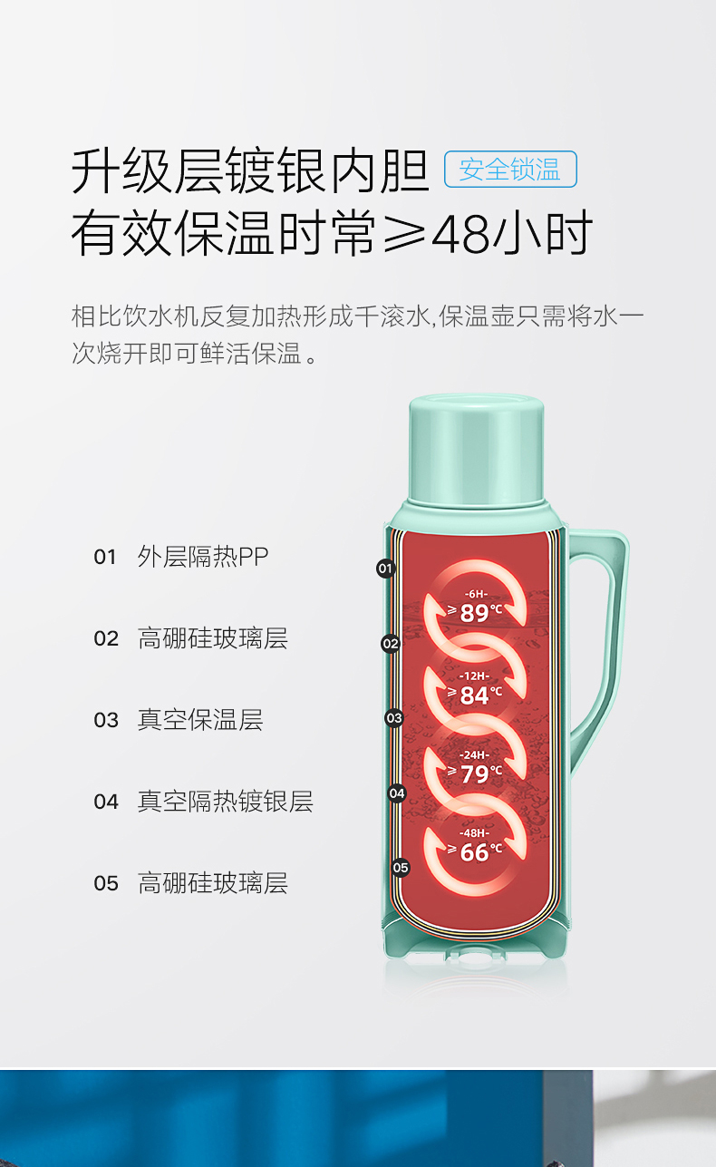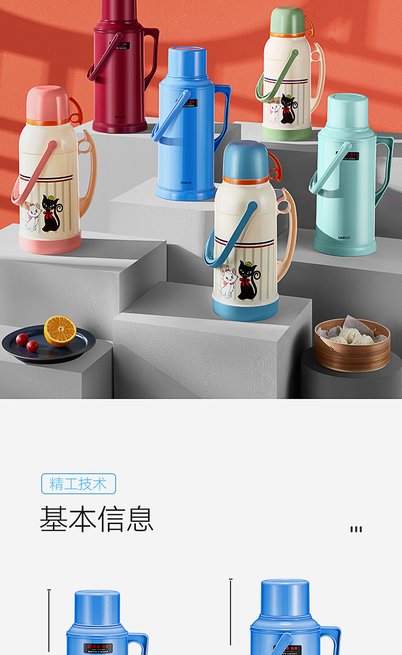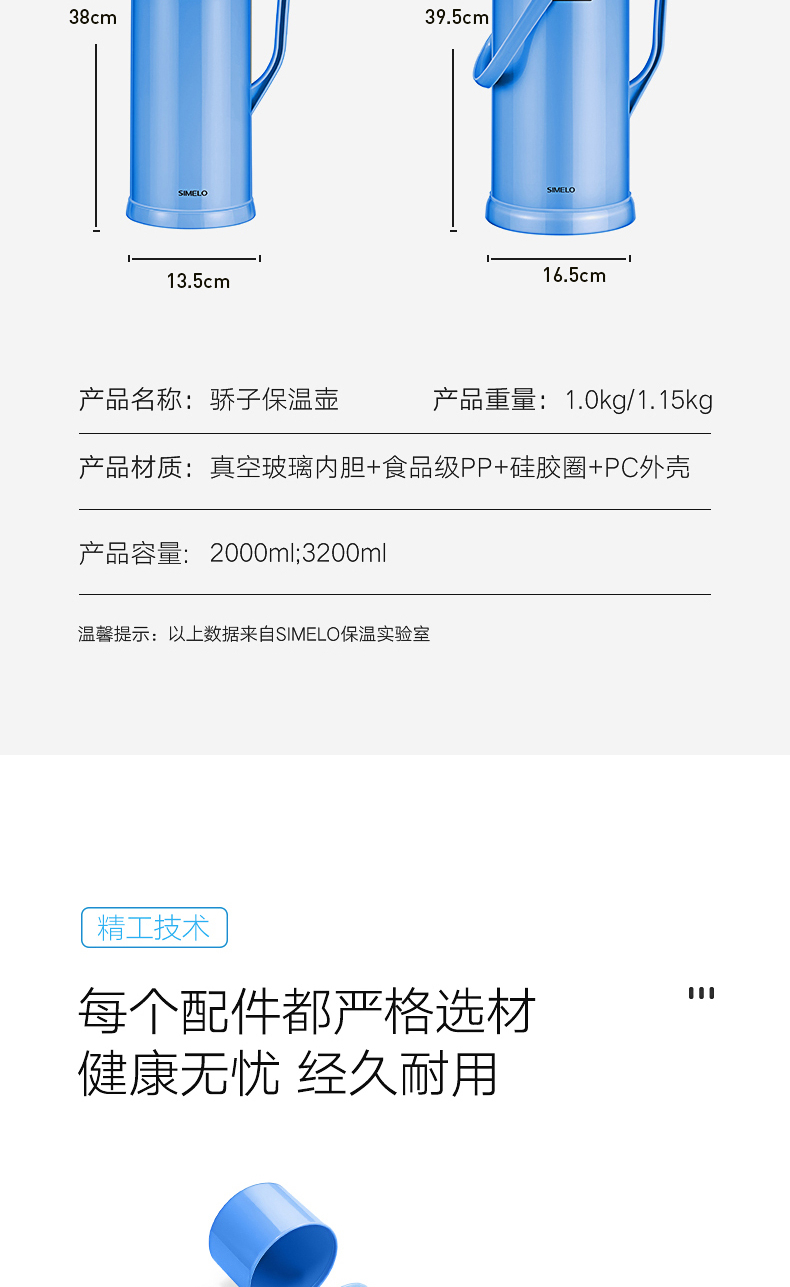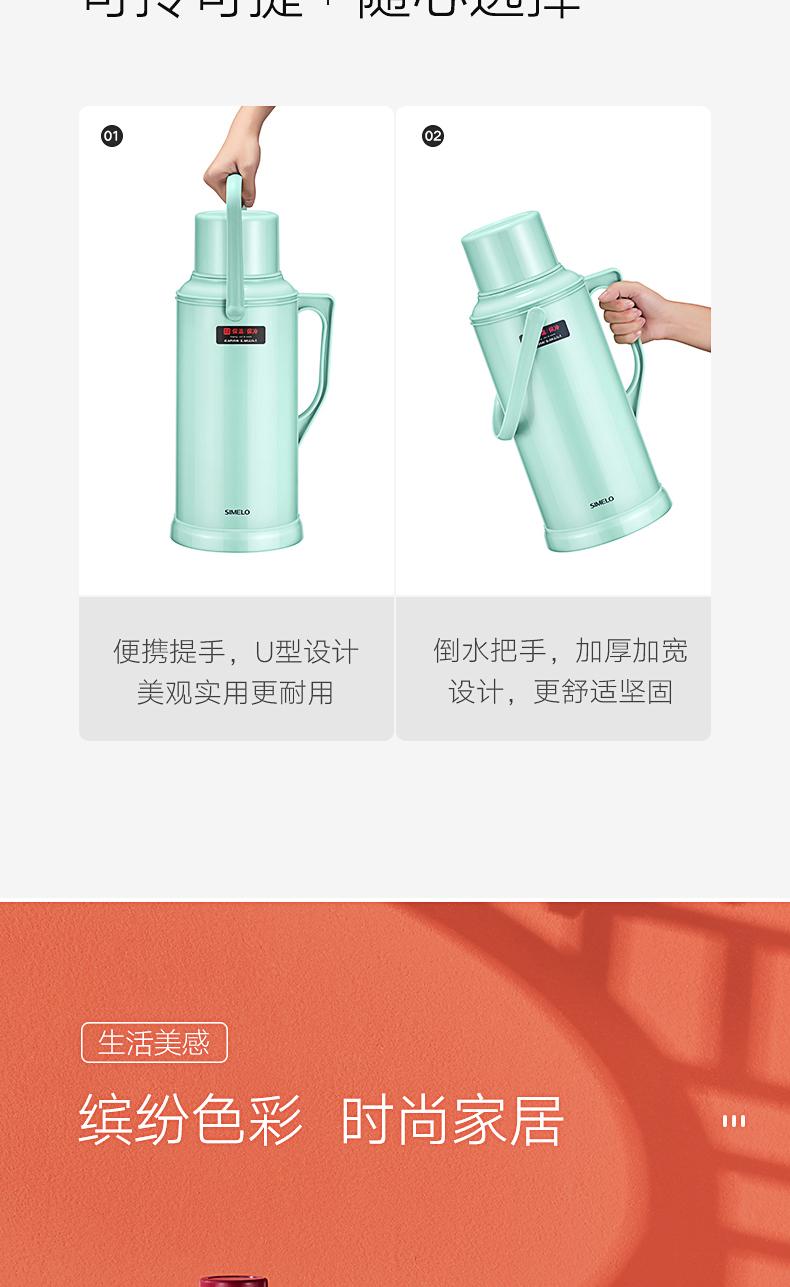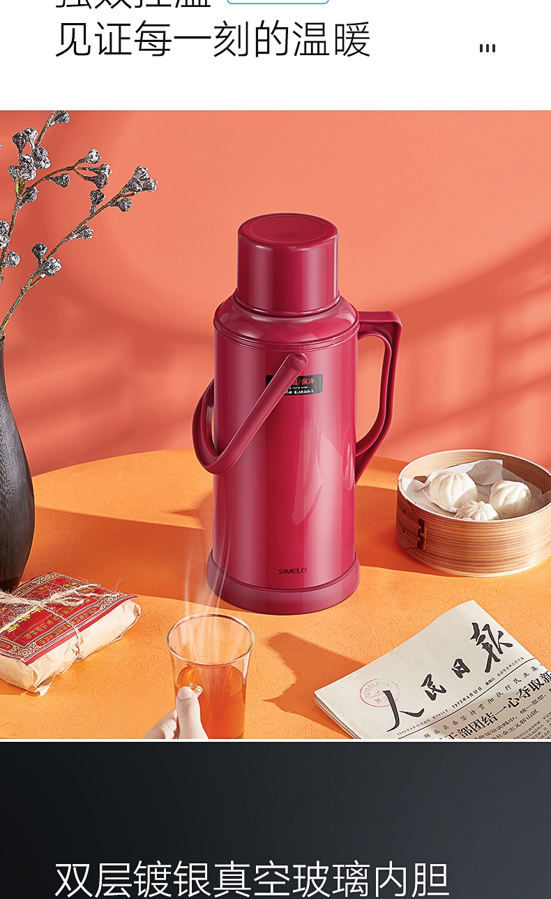 SIMELO(施美乐)印象京都玻璃内胆72H骄子带木塞保温壶热水壶 保温瓶 开水瓶学生宿舍水壶2000ML(蓝色)