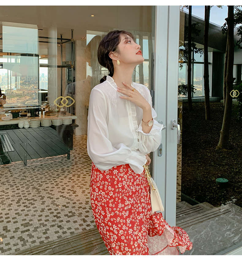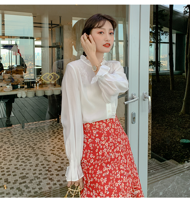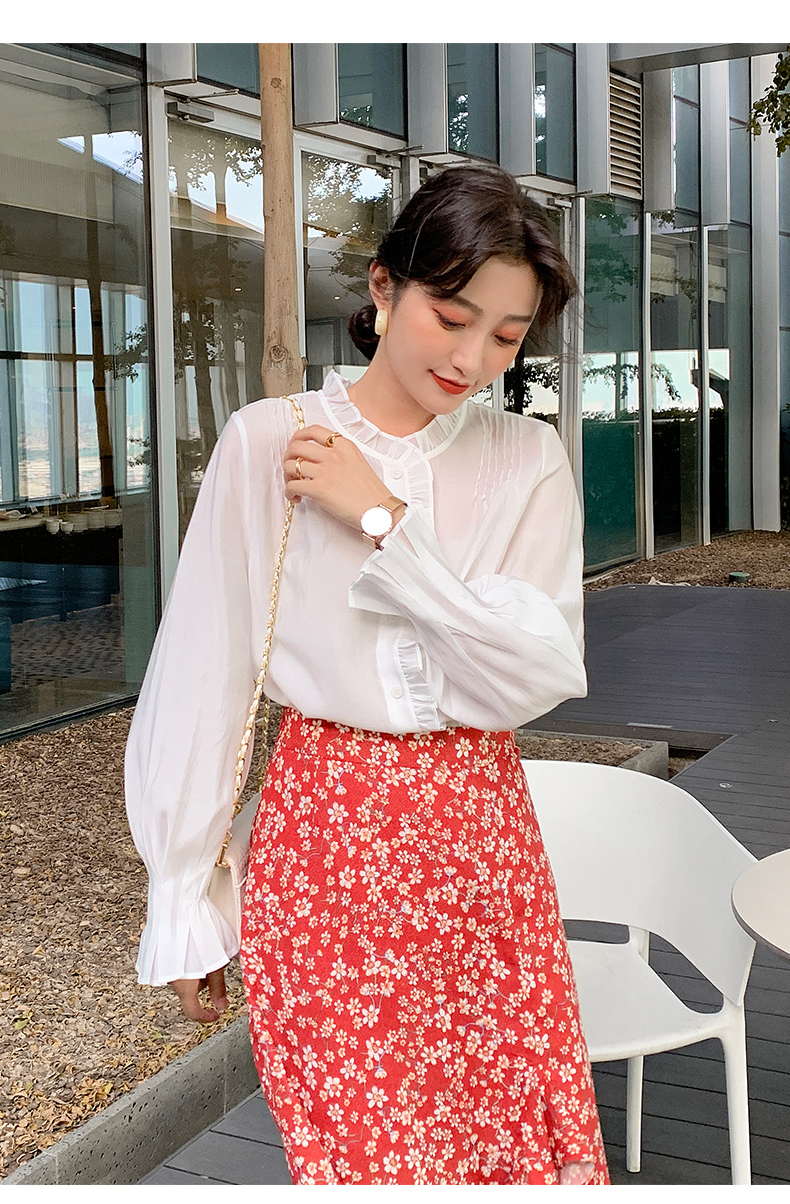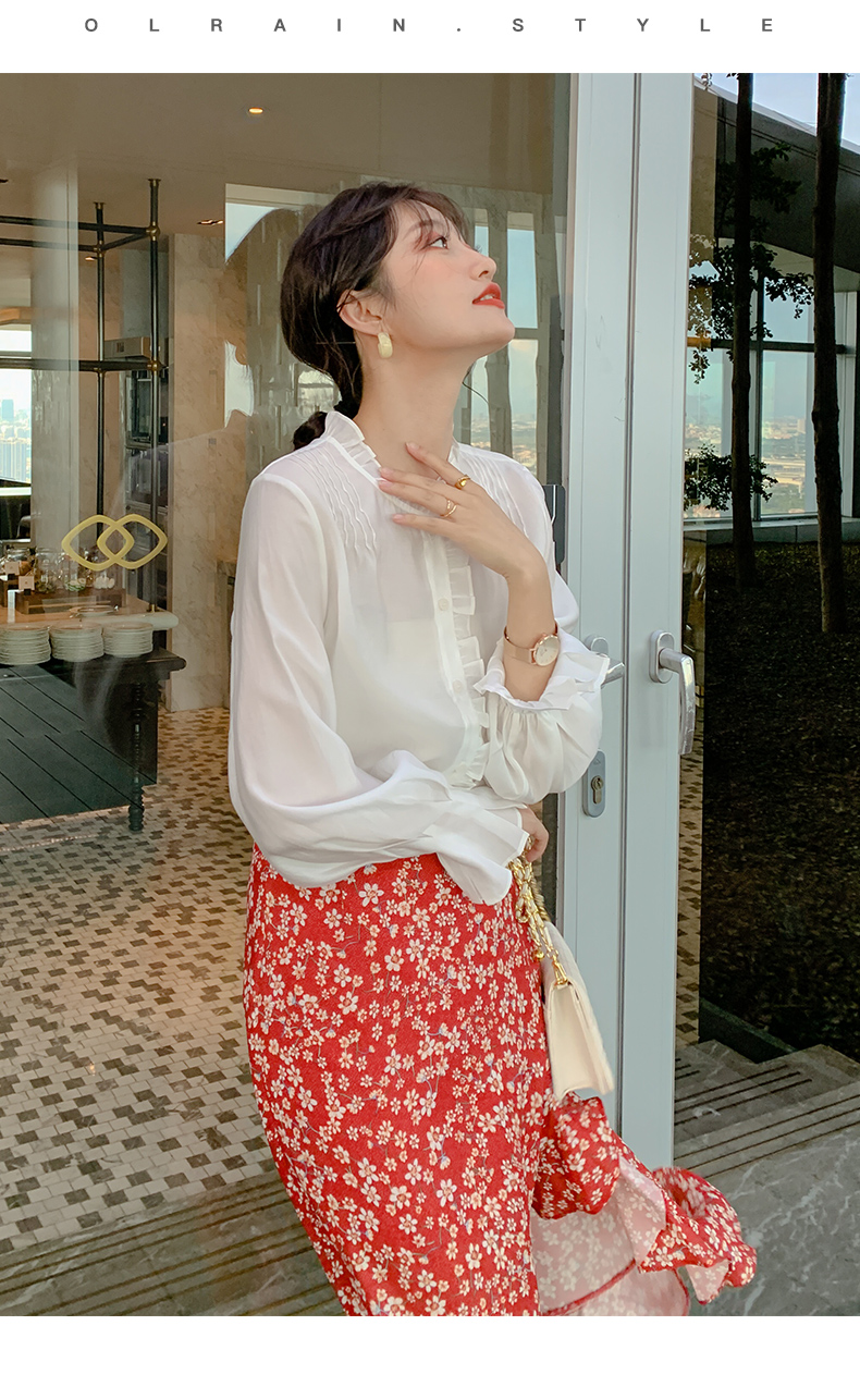 肩部捏褶设计,配合宽松喇叭袖袖型,