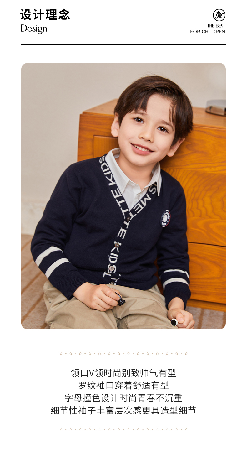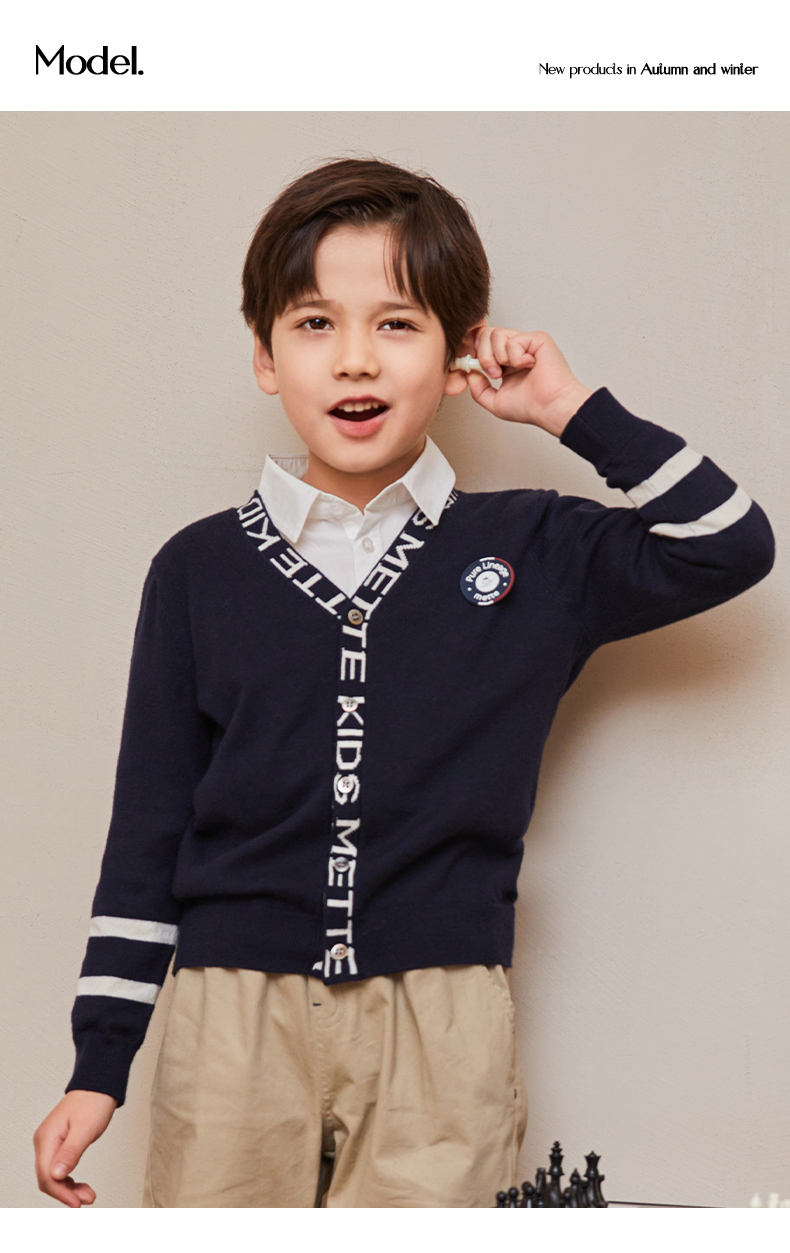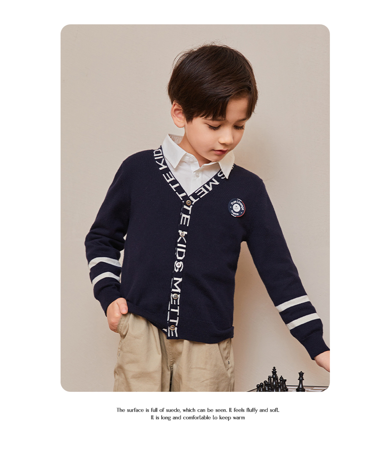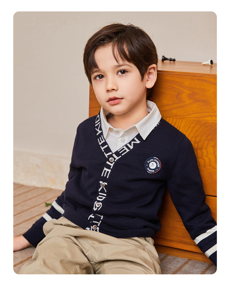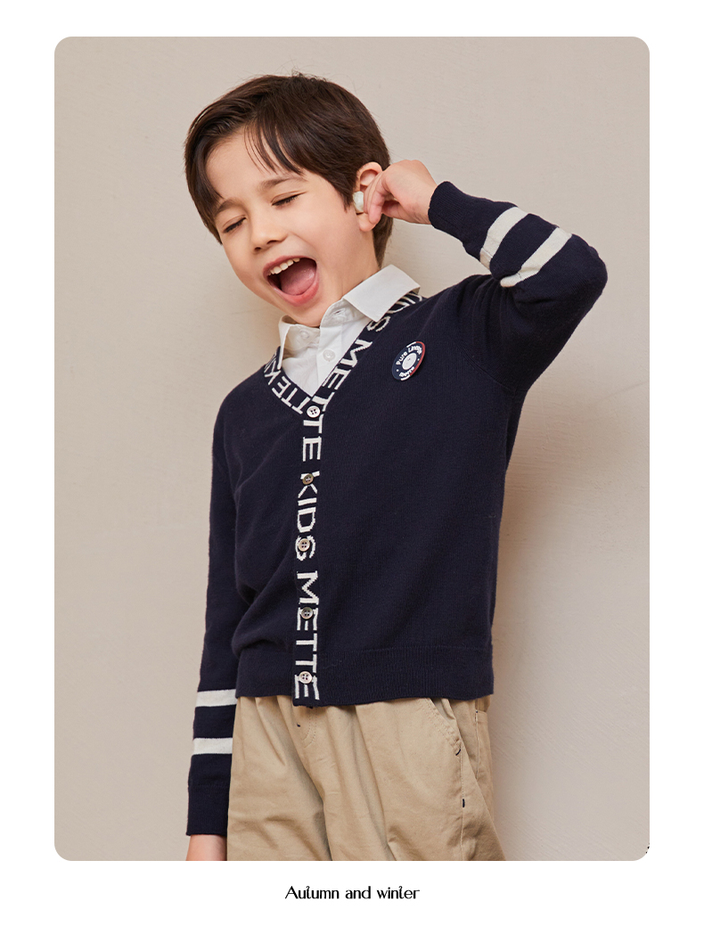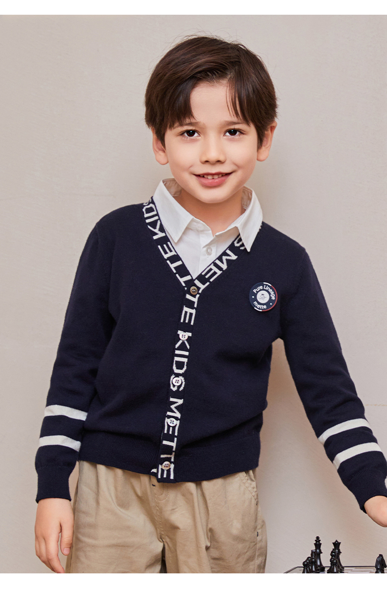 mettekids儿童毛衣春秋新款学院风童装中大男童V领休闲针织开衫