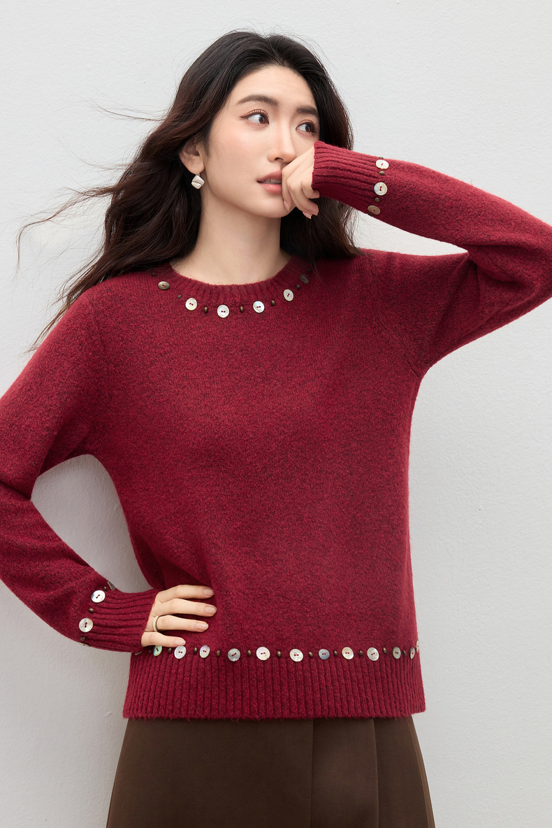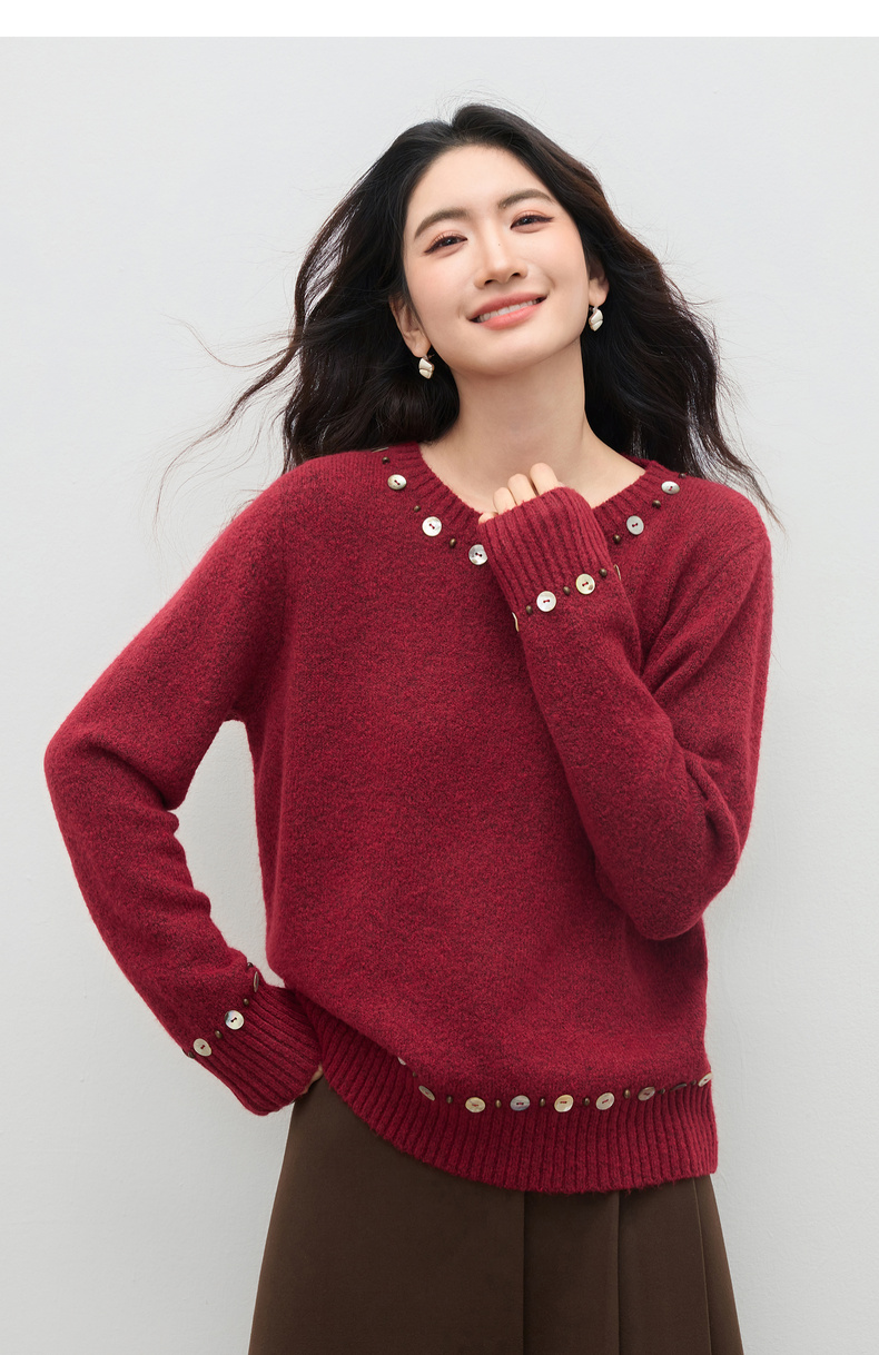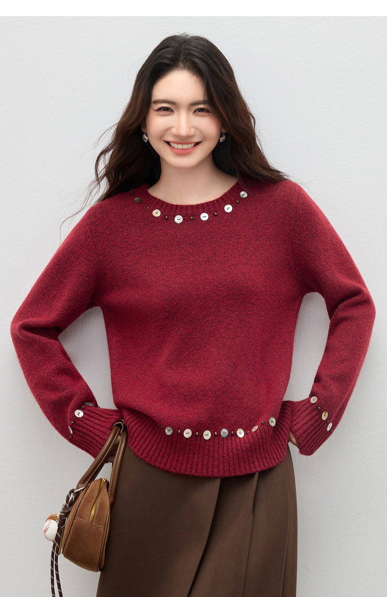 【内购】【手工钉珠+珠光贝壳】简约通勤圆领宽松落肩厚保暖百花绒毛衣-W54EE3858