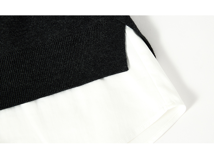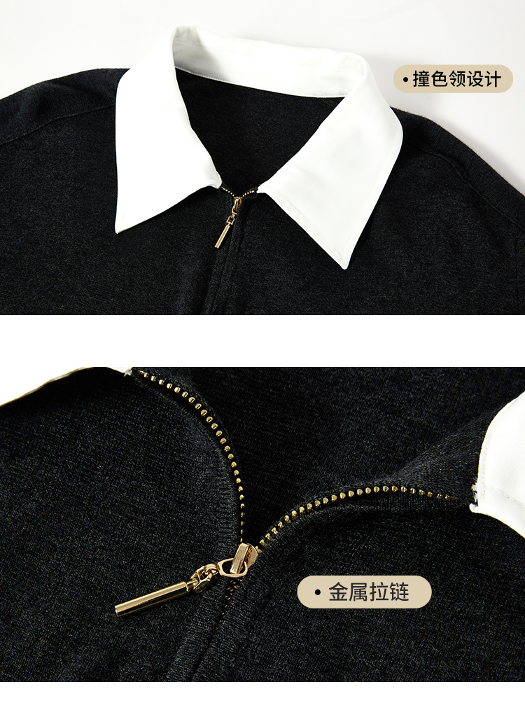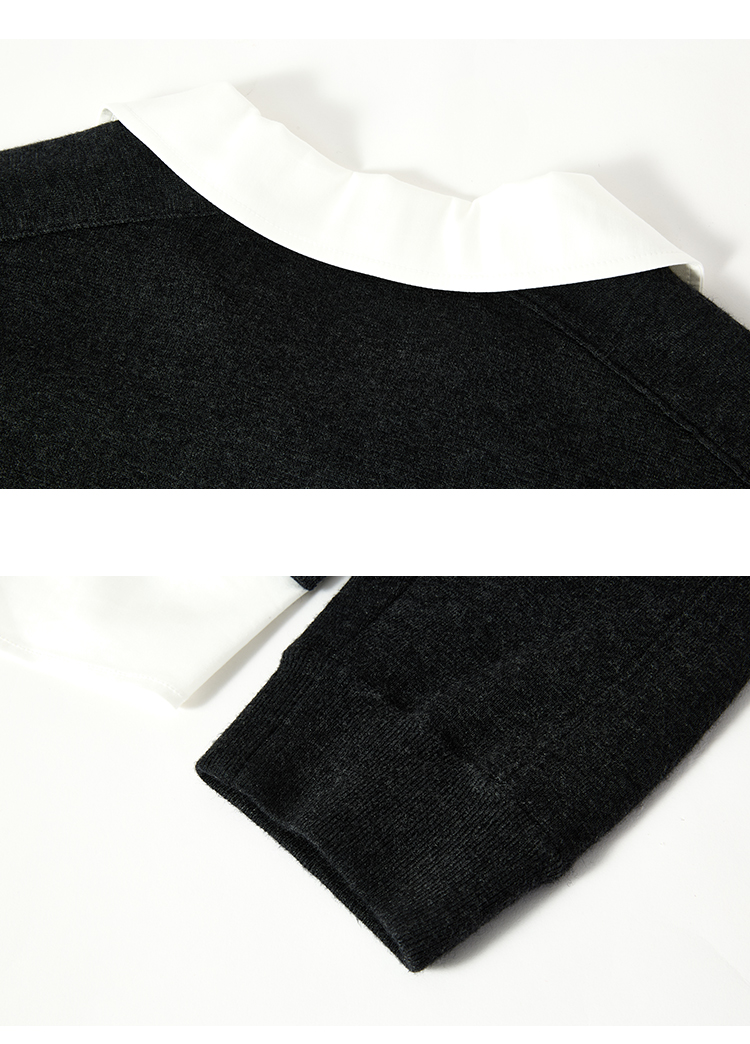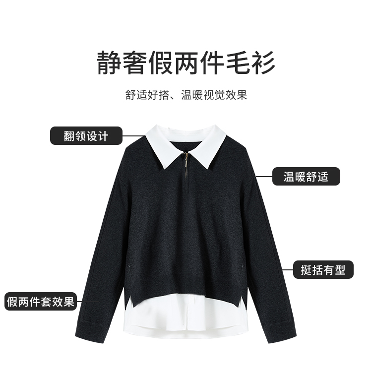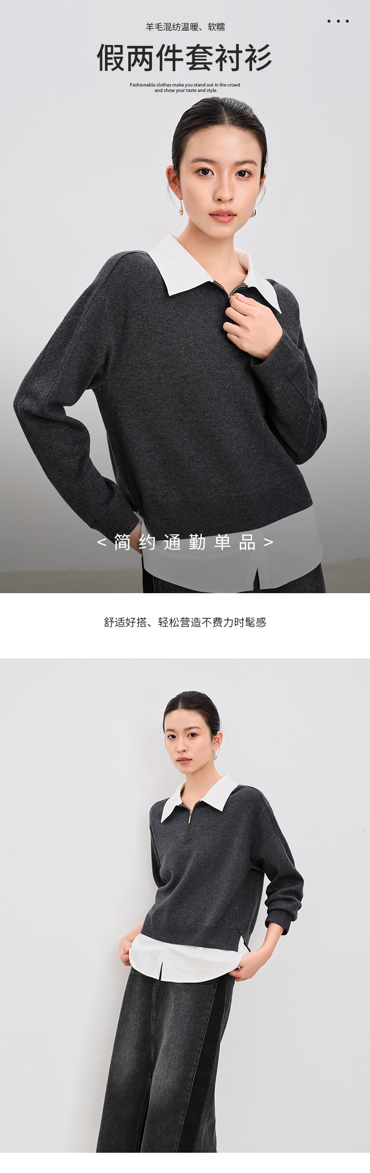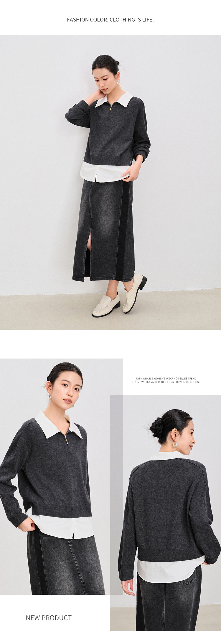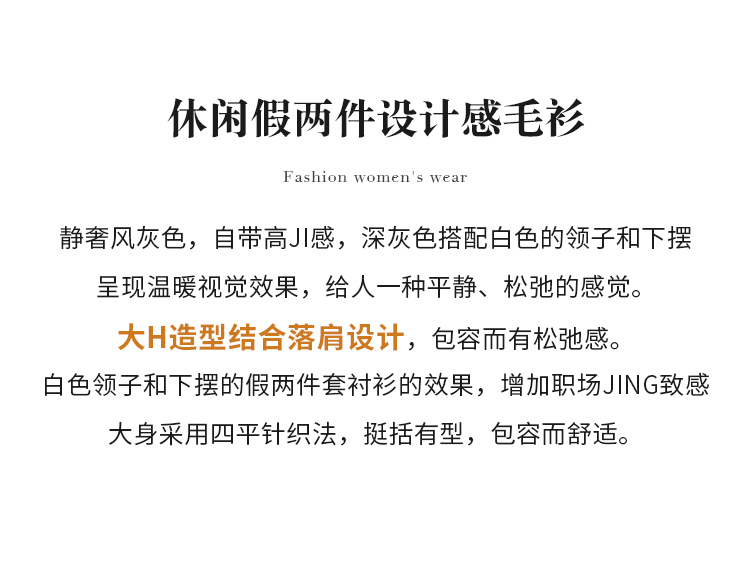 【商场同款】CNQ4864“静奢假两件” 感深灰色 拼接白色领子和下摆 大H身型 落肩袖 包容有松弛感 通勤假两件毛衣