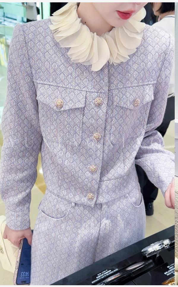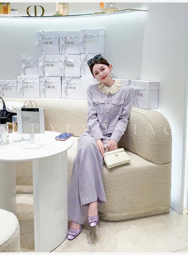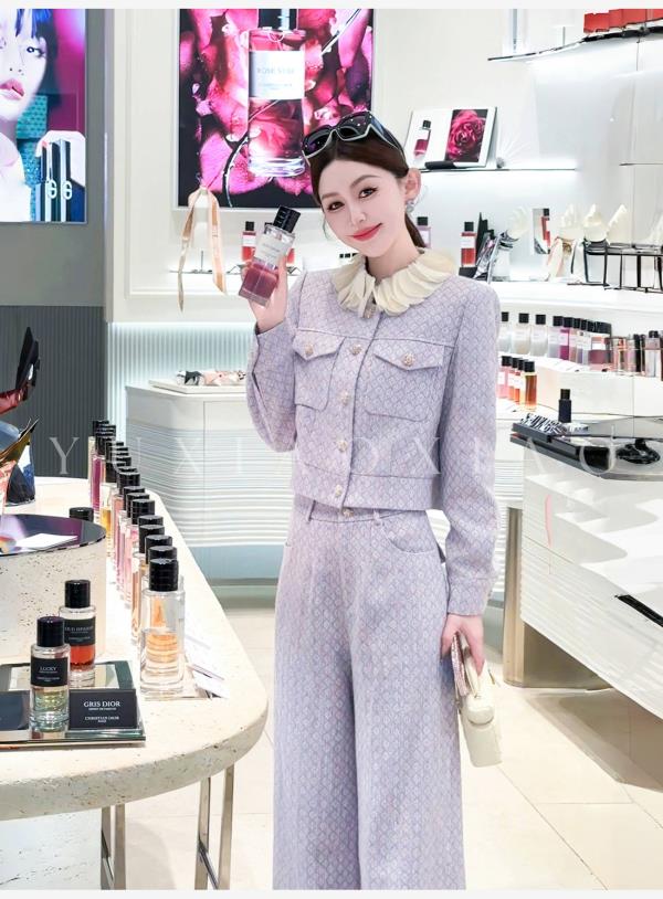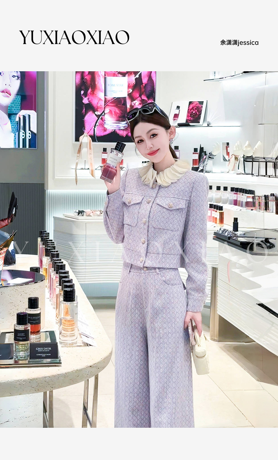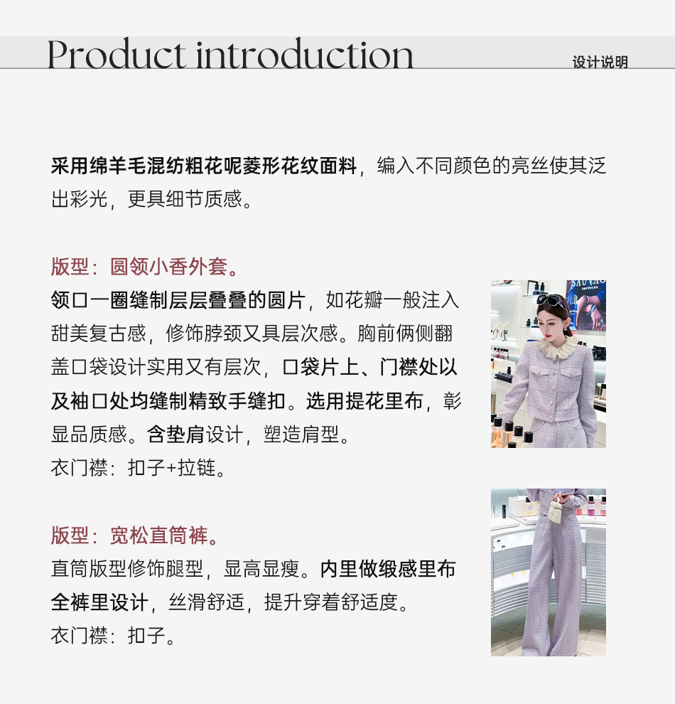 余潇潇【高智千金】绵羊毛混纺粗花呢菱形花纹小香外套&宽松直筒裤