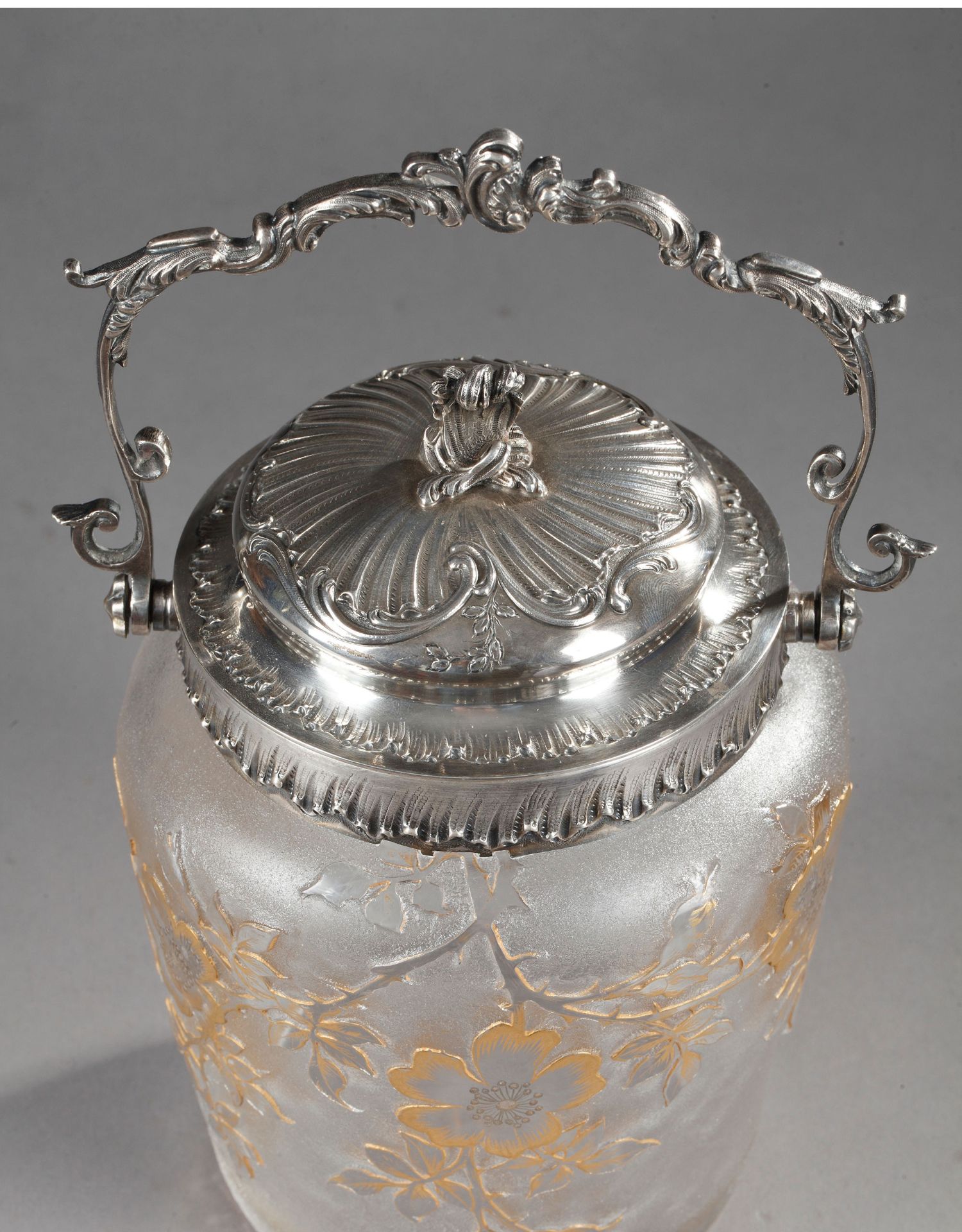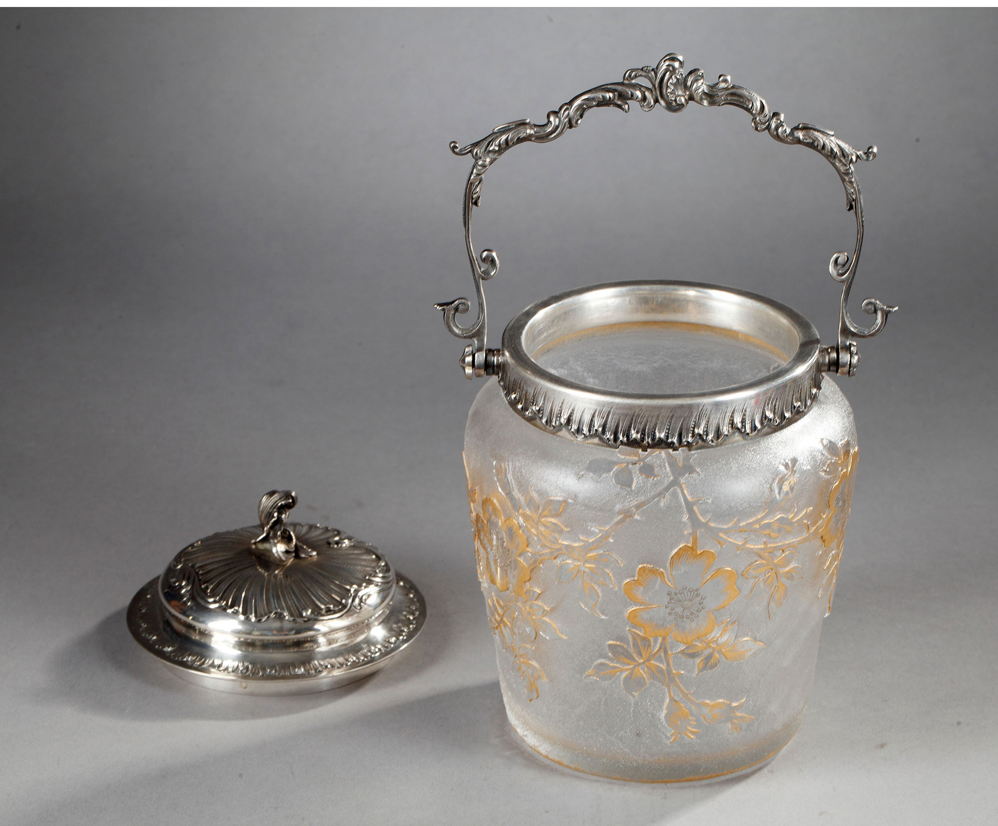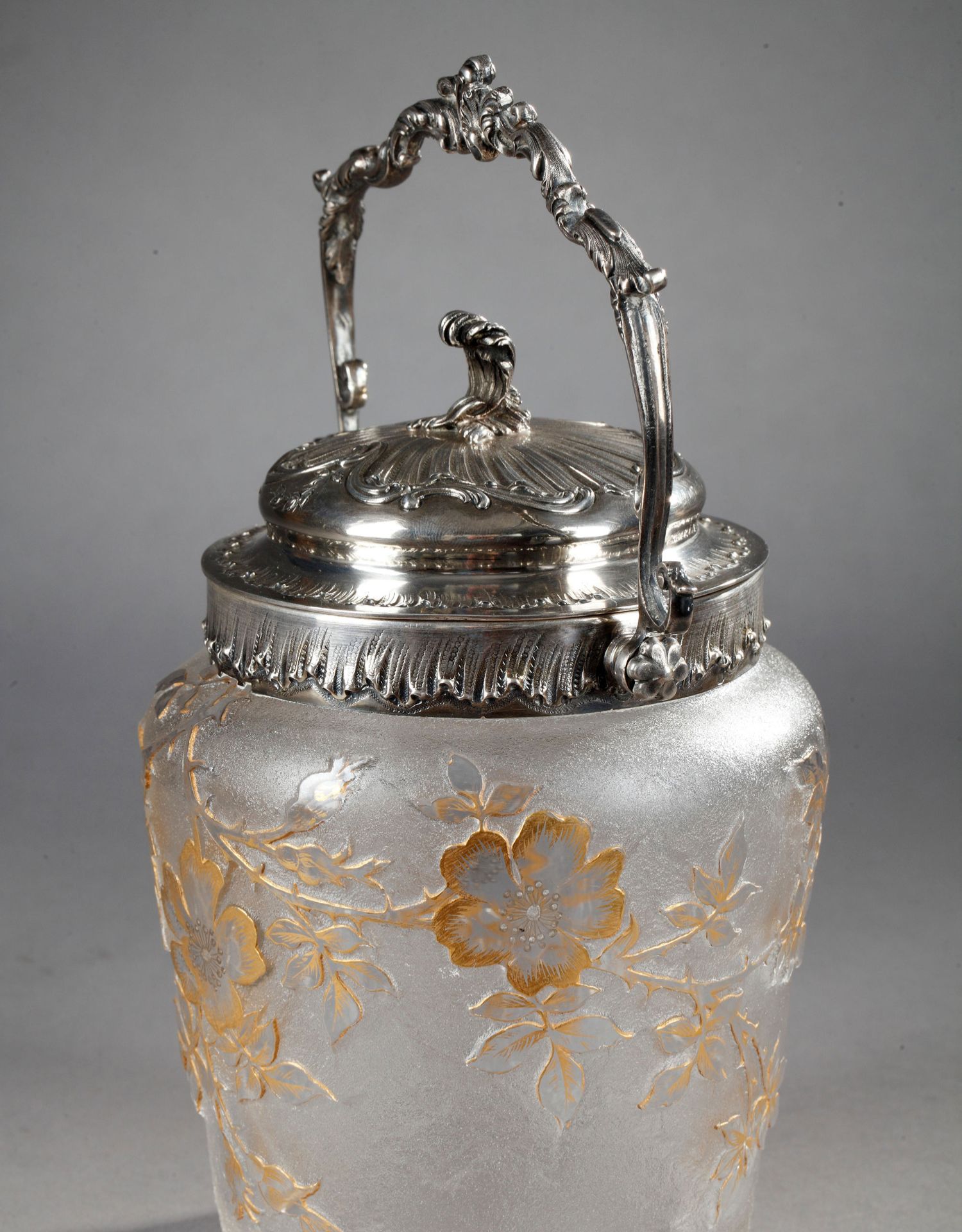 独角鹿西洋古董南锡派签名犬蔷薇蚀刻轮刻描金雕饰磨砂水晶饼干桶